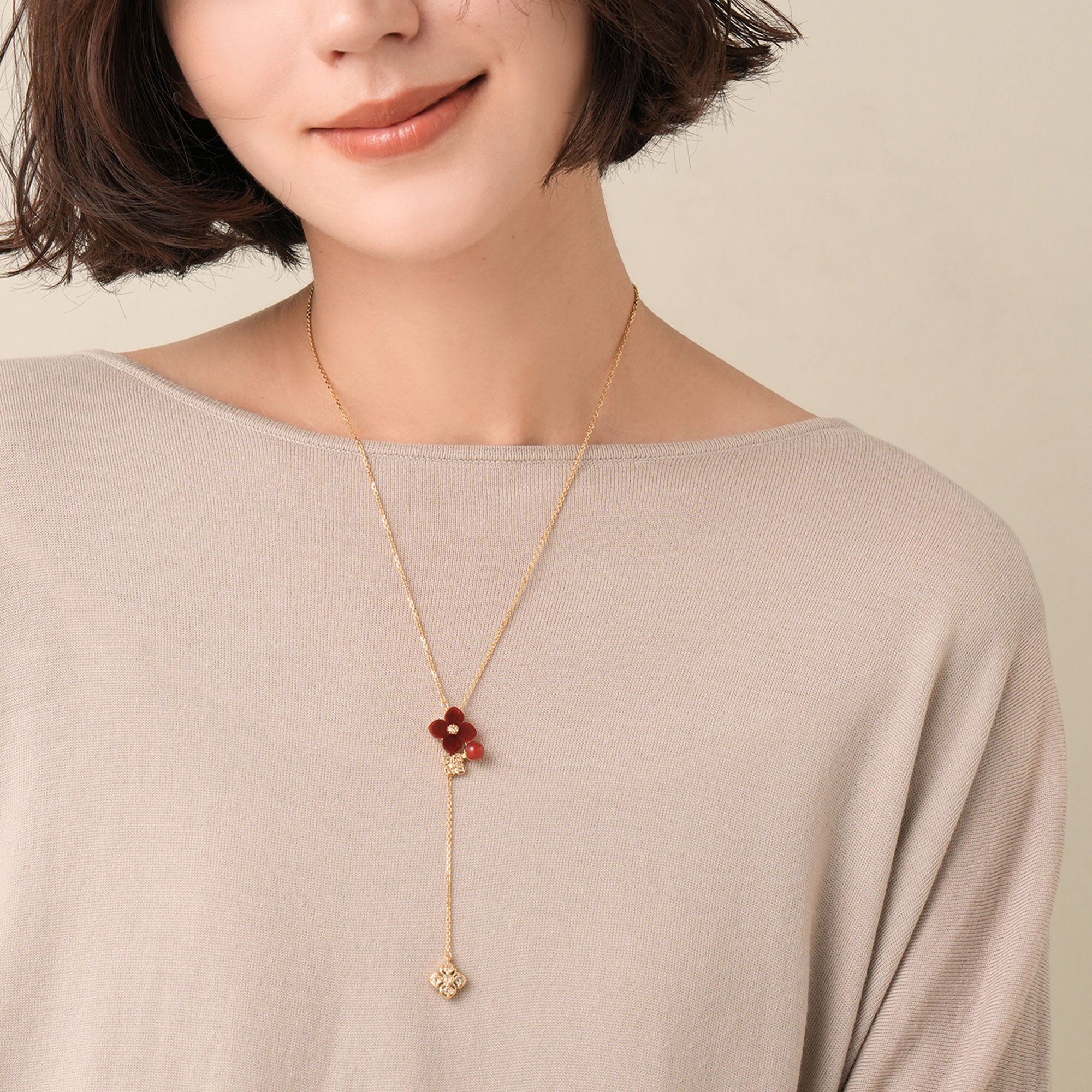 天然石ならではのニュアンスあるレッドカラーが、フラワーモチーフの甘さをマイルドにし、大人エレガントな雰囲気を演出。