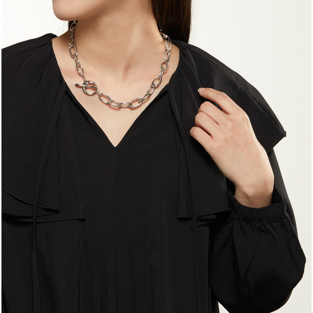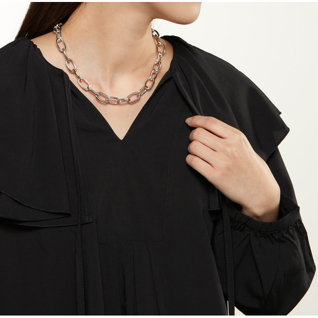 モダンなチェーンネックレス。程よいボリューム感でデコルテをクールに演出します。マンテル金具を前に持ってきてコーディネートのポイントにも。これ1本でトレンド感溢れるスタイリングになります。