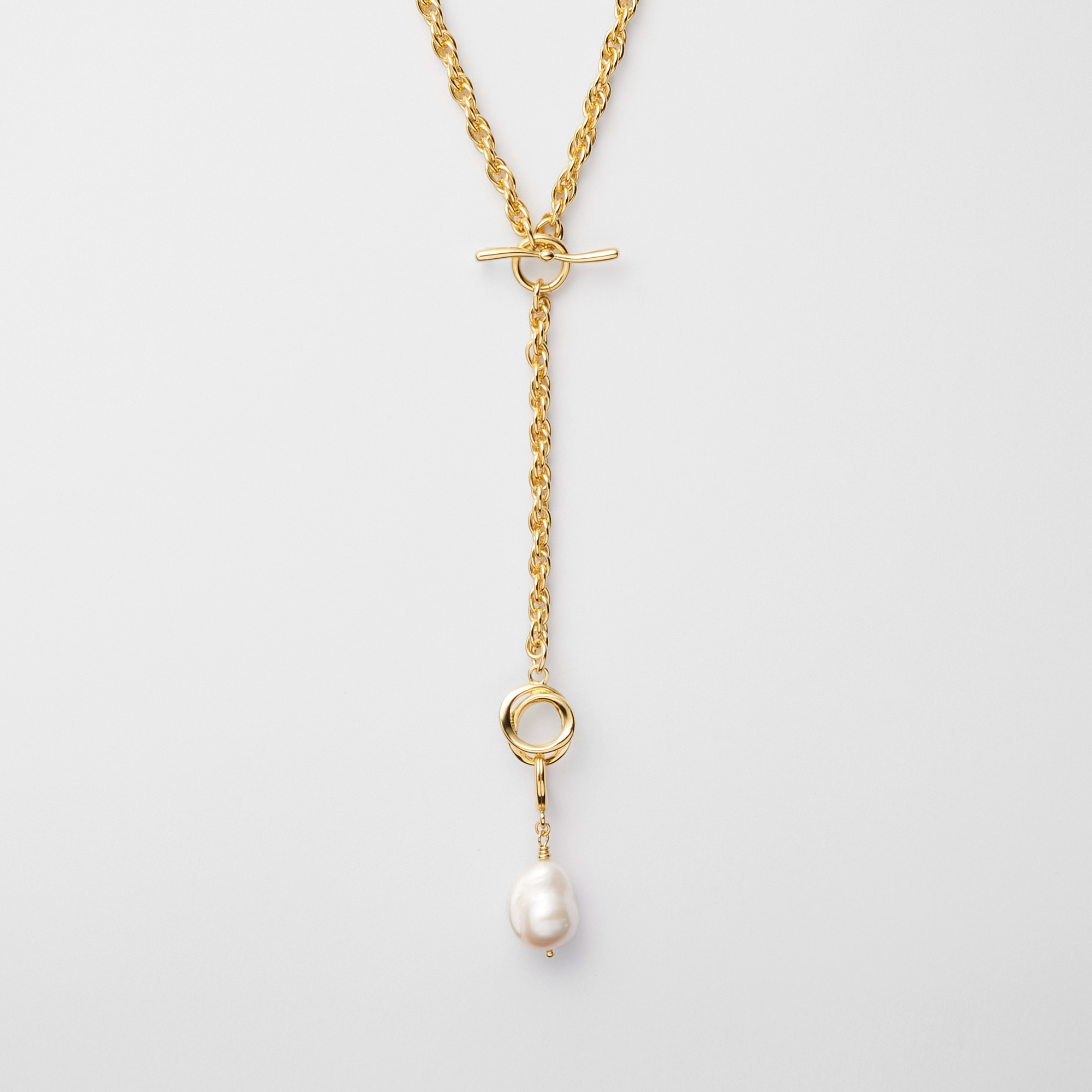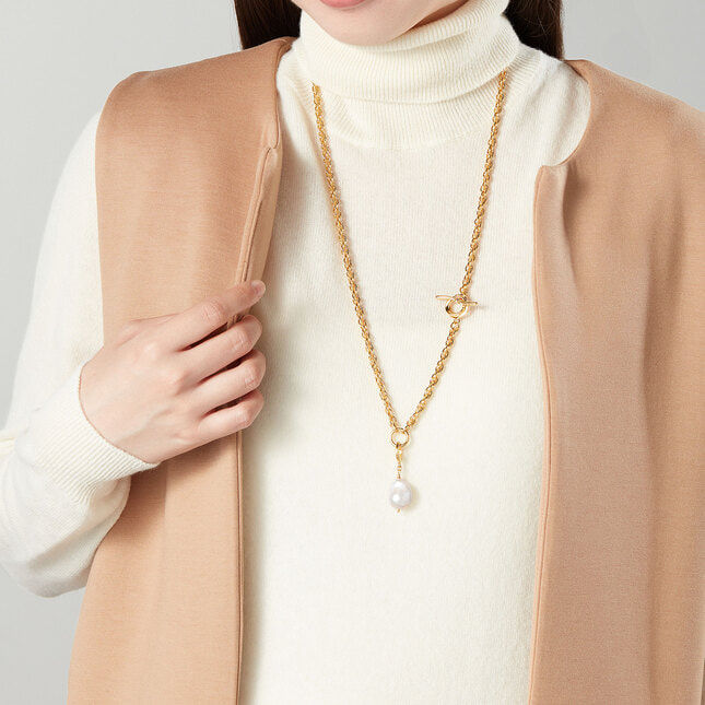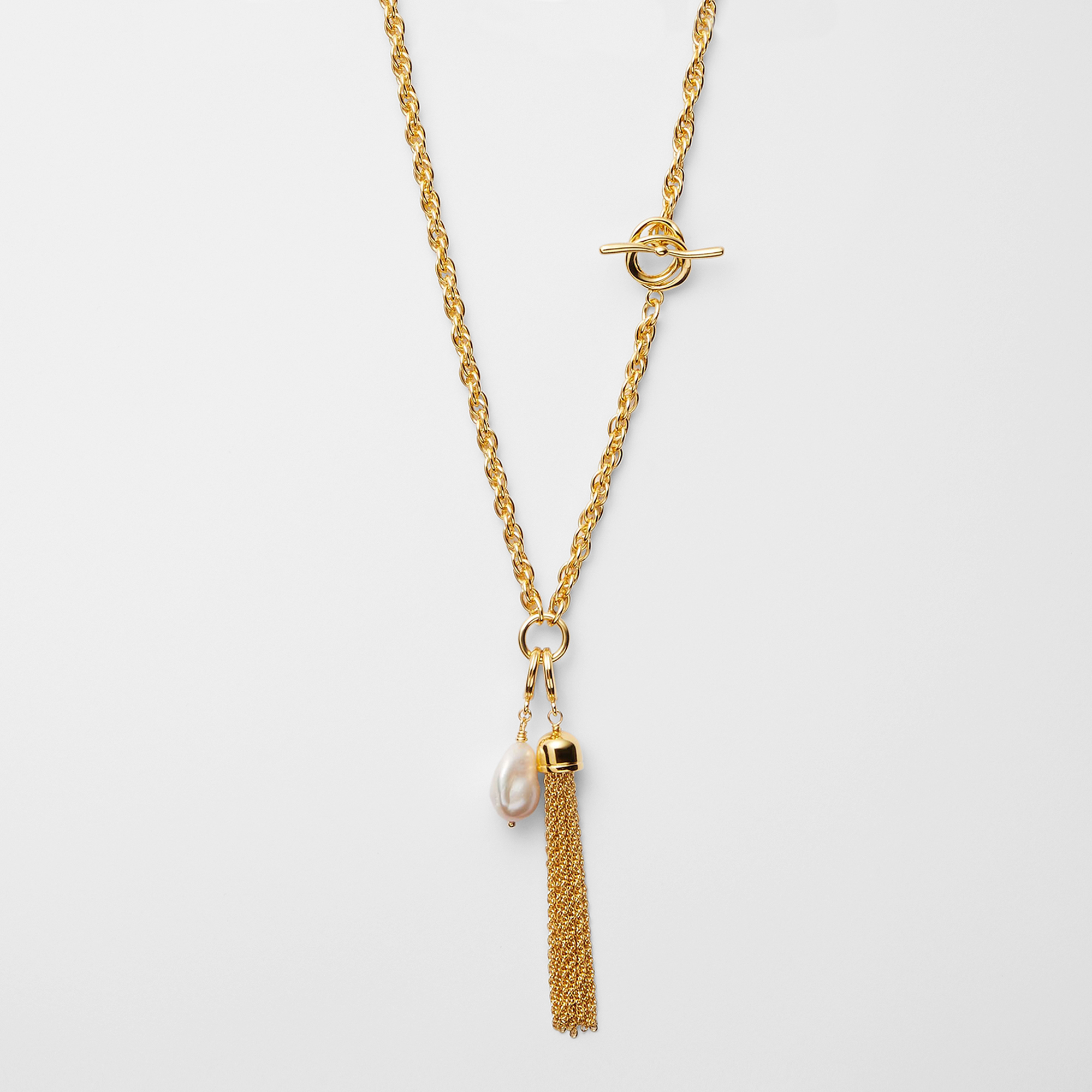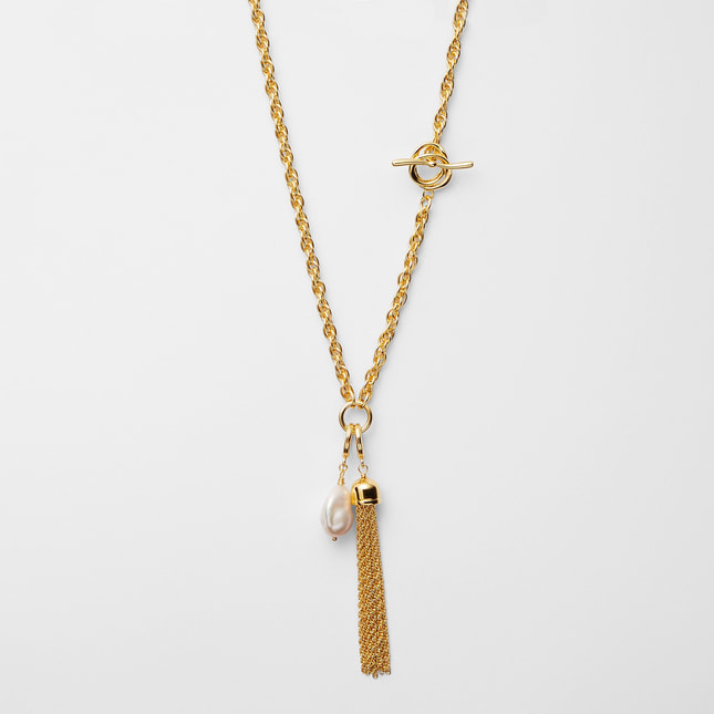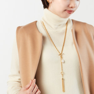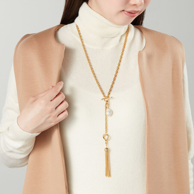 美しい光沢と個性的なフォルムが魅力の淡水有核バロックパールのチャームと、長めのチェーンの動きが美しいタッセルのチャーム。二つのチャームを自在にコーディネートできるネックレスです。