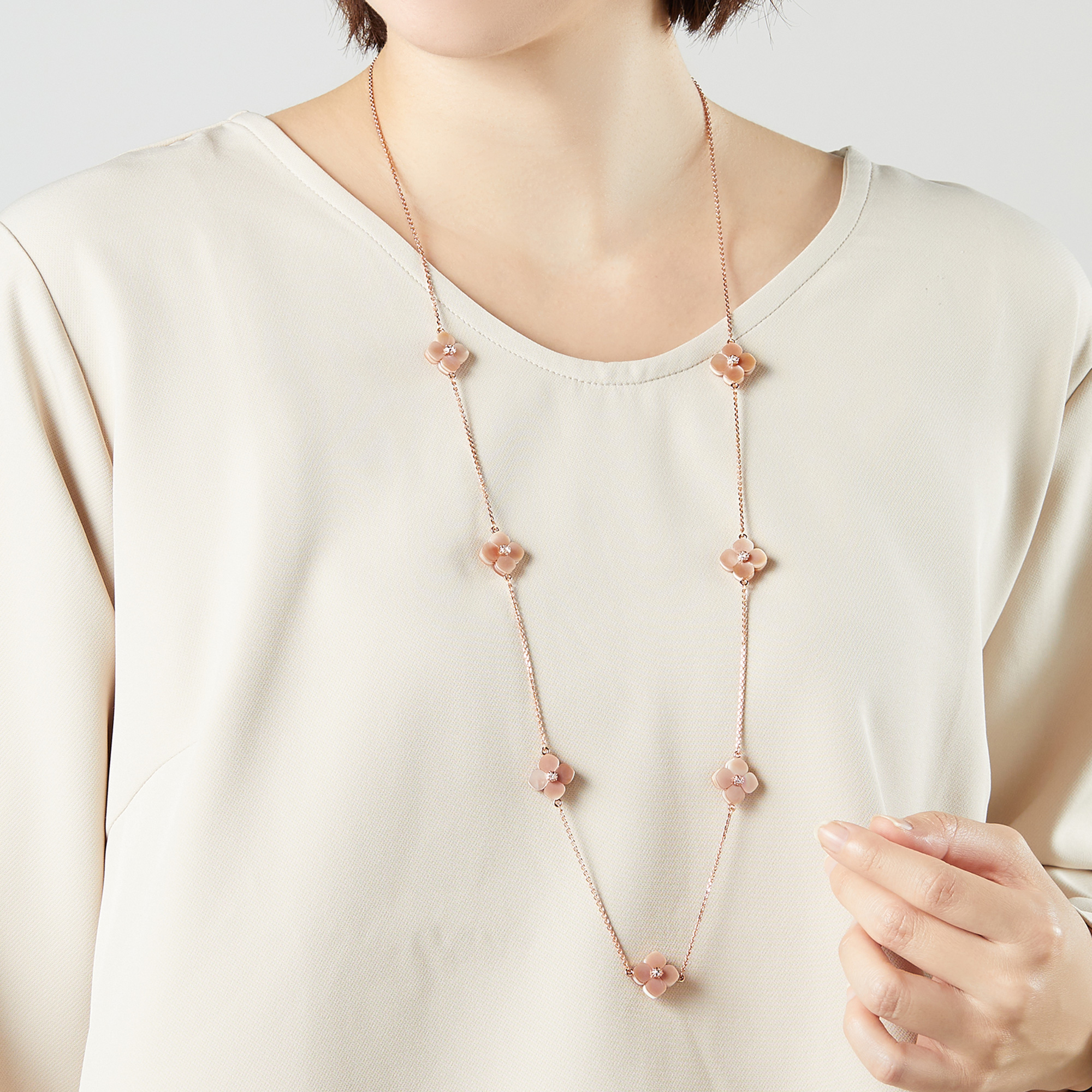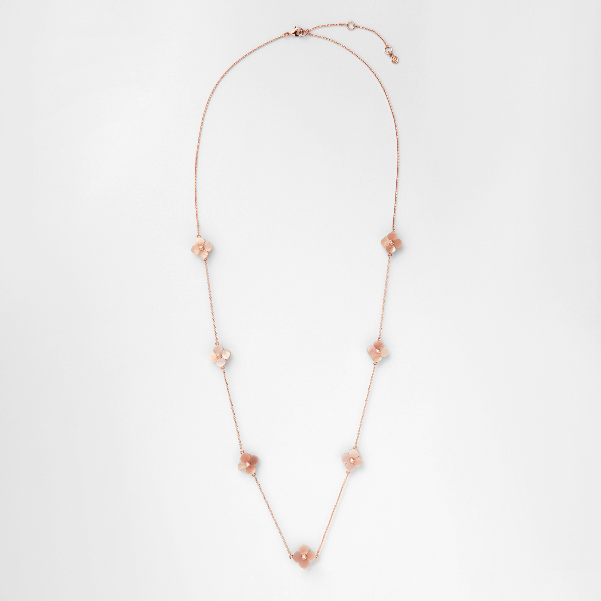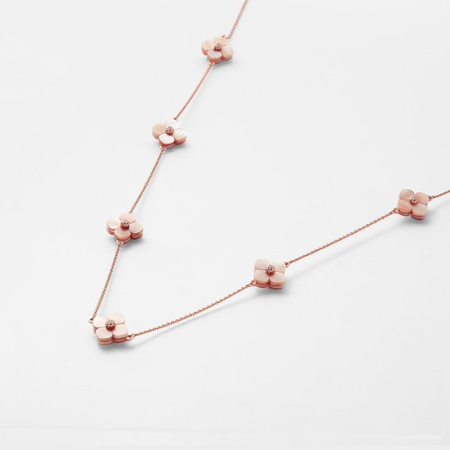 質の良いシェルから1つ1つ丁寧にかたどられた可憐な花モチーフのパーツを贅沢に散りばめたロングネックレスです。