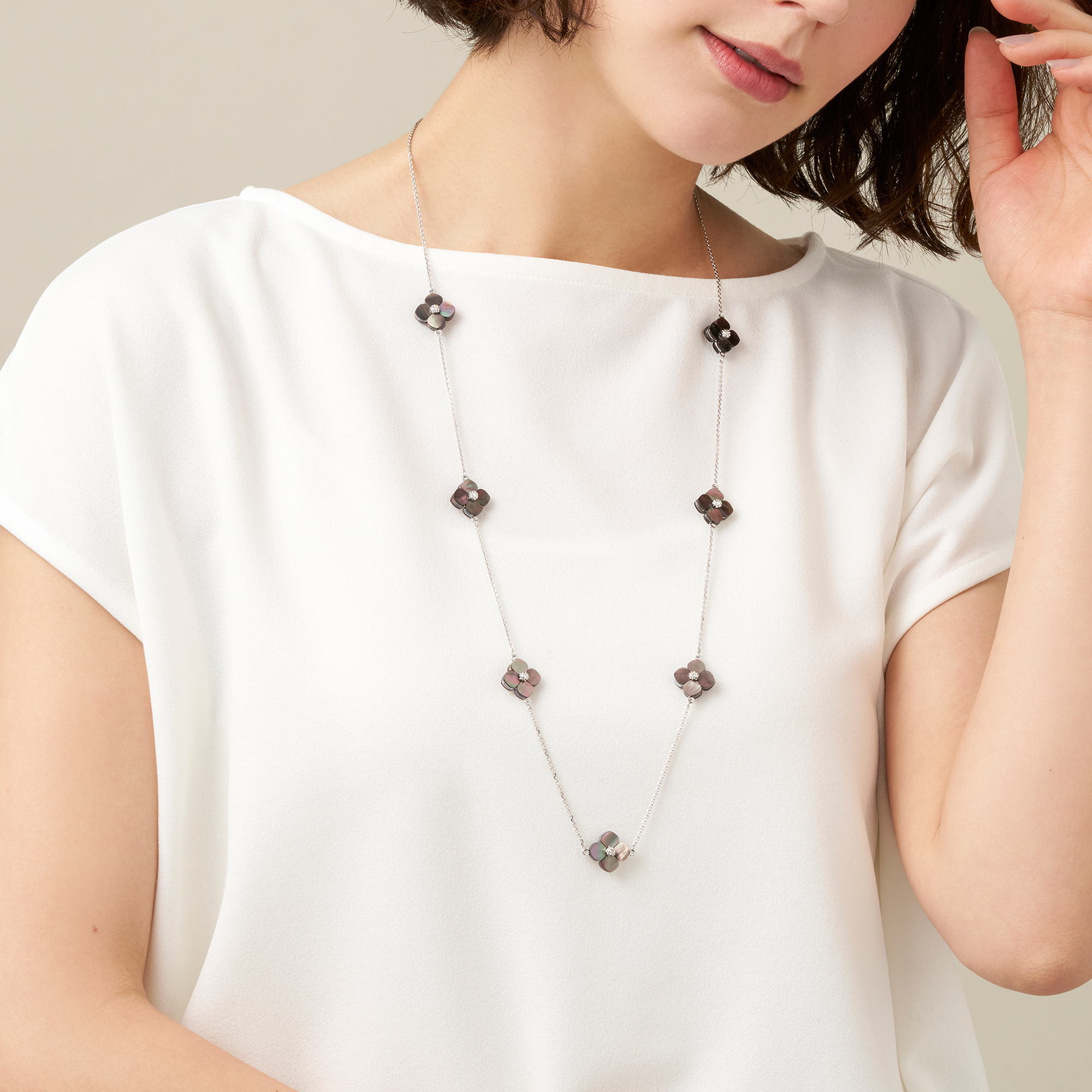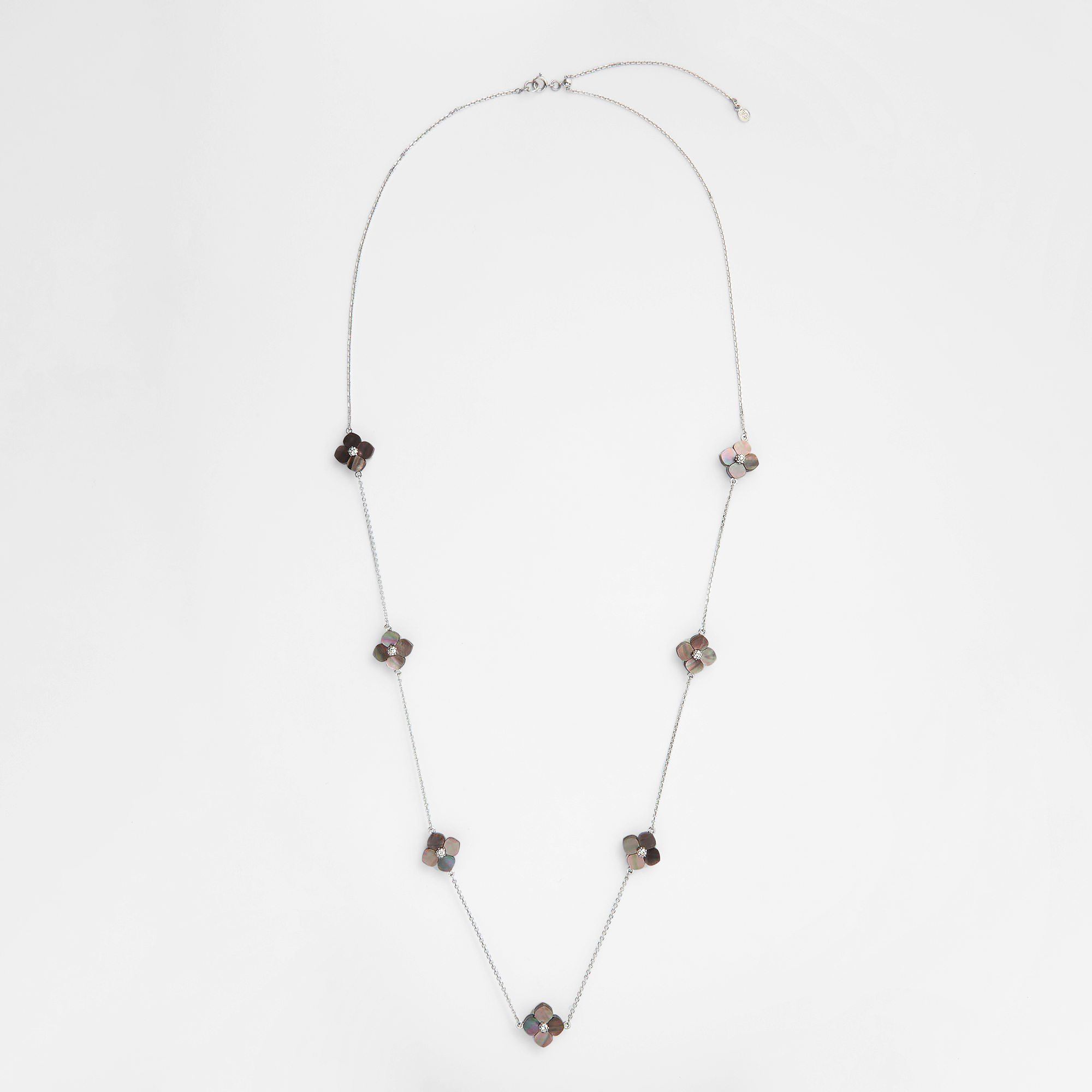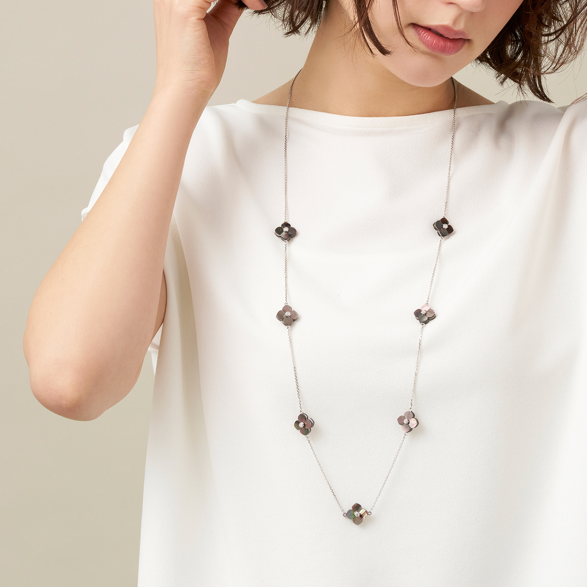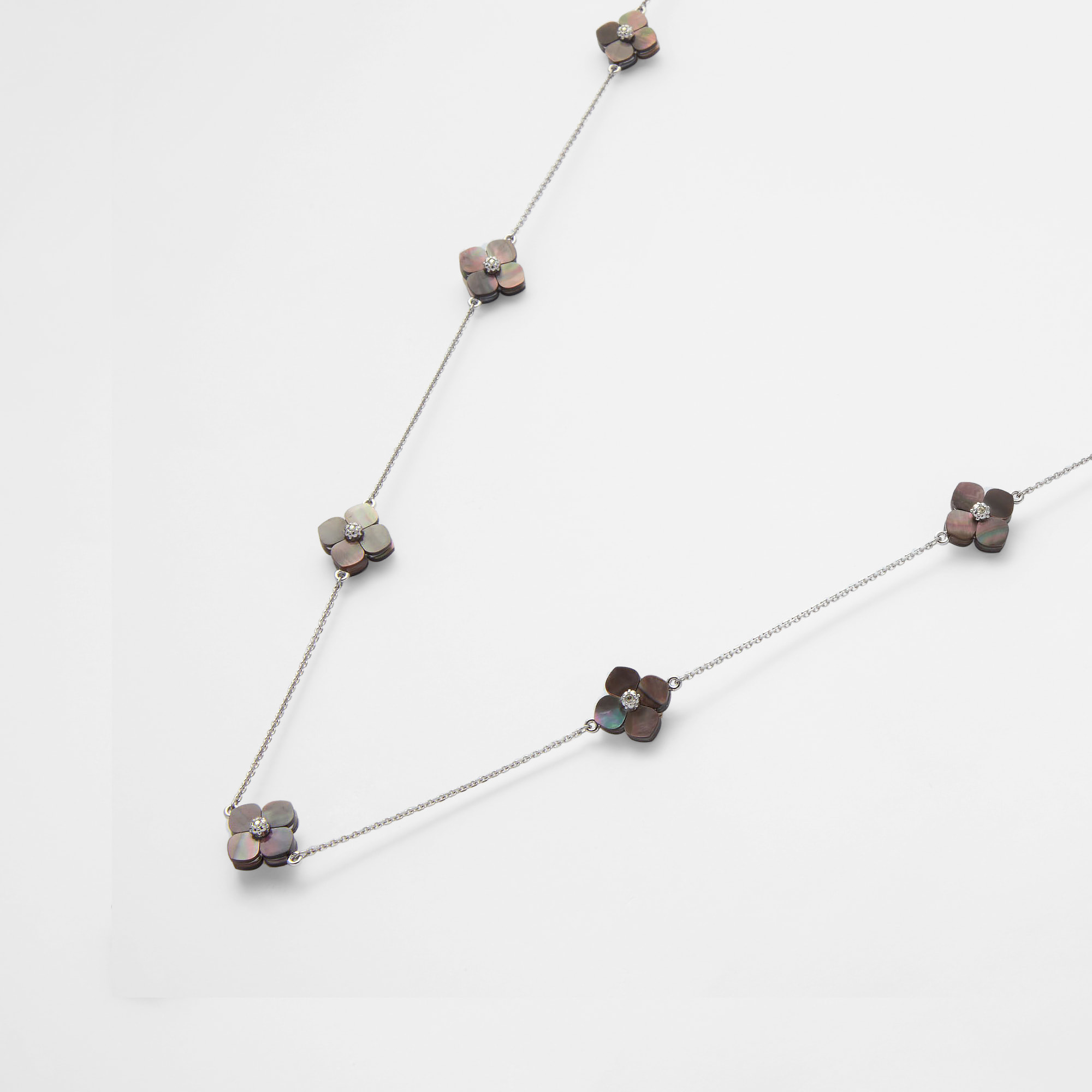 質の良いシェルから1つ1つ丁寧にかたどられた可憐な花モチーフのパーツを贅沢に散りばめたロングネックレスです。