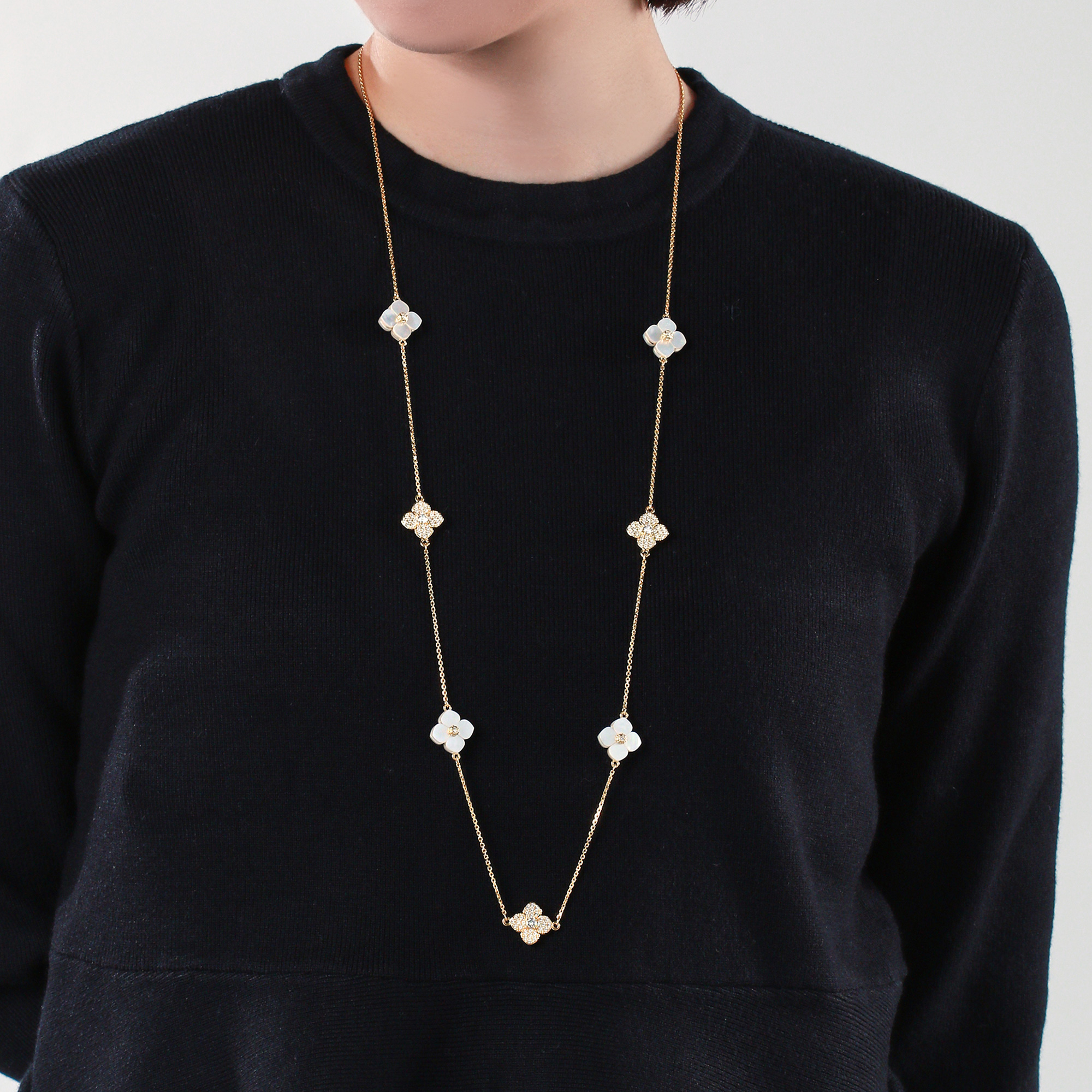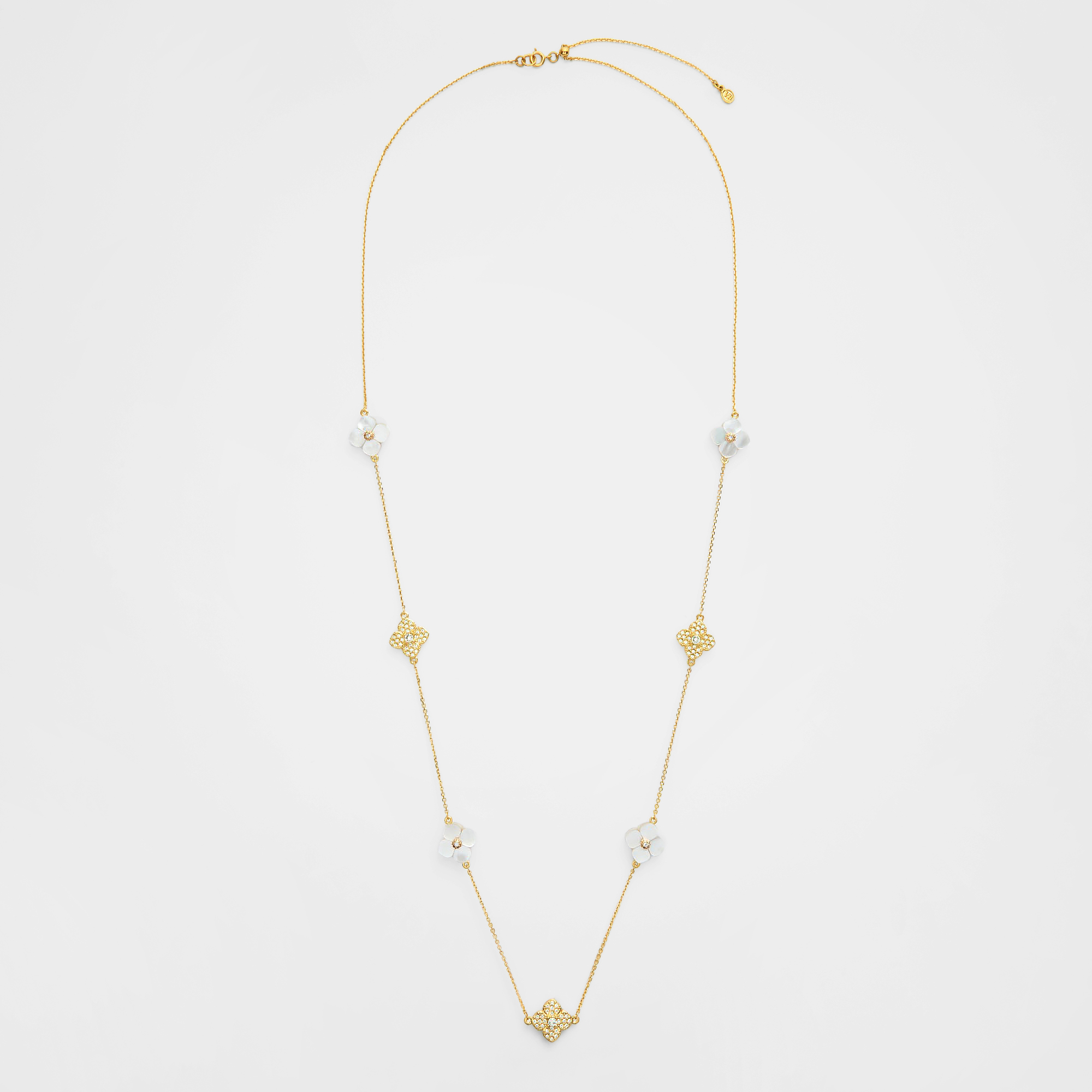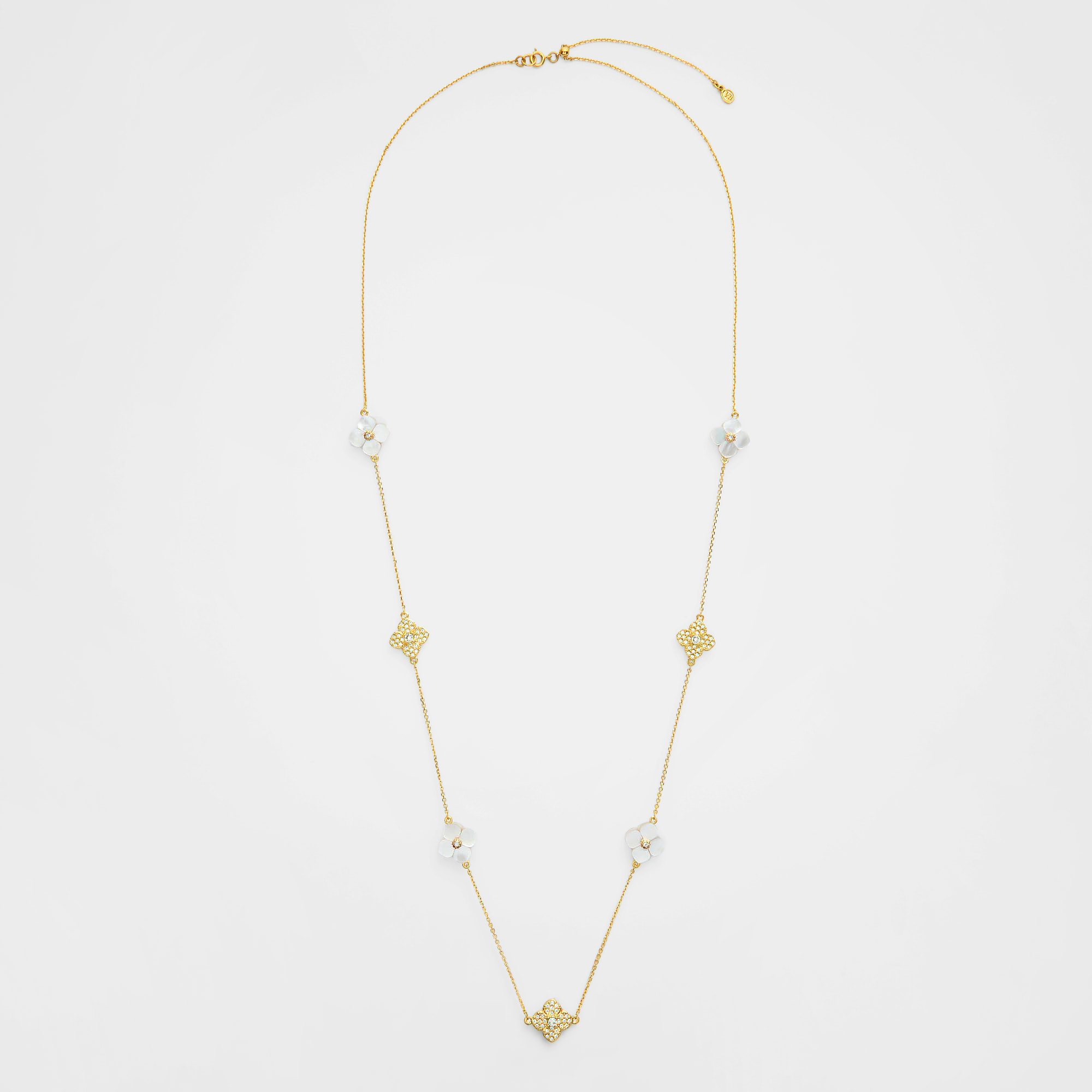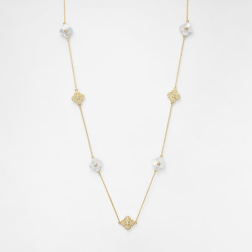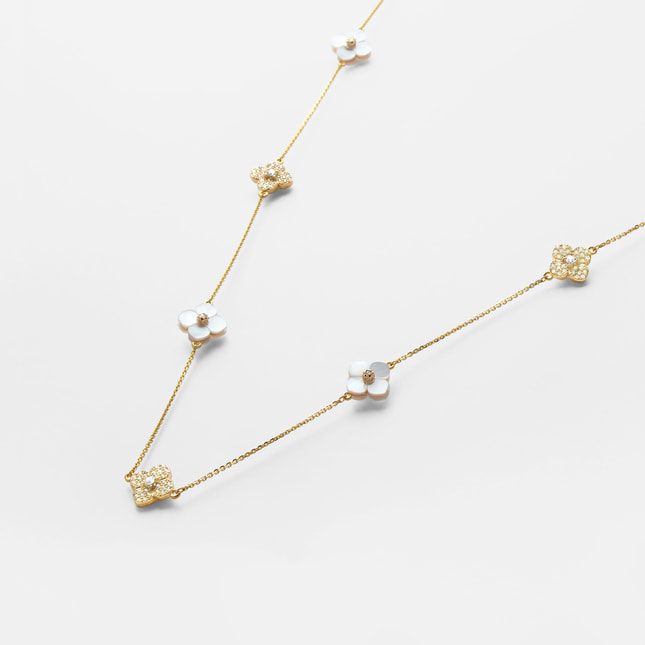独特な虹彩が魅力の白蝶貝と、繊細な輝きを放つガラス。それぞれ素材の美しさを活かした花のパーツを、贅沢に散りばめました。