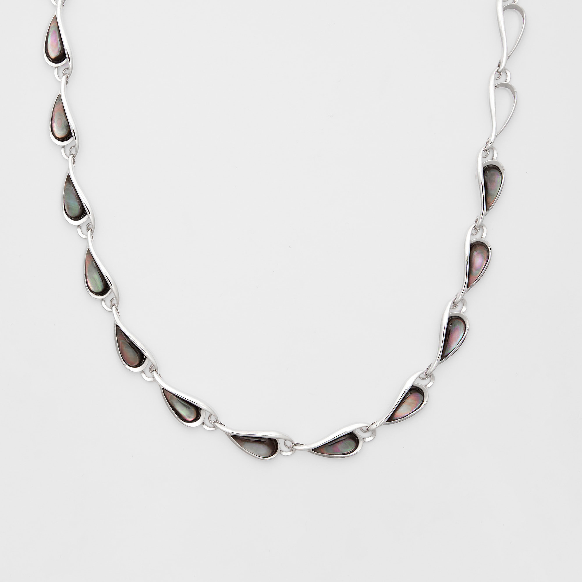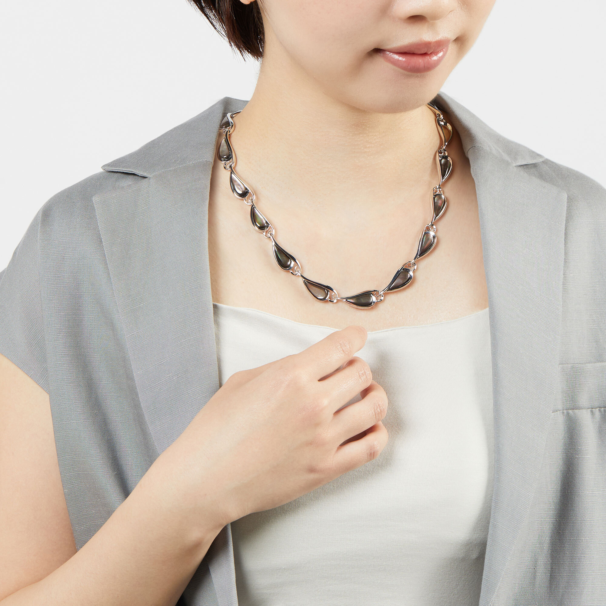 美しいティアドロップ型の黒蝶貝を贅沢にあしらい、さざ波のようにエレガントなラインに仕上げたネックレス。