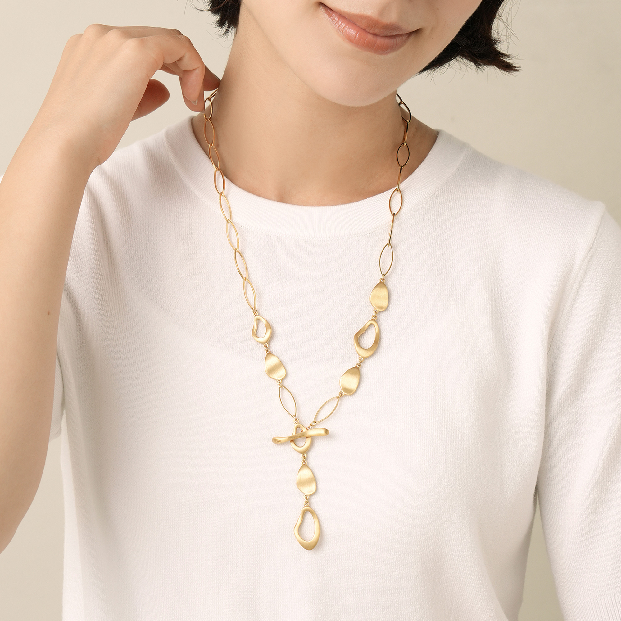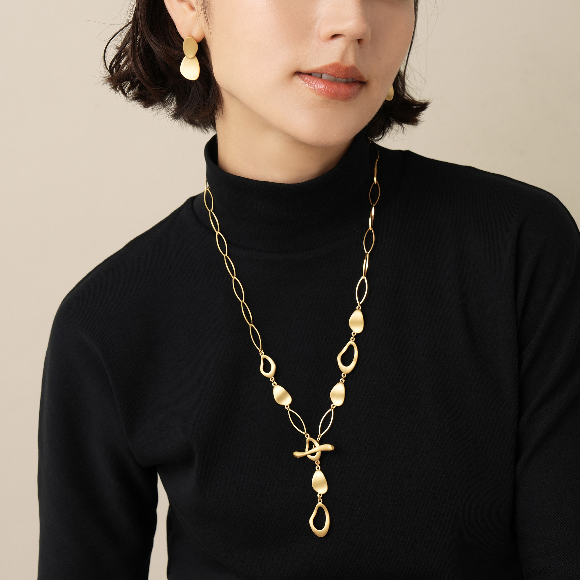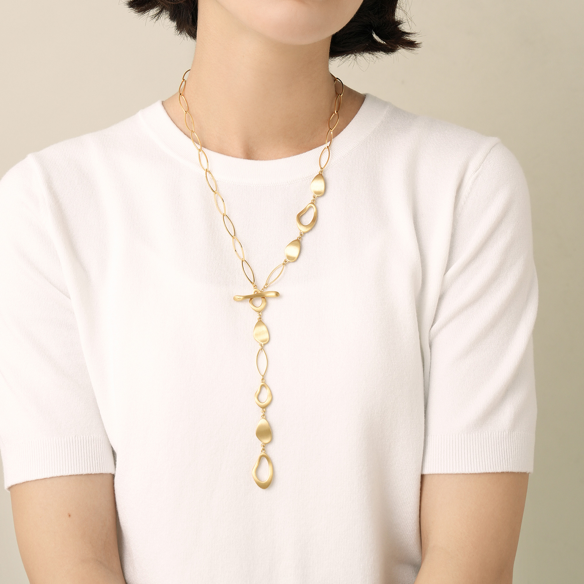 柔らかなゴールドカラーにニュアンスあるメタルが印象的なネックレス。モダンなメタルシェイプに、繊細なマット加工を施すことで、ほどよいエレガンスをプラスし、センシュアルな雰囲気に仕上げました。金具を留める位置によって、自在にアレンジができます。ミドルレングスのY字スタイルからロングネックレスまでアレンジ次第でドラマティックに印象が変わるので、気分に合わせて様々なスタイリングでお楽しみいただけます。ボリュームがありながらも軽やかなチェーンがほどよい抜け感を演出し、コーディネートの主役になるアイテムです。