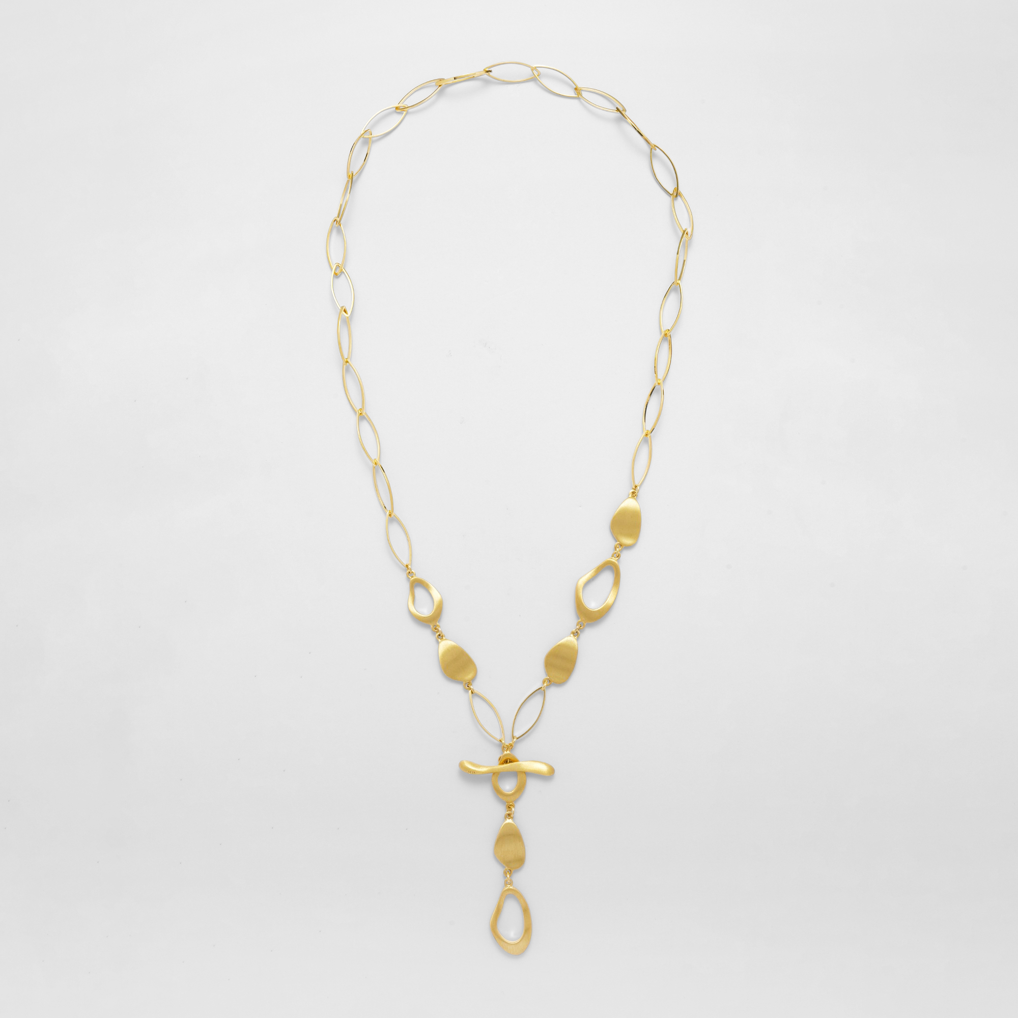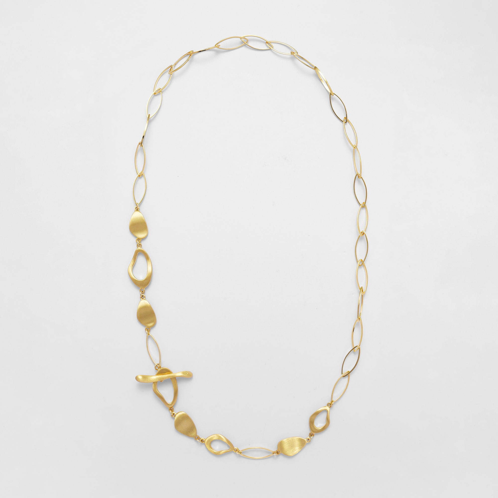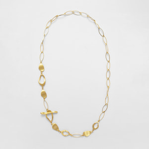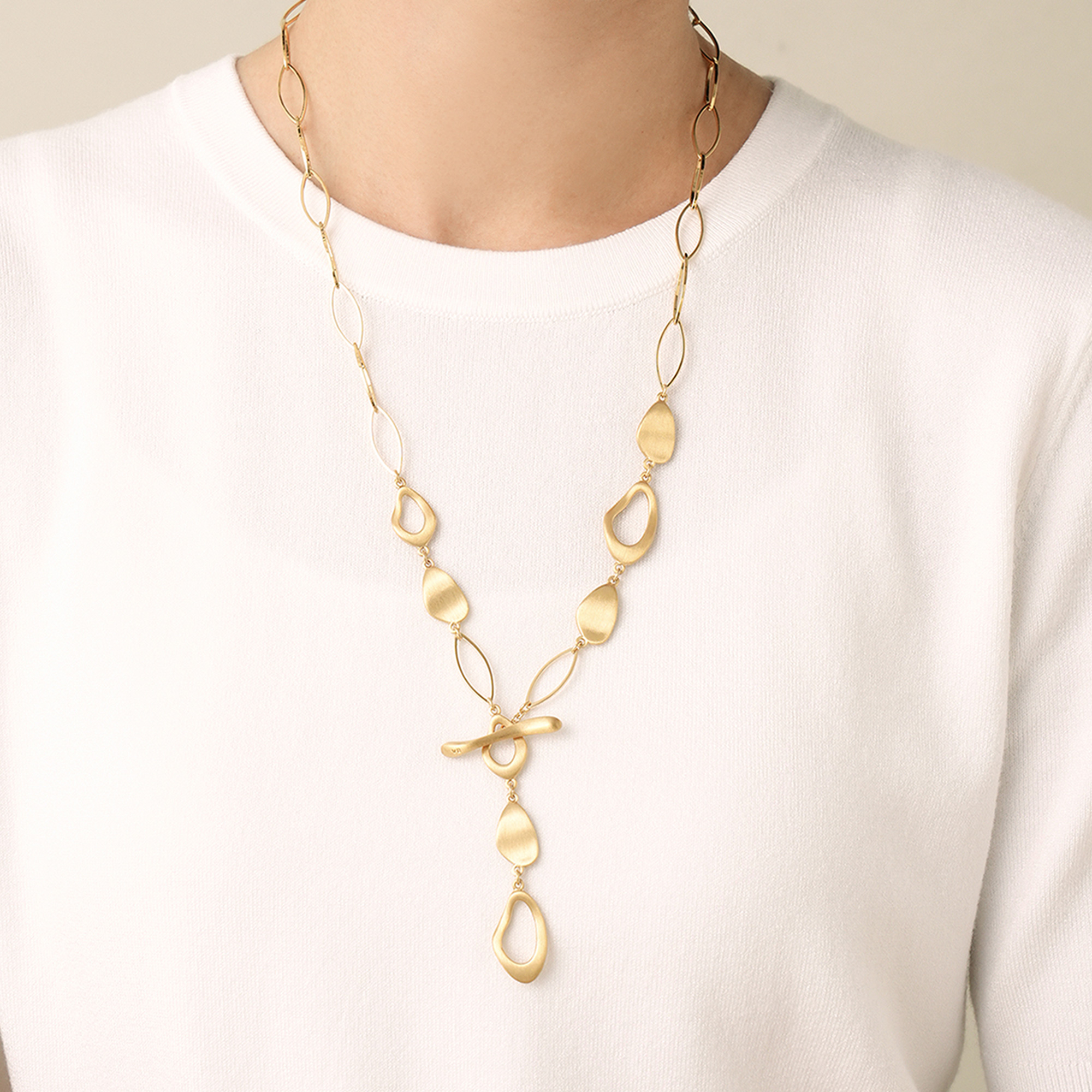 柔らかなゴールドカラーにニュアンスあるメタルが印象的なネックレス。モダンなメタルシェイプに、繊細なマット加工を施すことで、ほどよいエレガンスをプラスし、センシュアルな雰囲気に仕上げました。金具を留める位置によって、自在にアレンジができます。ミドルレングスのY字スタイルからロングネックレスまでアレンジ次第でドラマティックに印象が変わるので、気分に合わせて様々なスタイリングでお楽しみいただけます。ボリュームがありながらも軽やかなチェーンがほどよい抜け感を演出し、コーディネートの主役になるアイテムです。