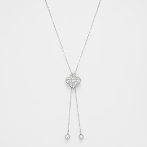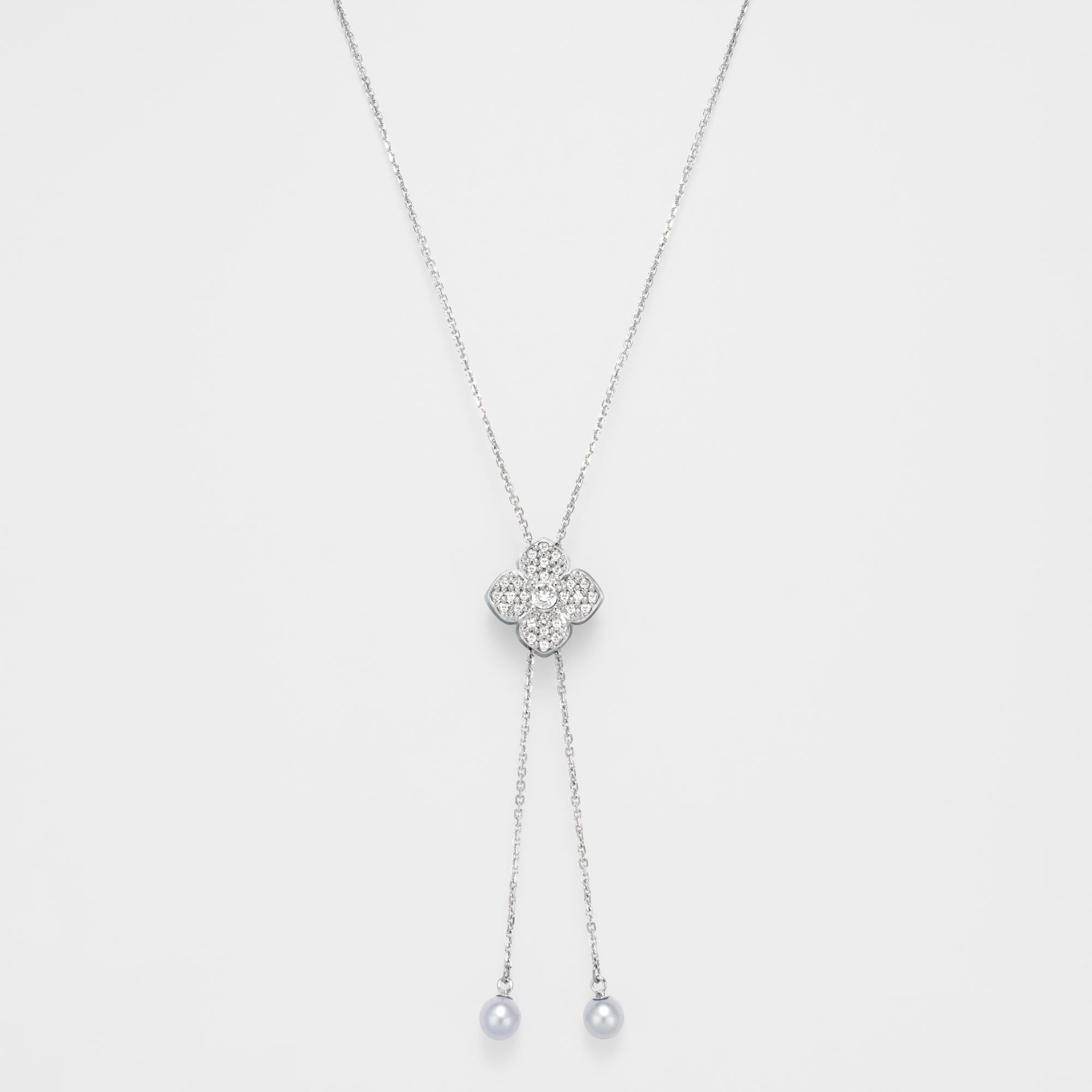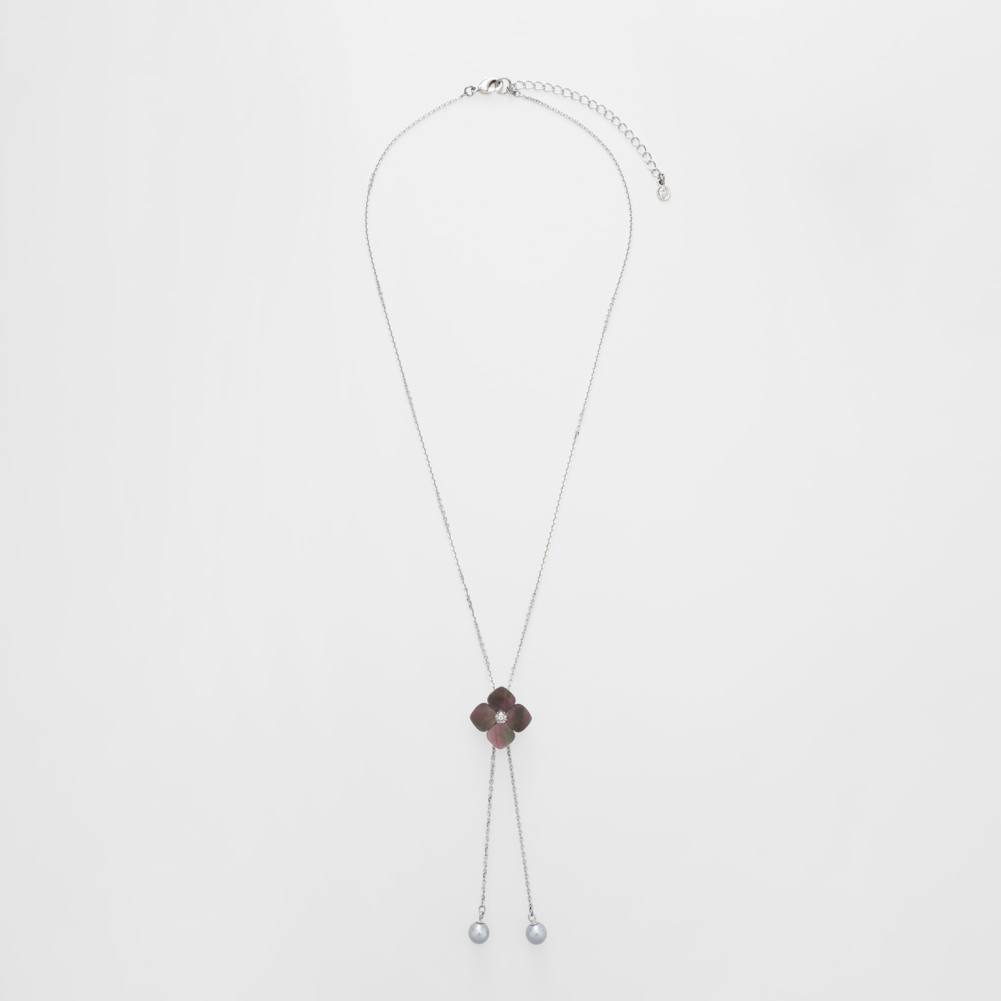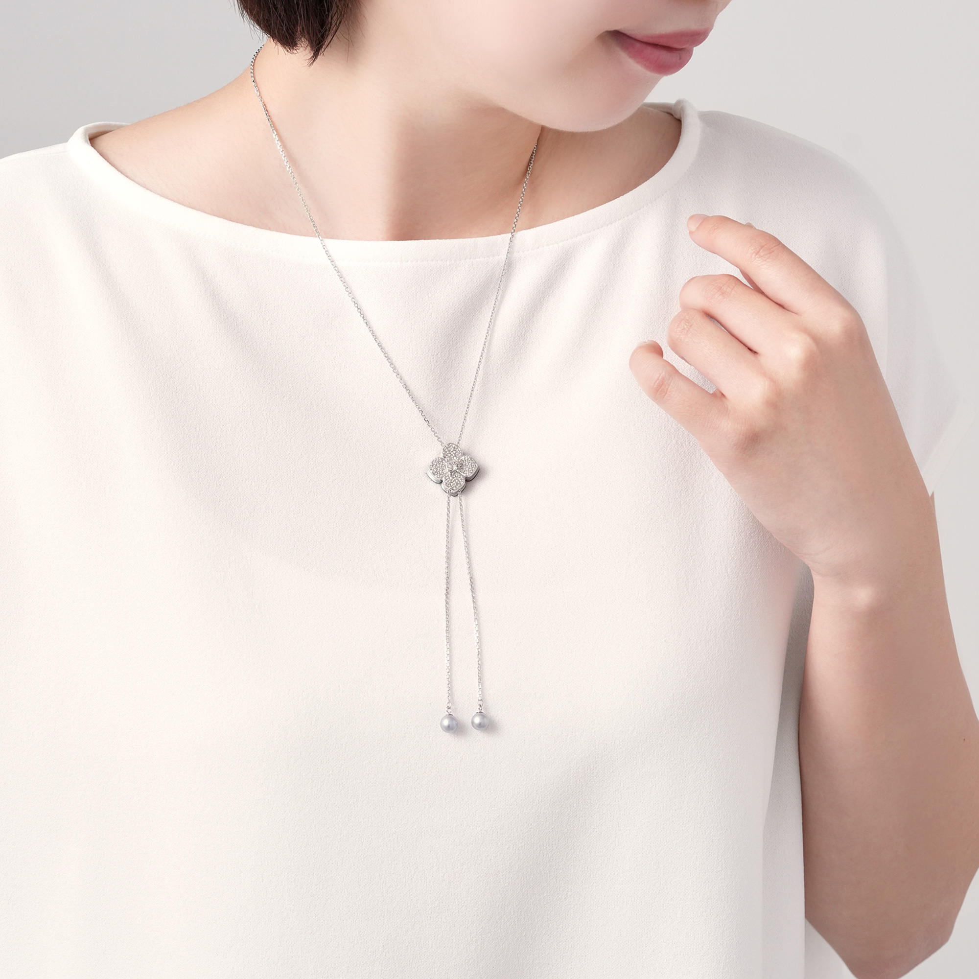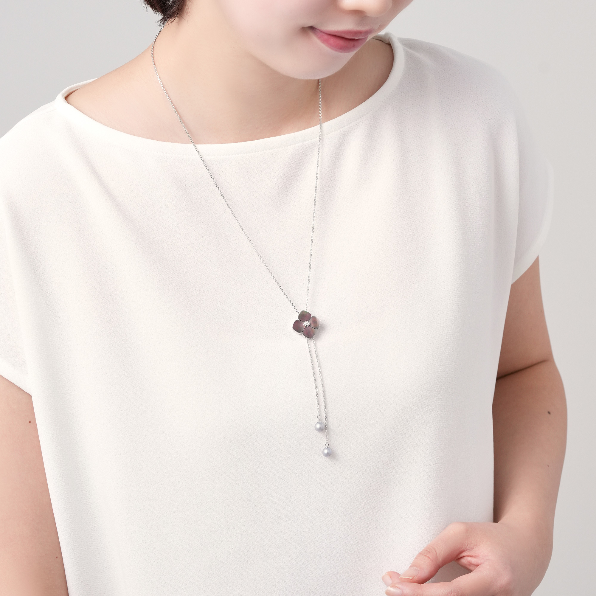 質の良い黒蝶貝から1つ1つ丁寧に花をかたどり、柔らかなシルバーカラーの淡水パールと合わせ、可憐でノーブルな印象に仕上げました。