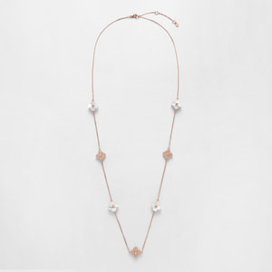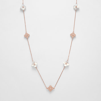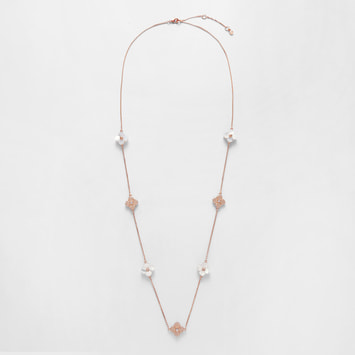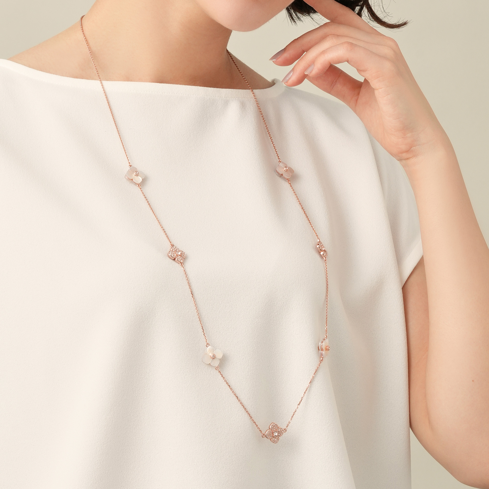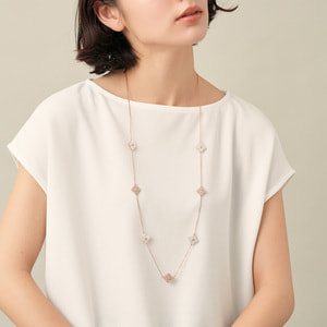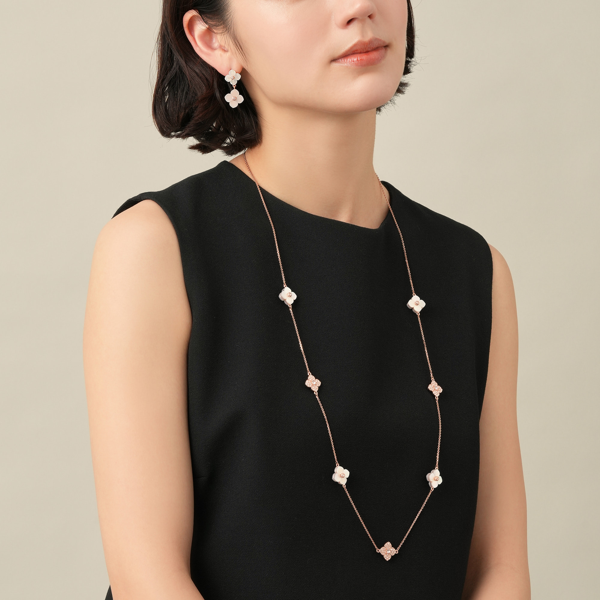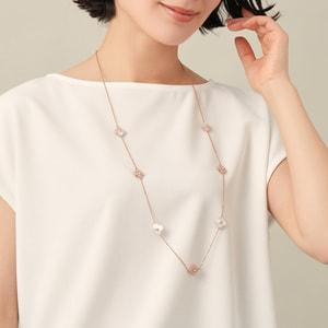 天然ならではの優しさと柔らかさを宿した美しい白蝶貝に、スキンカラーの繊細なガラスの輝きを添えて。それぞれ素材の美しさを活かした花のパーツを、贅沢に散りばめました。ローズゴールドカラーが肌をより明るく綺麗に見せてくれます。