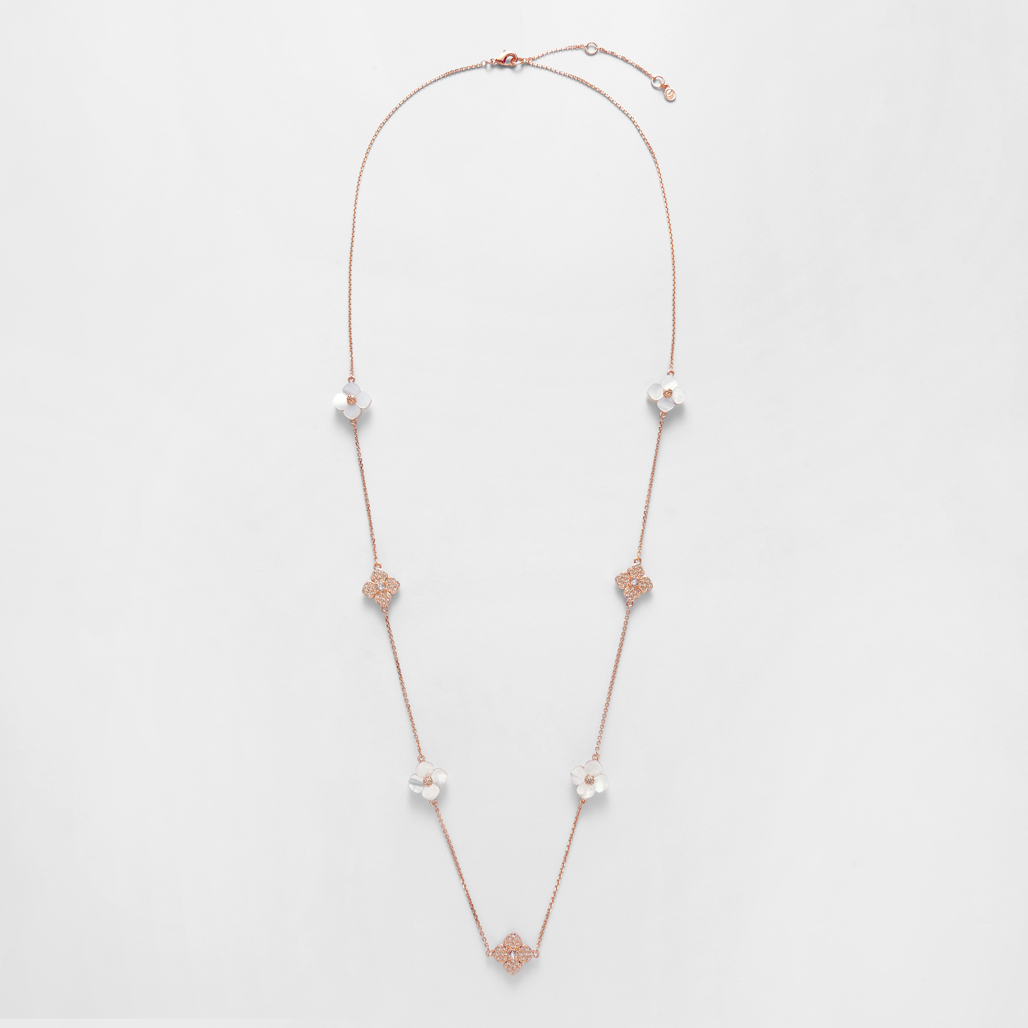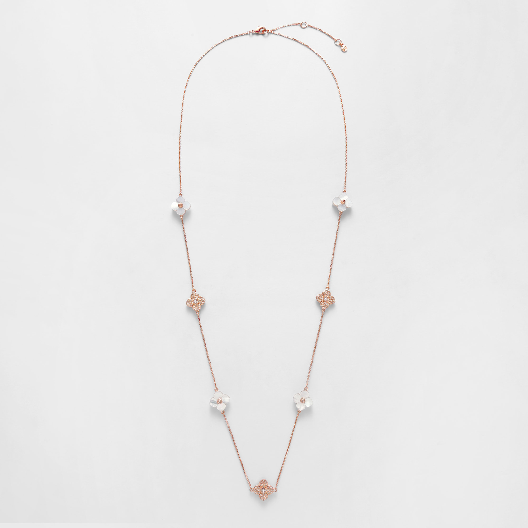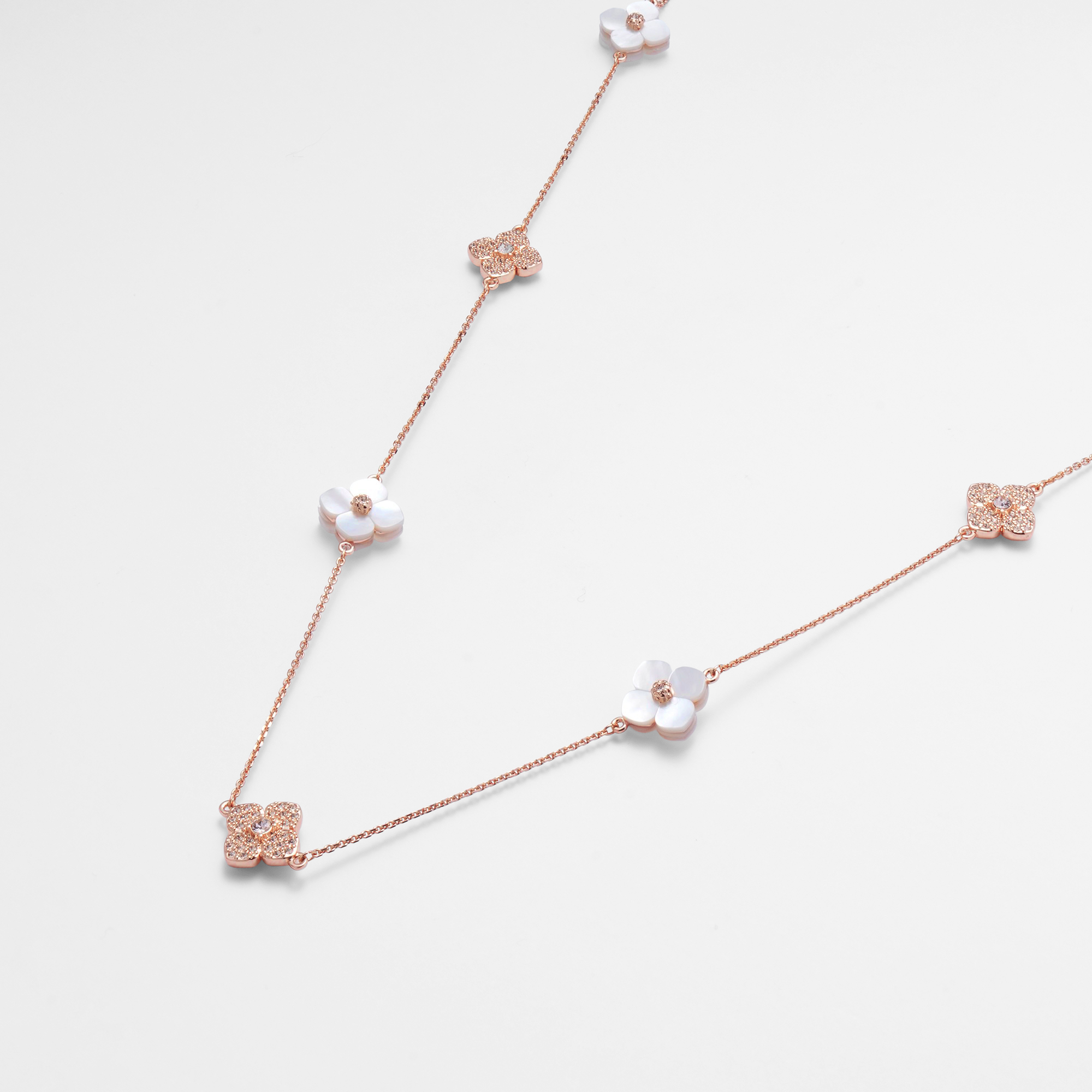 天然ならではの優しさと柔らかさを宿した美しい白蝶貝に、スキンカラーの繊細なガラスの輝きを添えて。それぞれ素材の美しさを活かした花のパーツを、贅沢に散りばめました。ローズゴールドカラーが肌をより明るく綺麗に見せてくれます。
