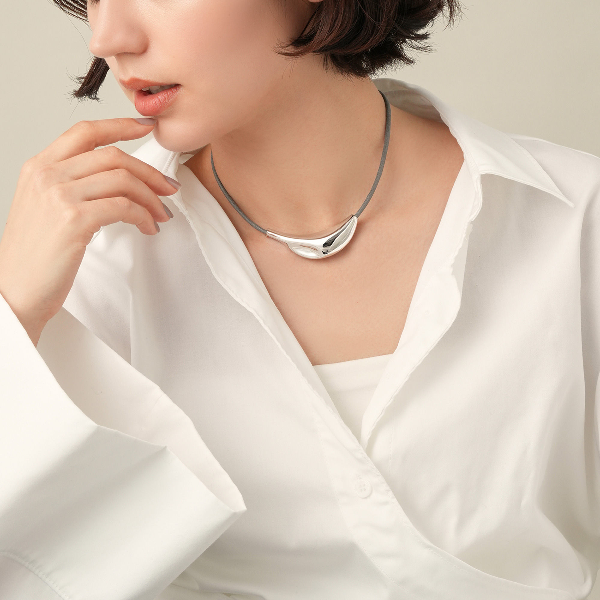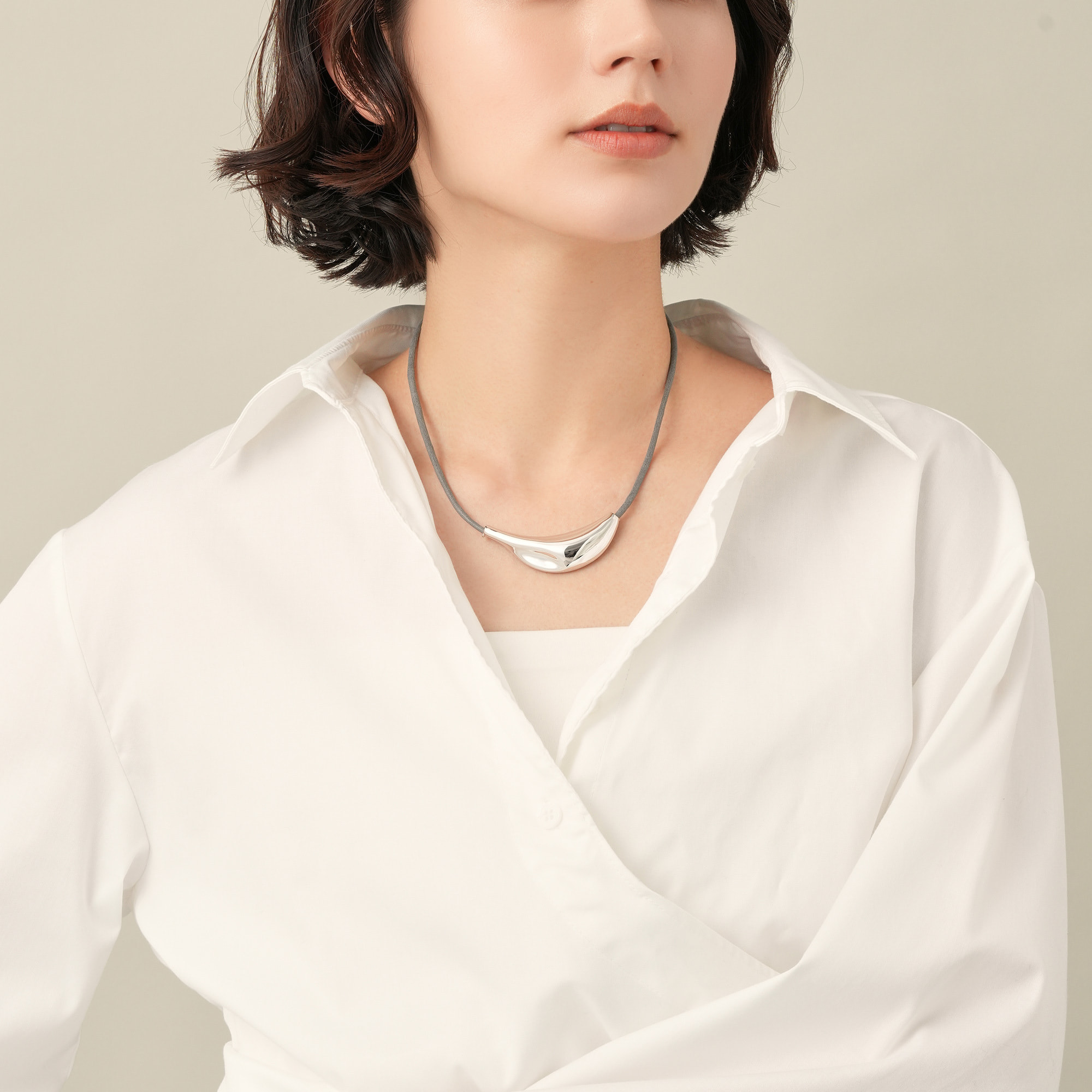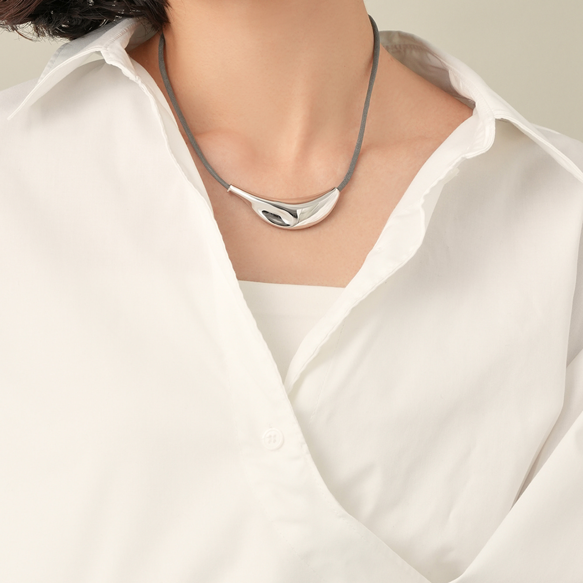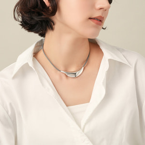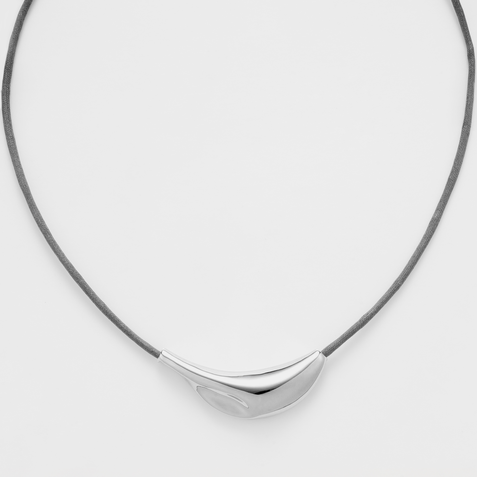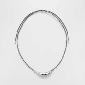 生命力あふれる植物の葉の形からインスパイアされた、オーガニックなフォルムが魅力のネックレス。鏡面仕上げのシルバーカラーが凛とした印象を与えます。グレーのコードがナチュラルでクールなアクセントに。コードは長さ調整ができるので、様々なスタイリングに合わせることができます。