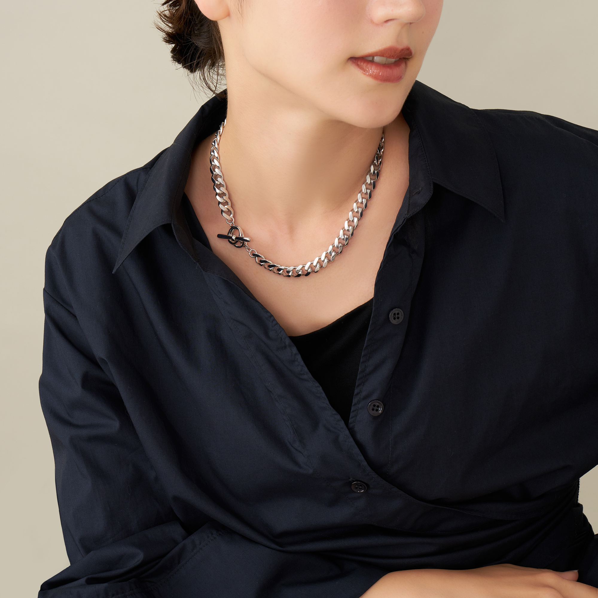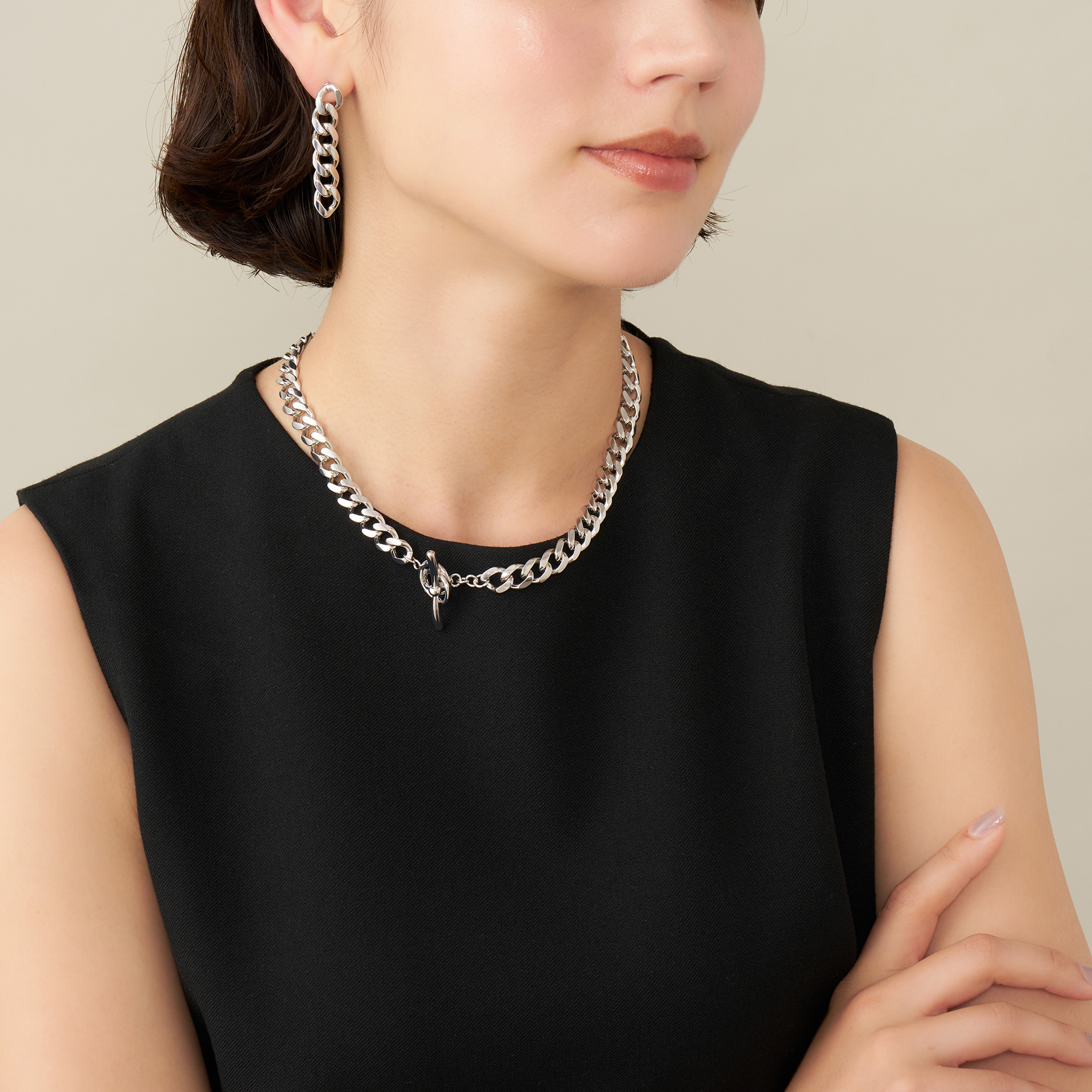 チェーンの角を柔らかく落としたこだわりのカットで、モダンな中にも程よいエレガンスをプラス。