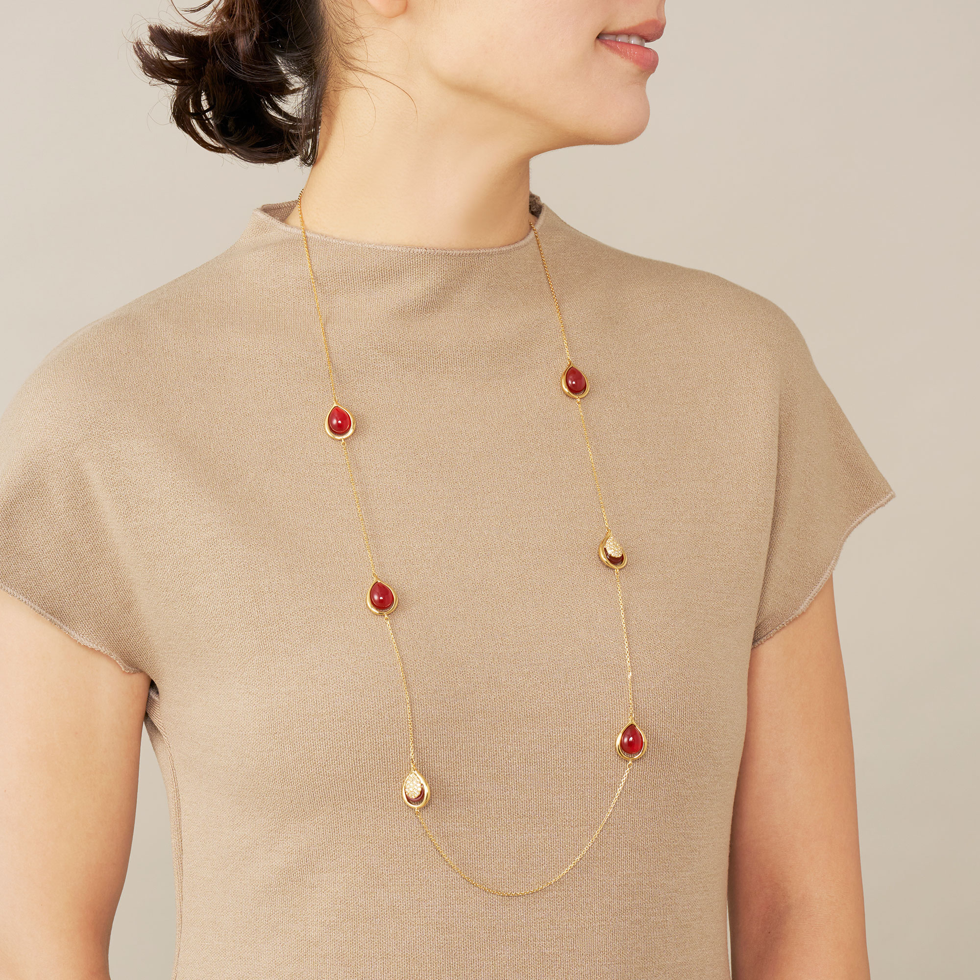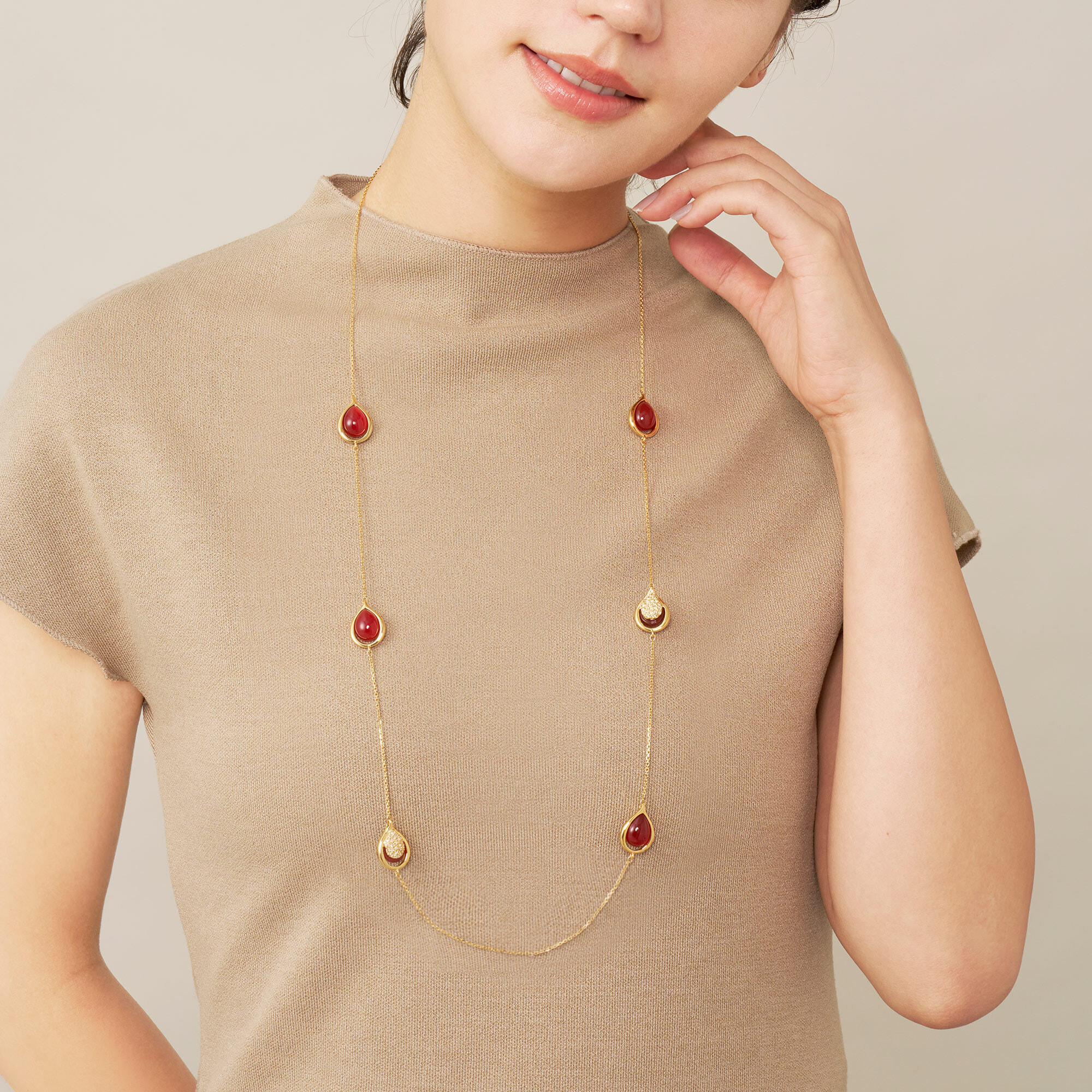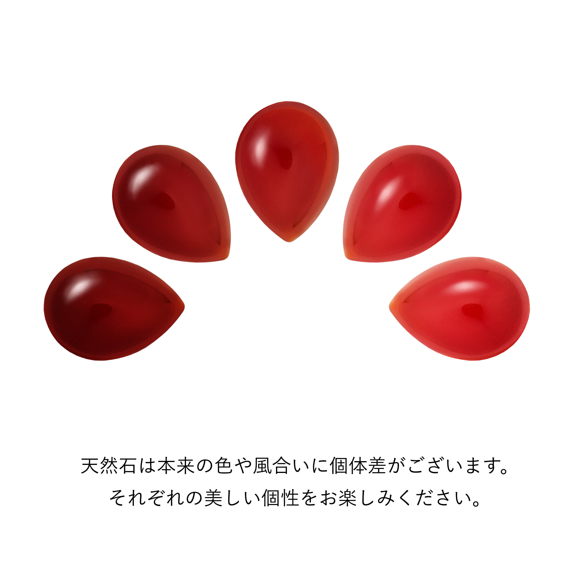 雫が溢れおちるような瑞々しいドロップシェイプと、カーネリアンならではの上質な素材感が程よい存在感を放ちます。