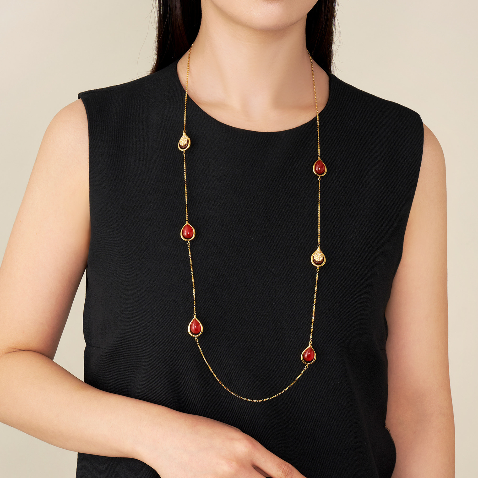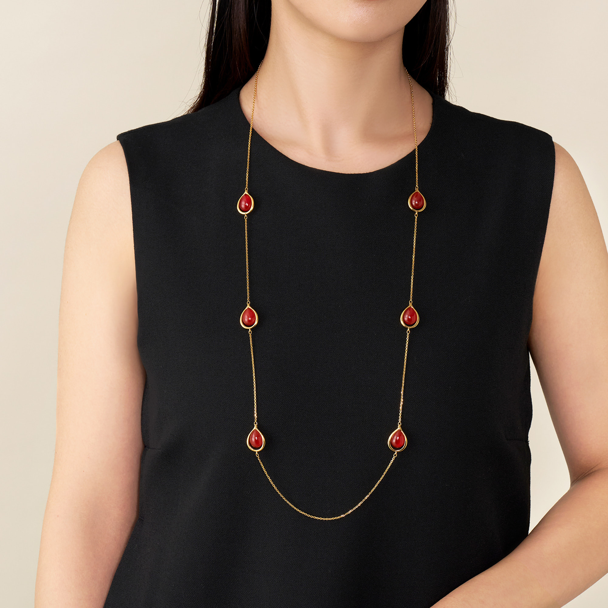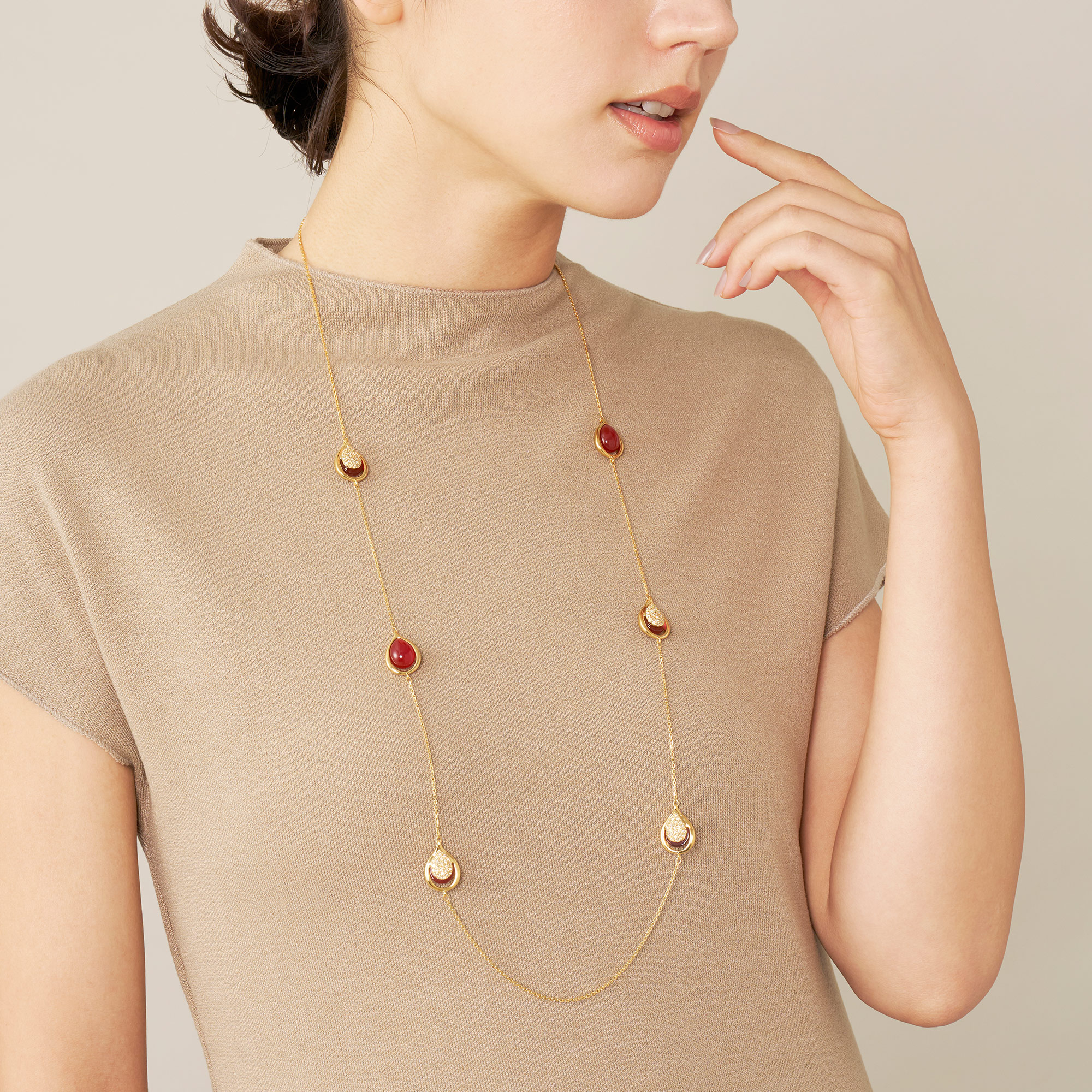 雫が溢れおちるような瑞々しいドロップシェイプと、カーネリアンならではの上質な素材感が程よい存在感を放ちます。