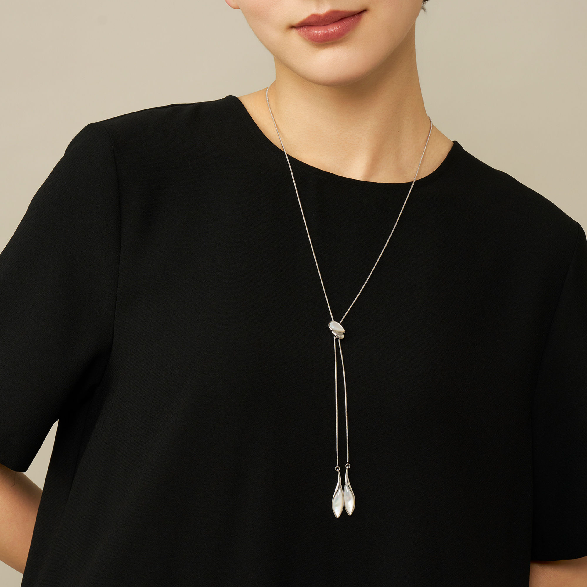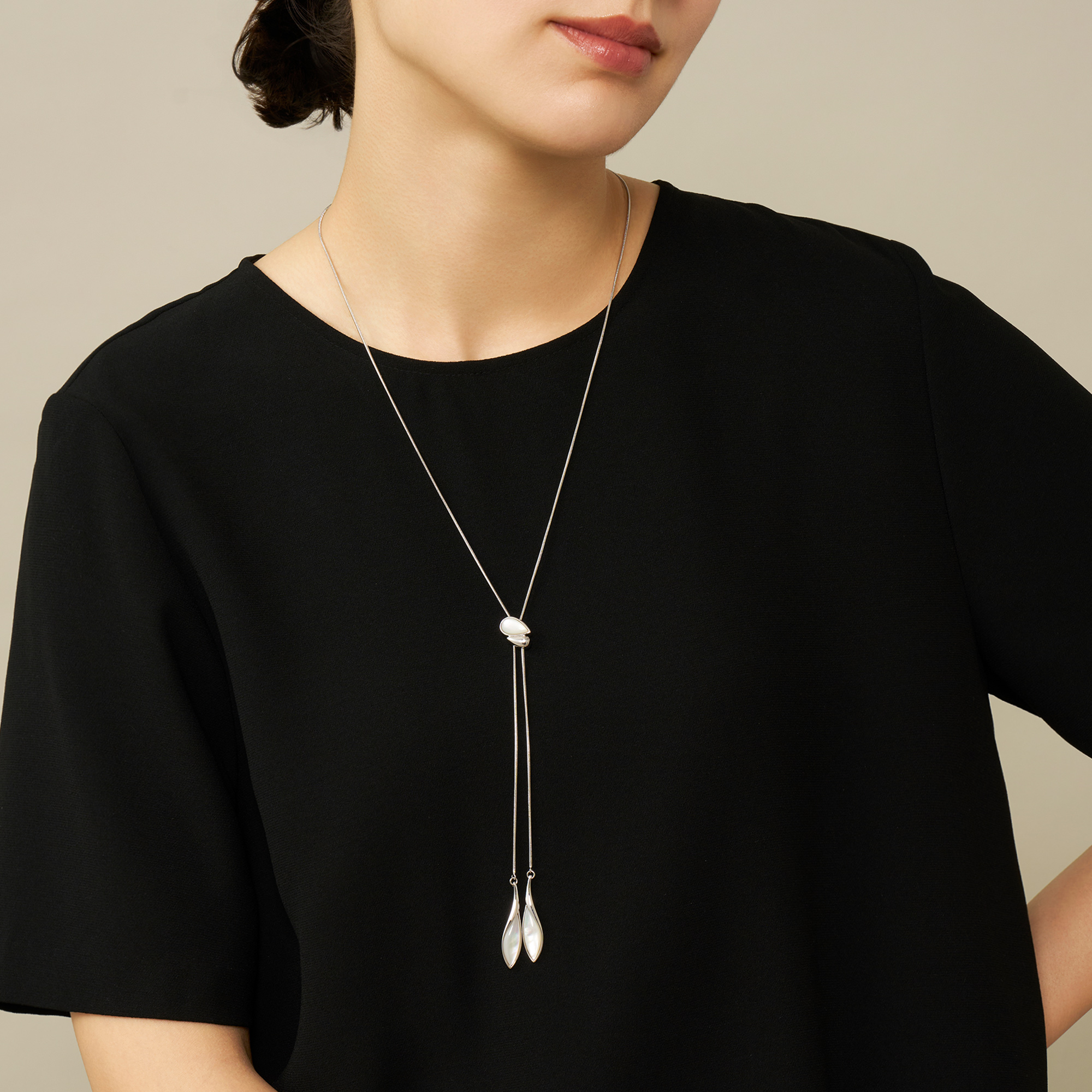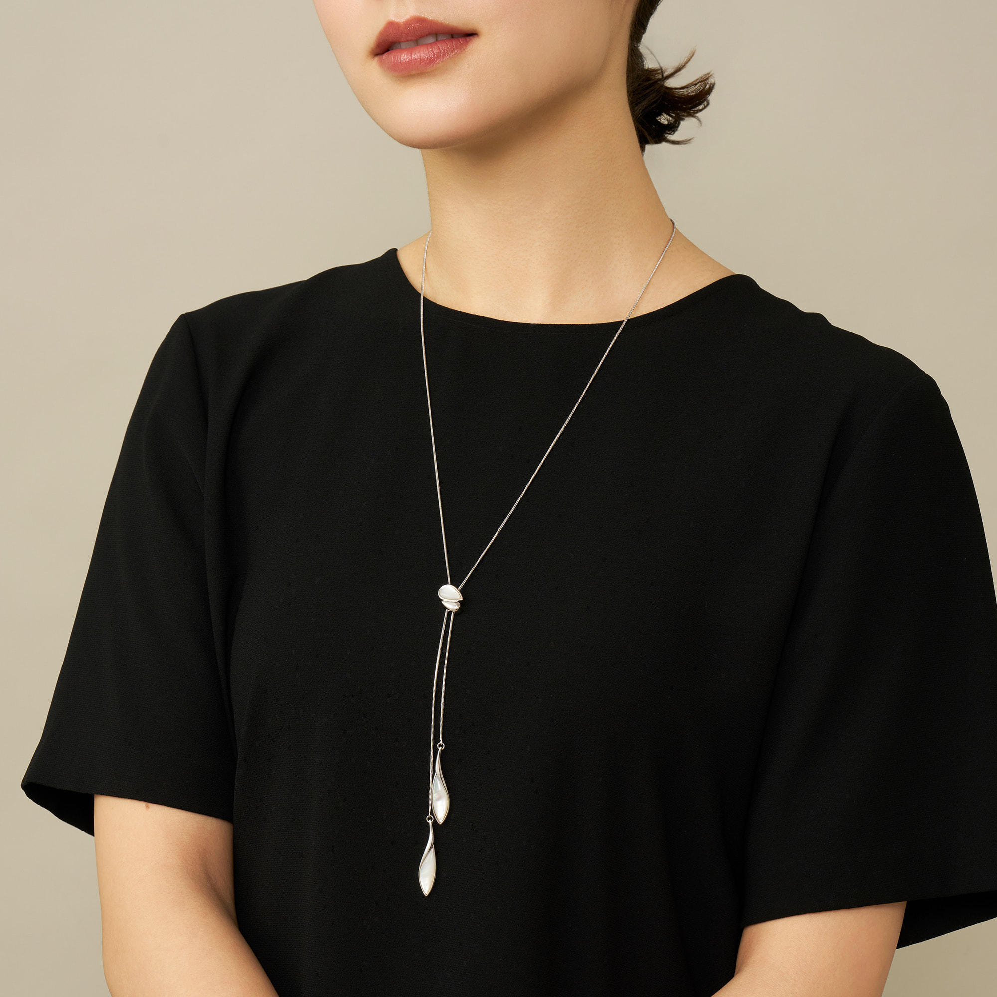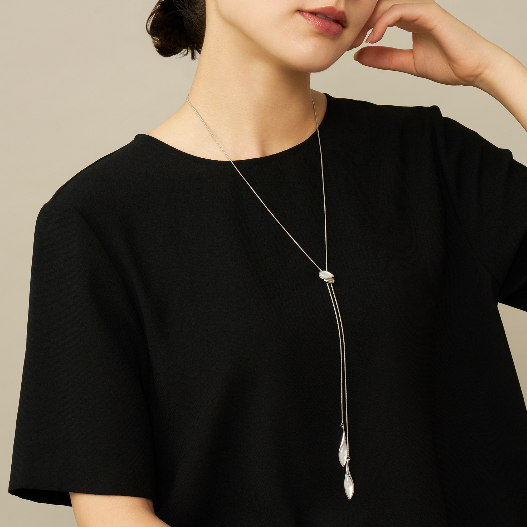 流れるような柔らかなラインと白蝶貝のゆらめく虹彩が美しく溶け合うラリエットネックレス。