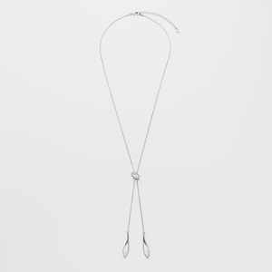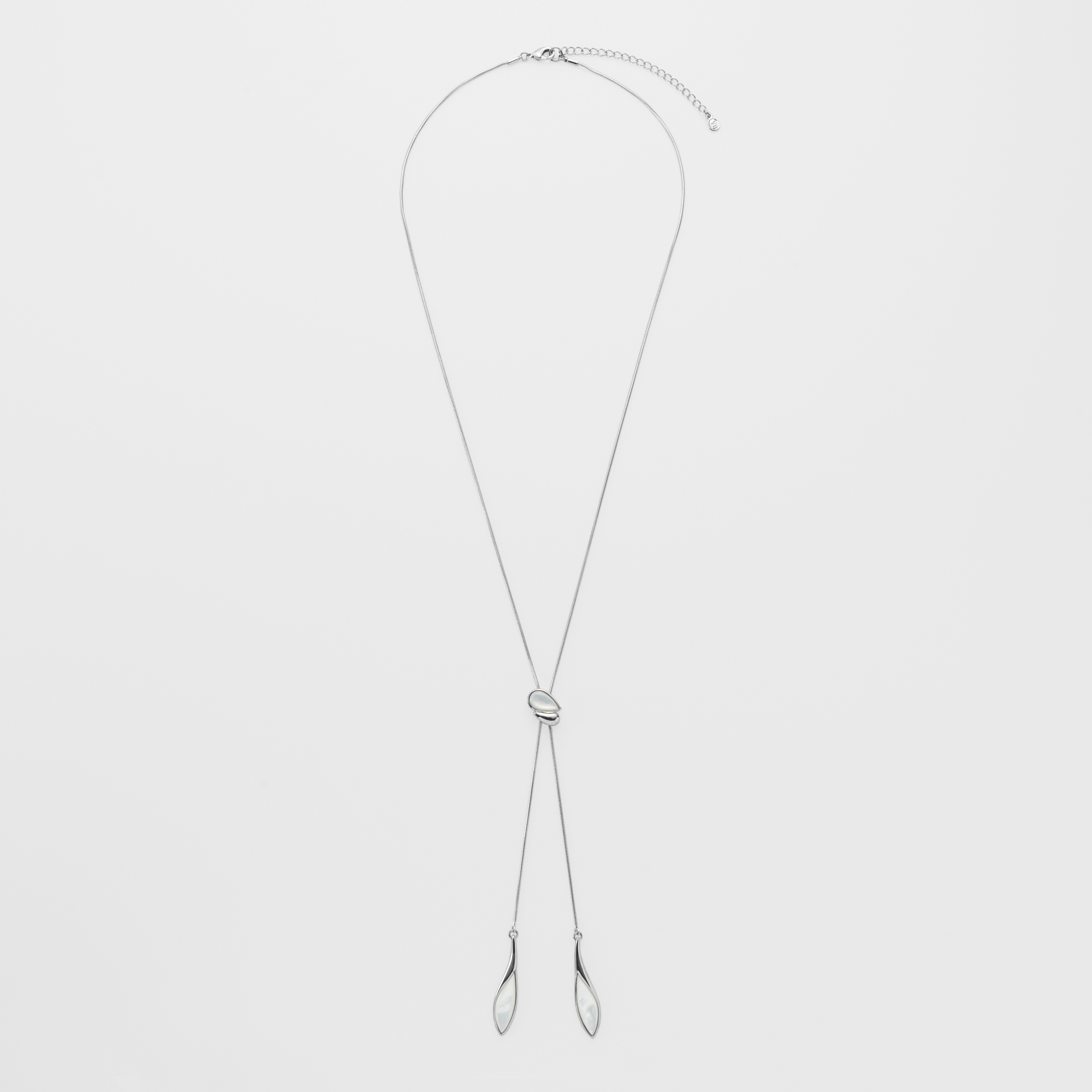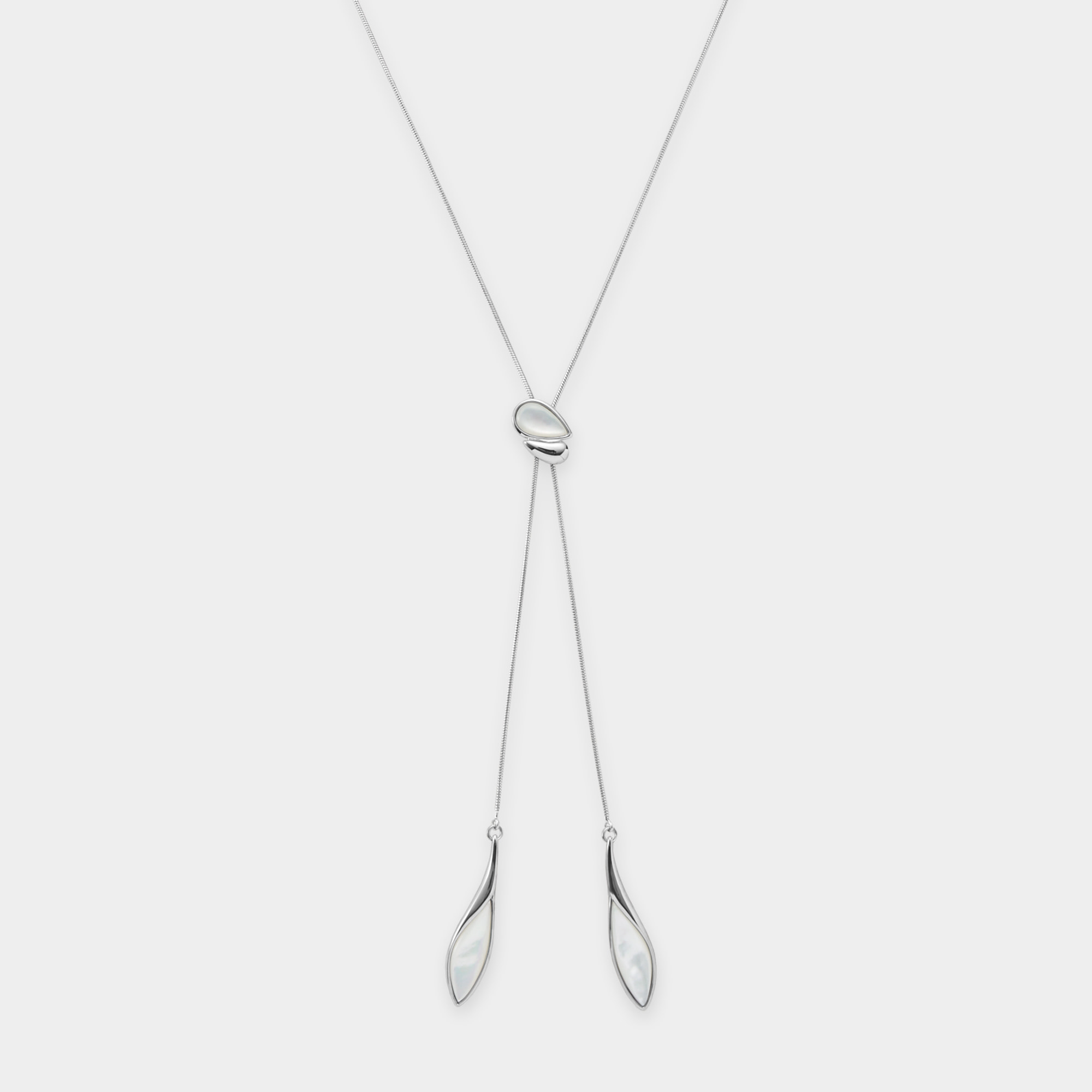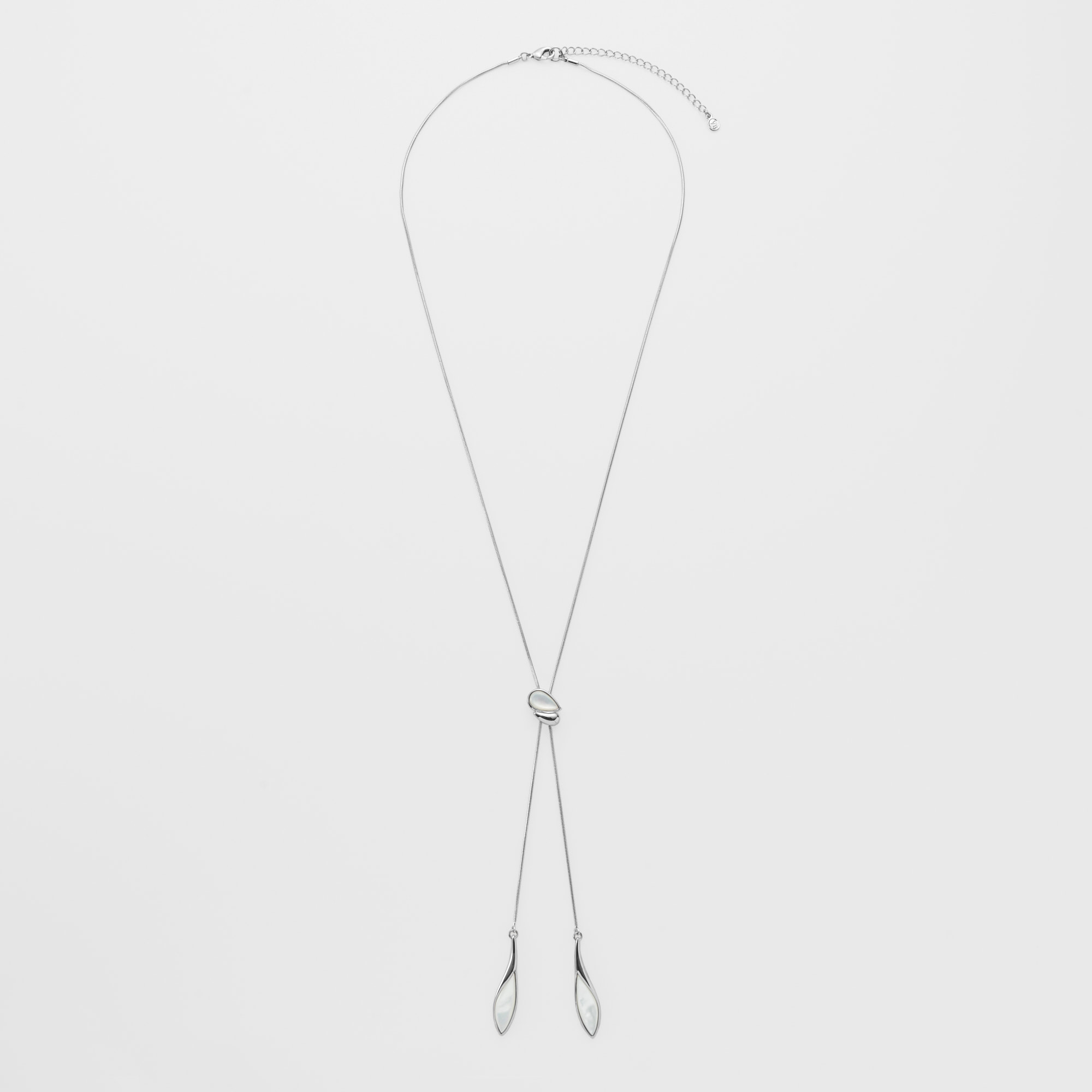 流れるような柔らかなラインと白蝶貝のゆらめく虹彩が美しく溶け合うラリエットネックレス。