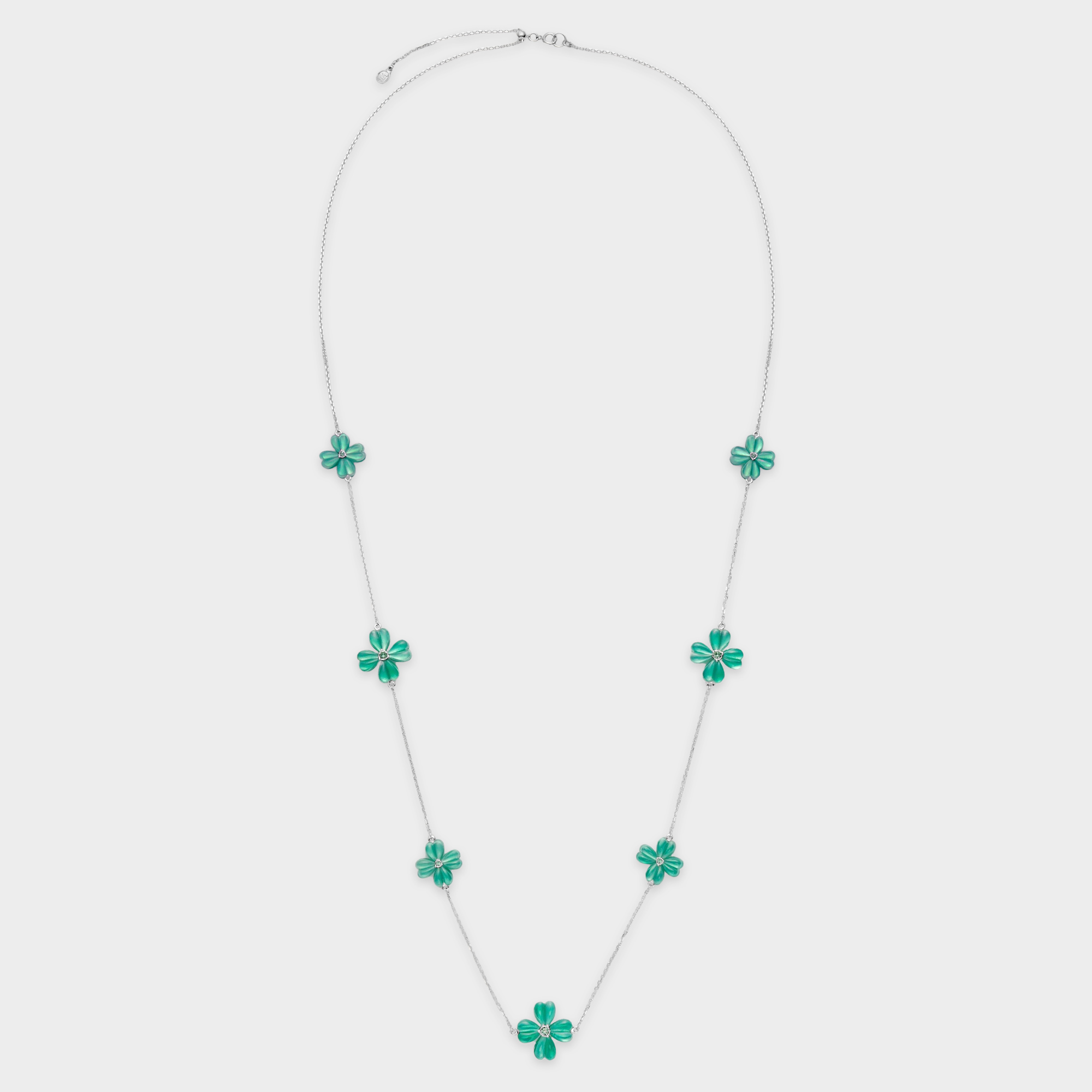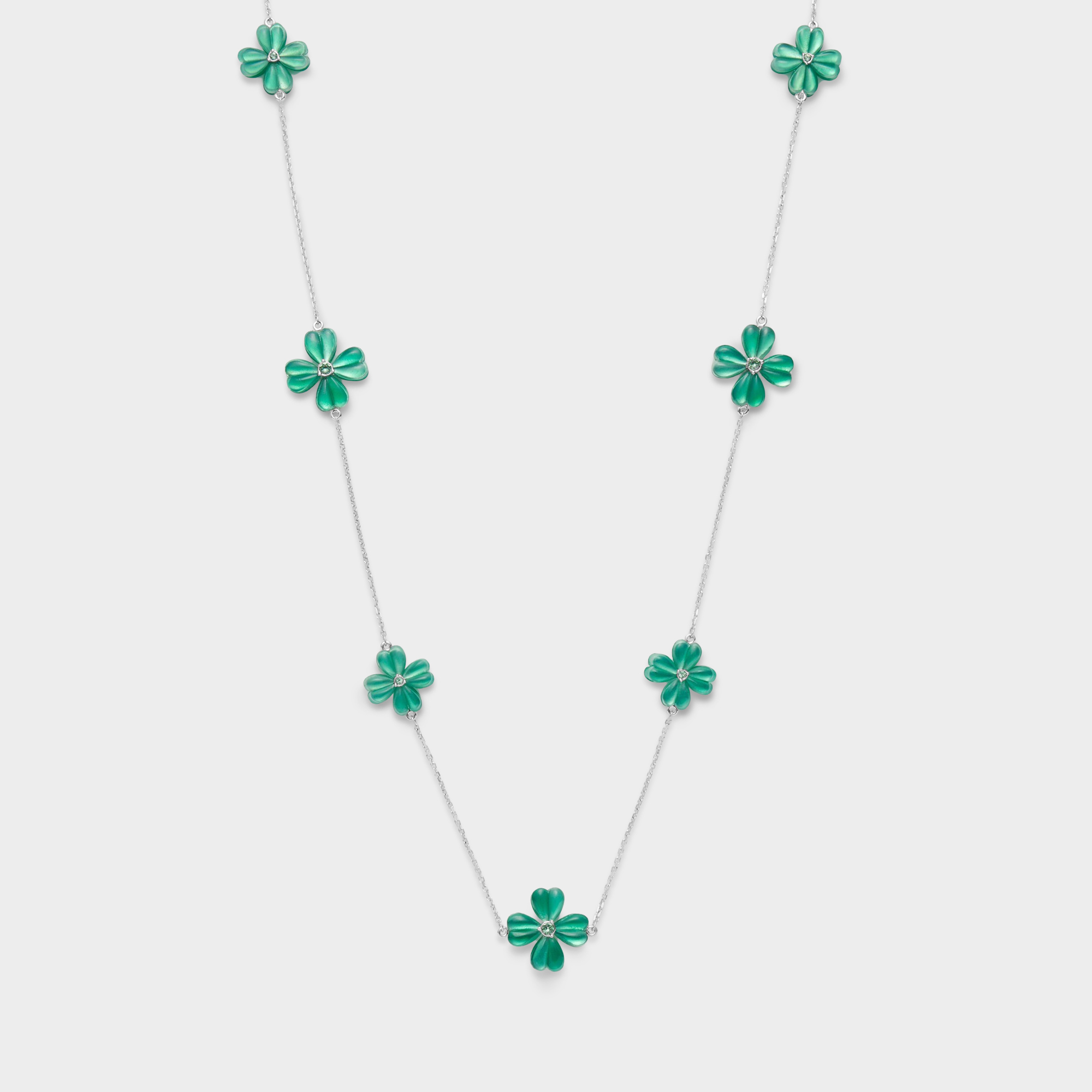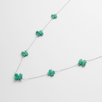 グリーンカルセドニーの鮮やかで透明感のあるグリーンと、愛らしいクローバーのフォルムがマッチした、ノーブルな魅力溢れるデザイン。