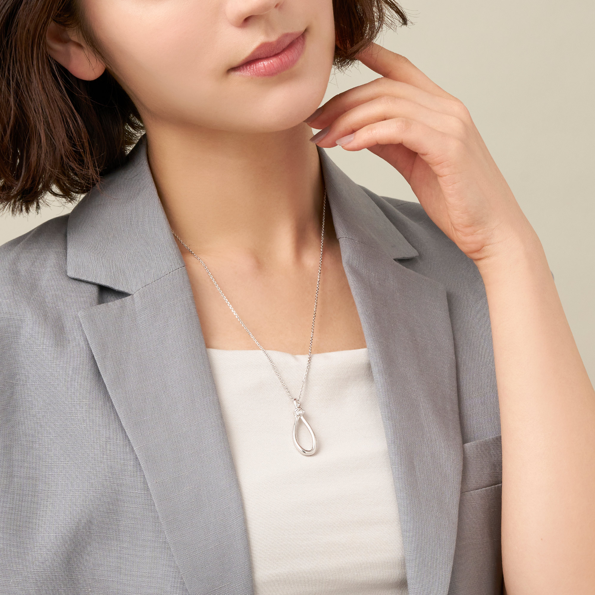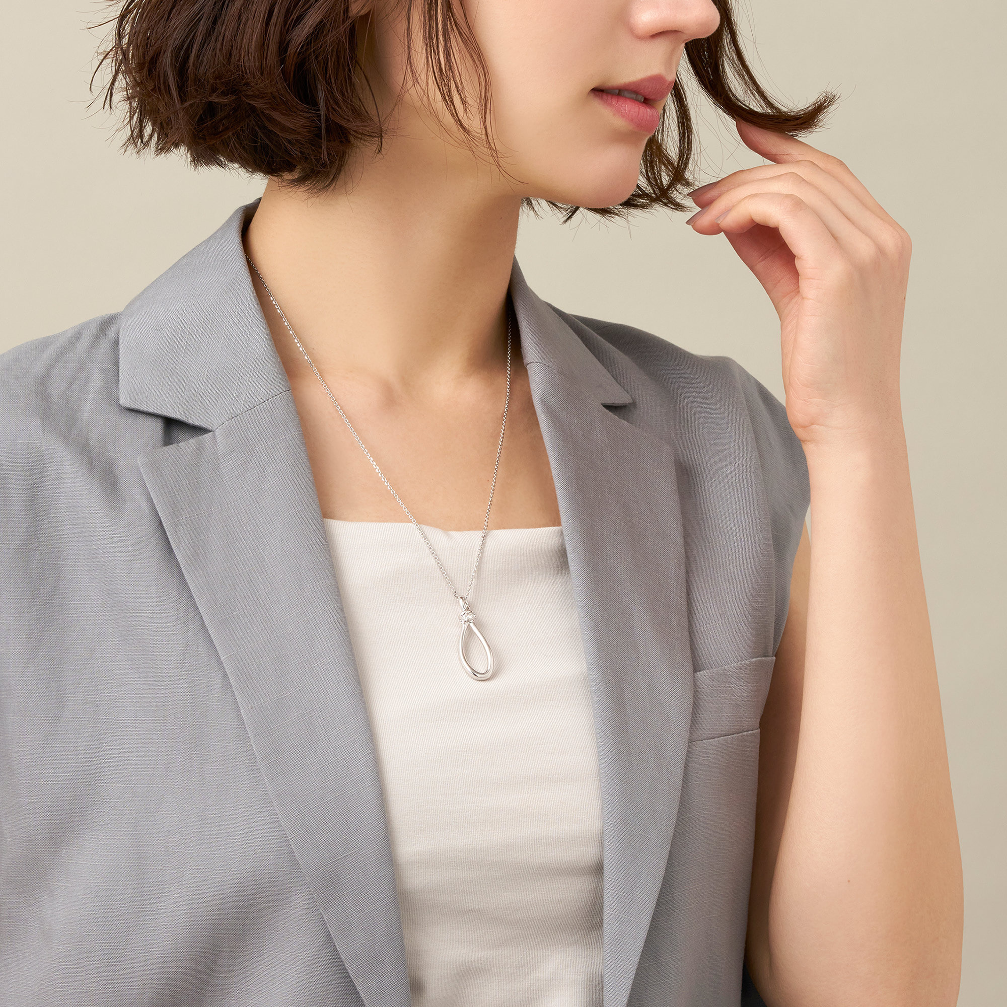 オーガニックなフォルムが美しいネックレス。メタルの線をきゅっと結んだような、柔らかなシルエットが魅力です。カットガラスの輝きが華やかさをプラス。程よいボリューム感で、さまざまなスタイリングのアクセントに活躍するアイテムです。