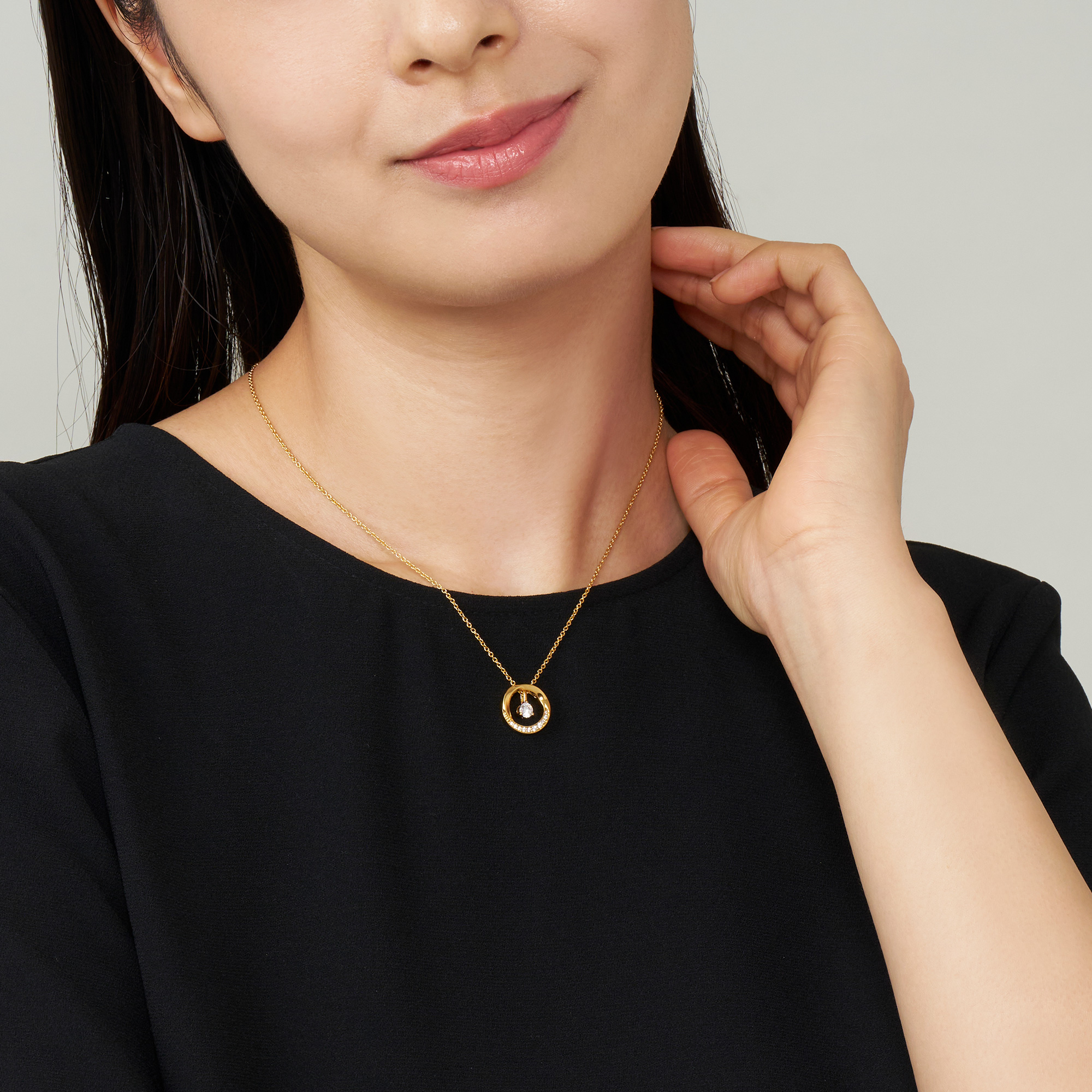 サークルのパーツと中央にセットされた大きめの1粒石のキュービックジルコニアは、取り外してそれぞれシンプルなネックレスとしてもお着けいただけるチェンジャブルデザイン。