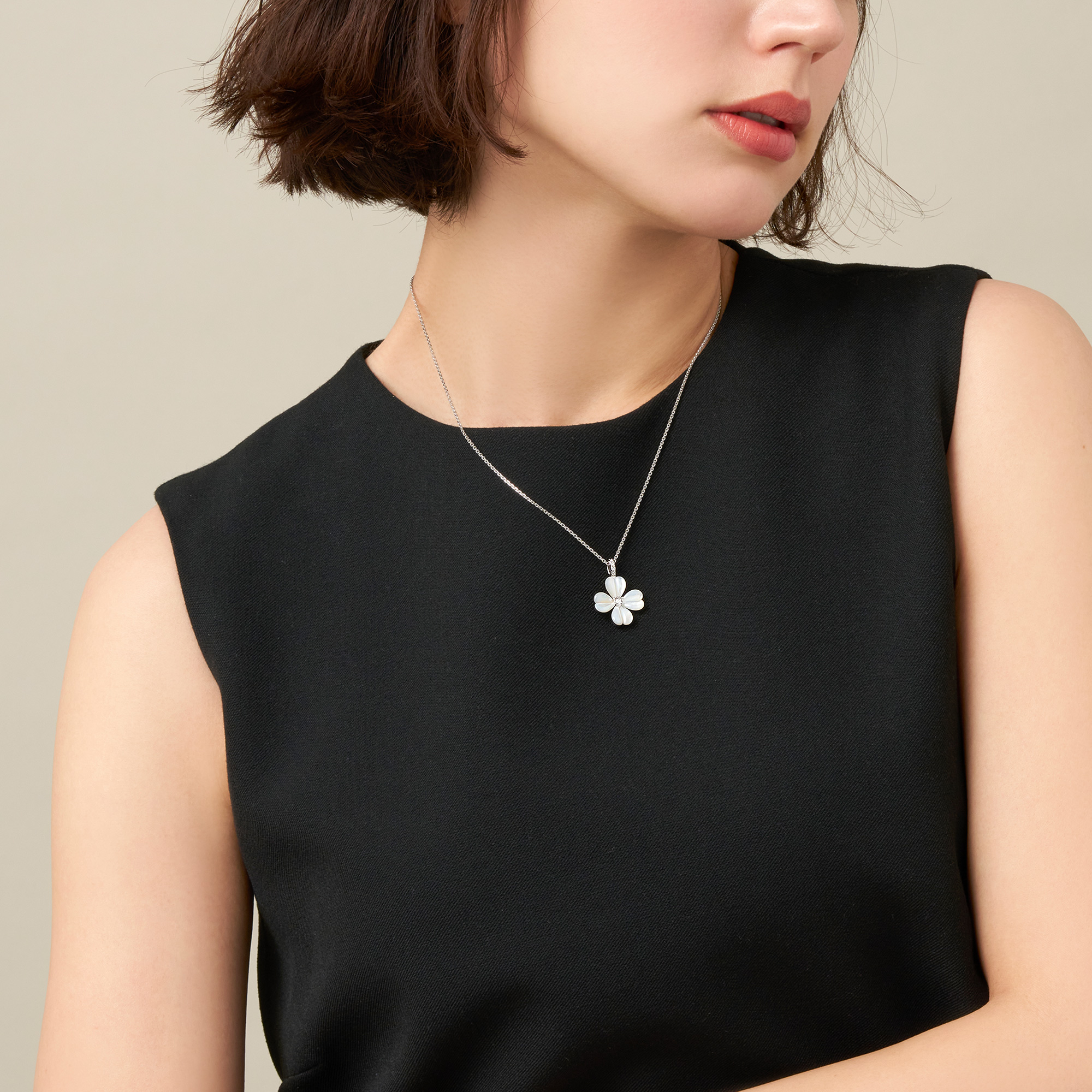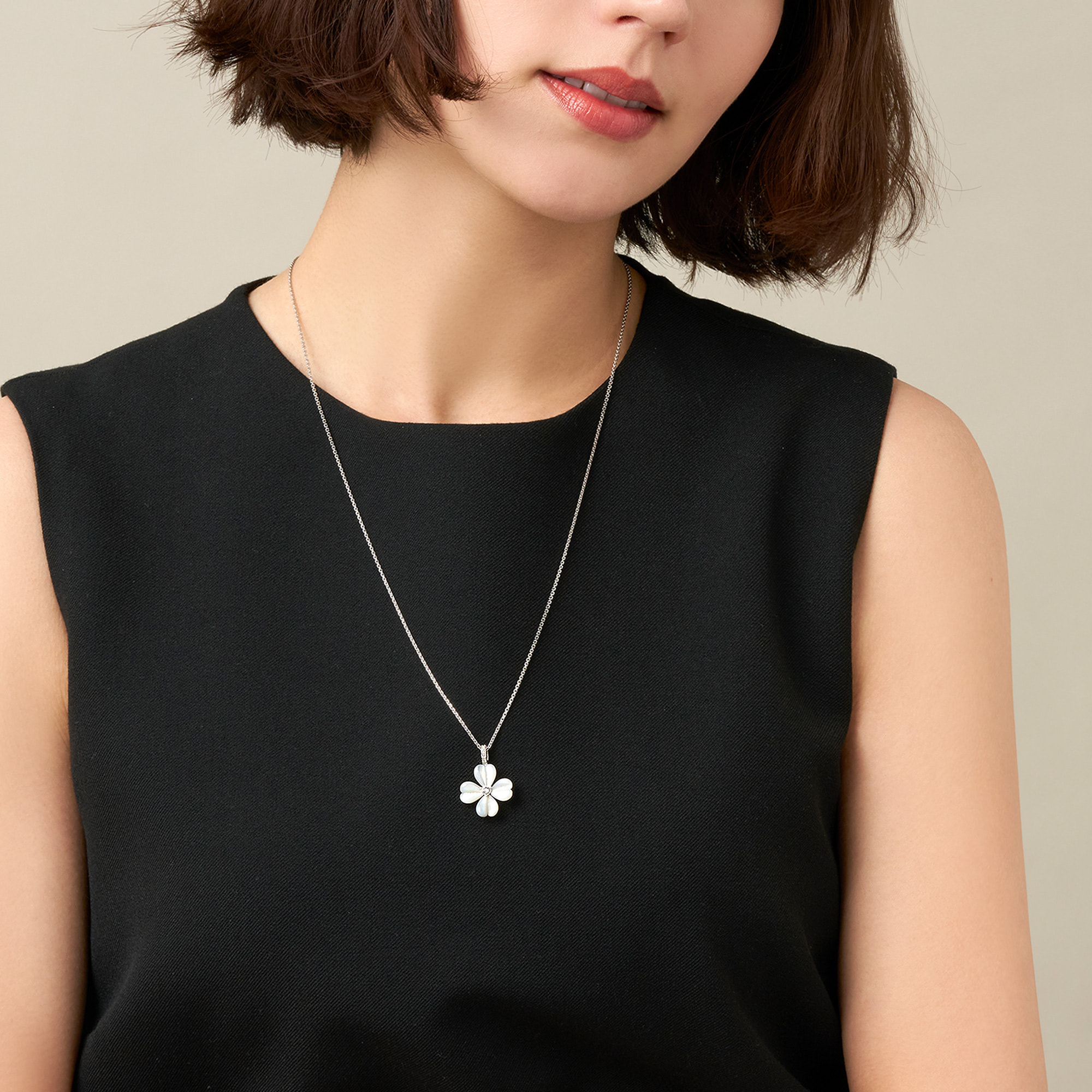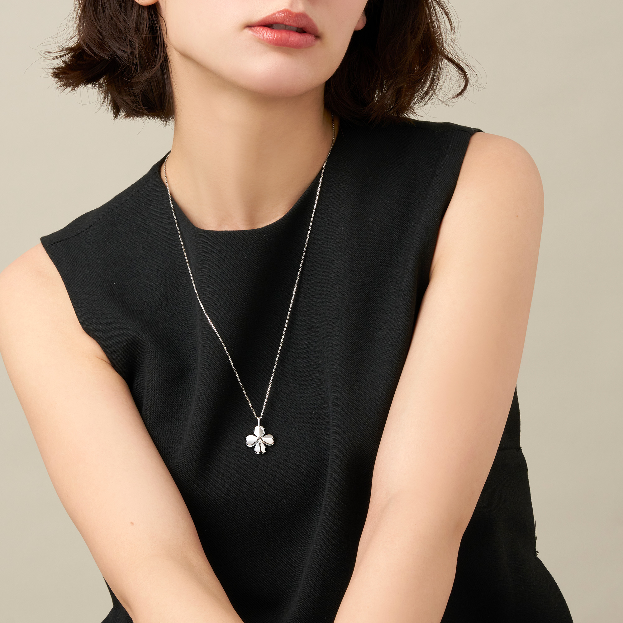 白蝶貝ならではの奥行きあるホワイトカラーに、愛らしいクローバーのフォルムがマッチした、ノーブルな魅力溢れるアイテムです。