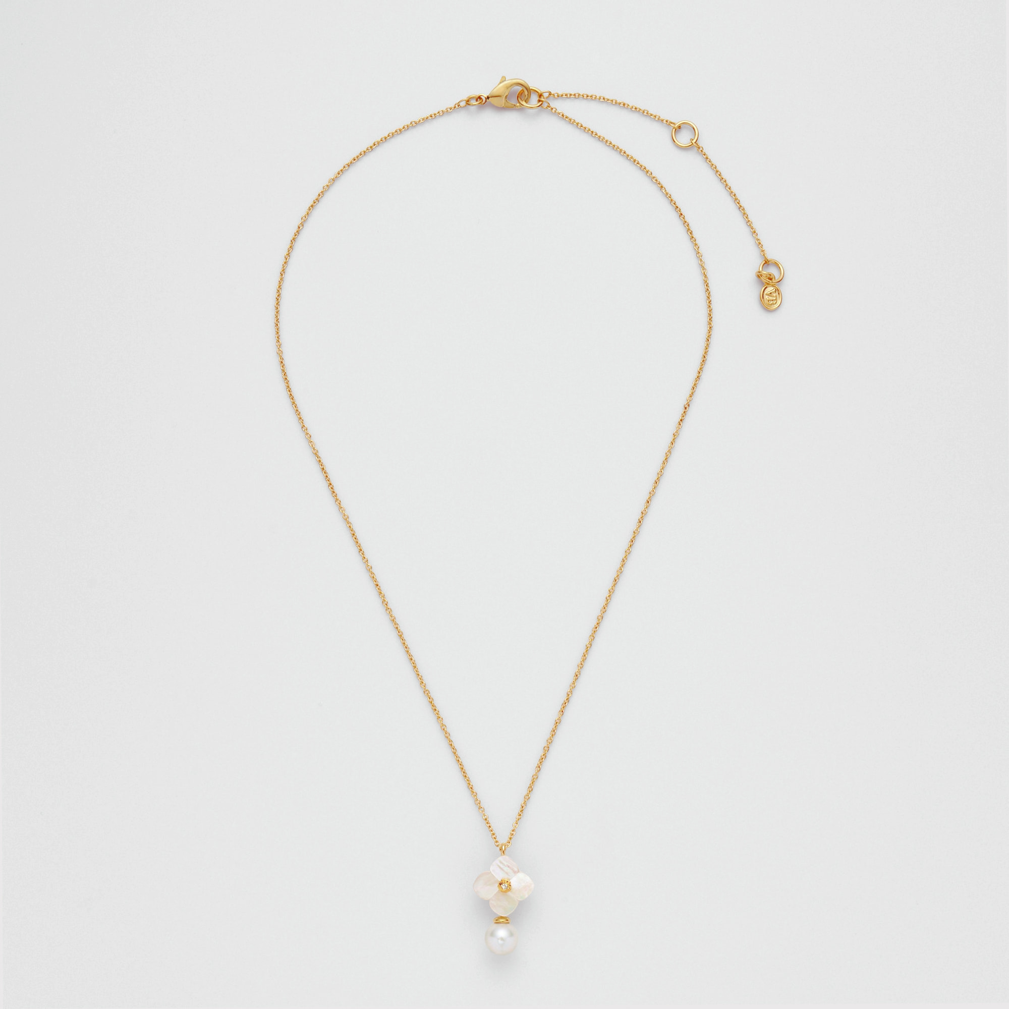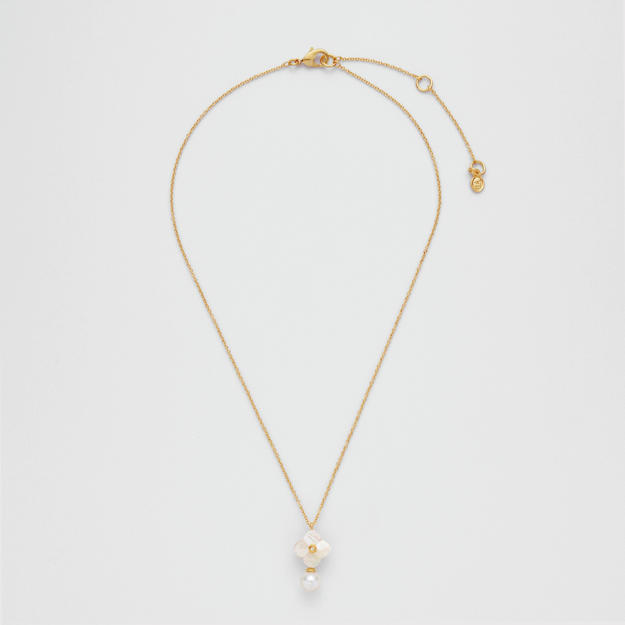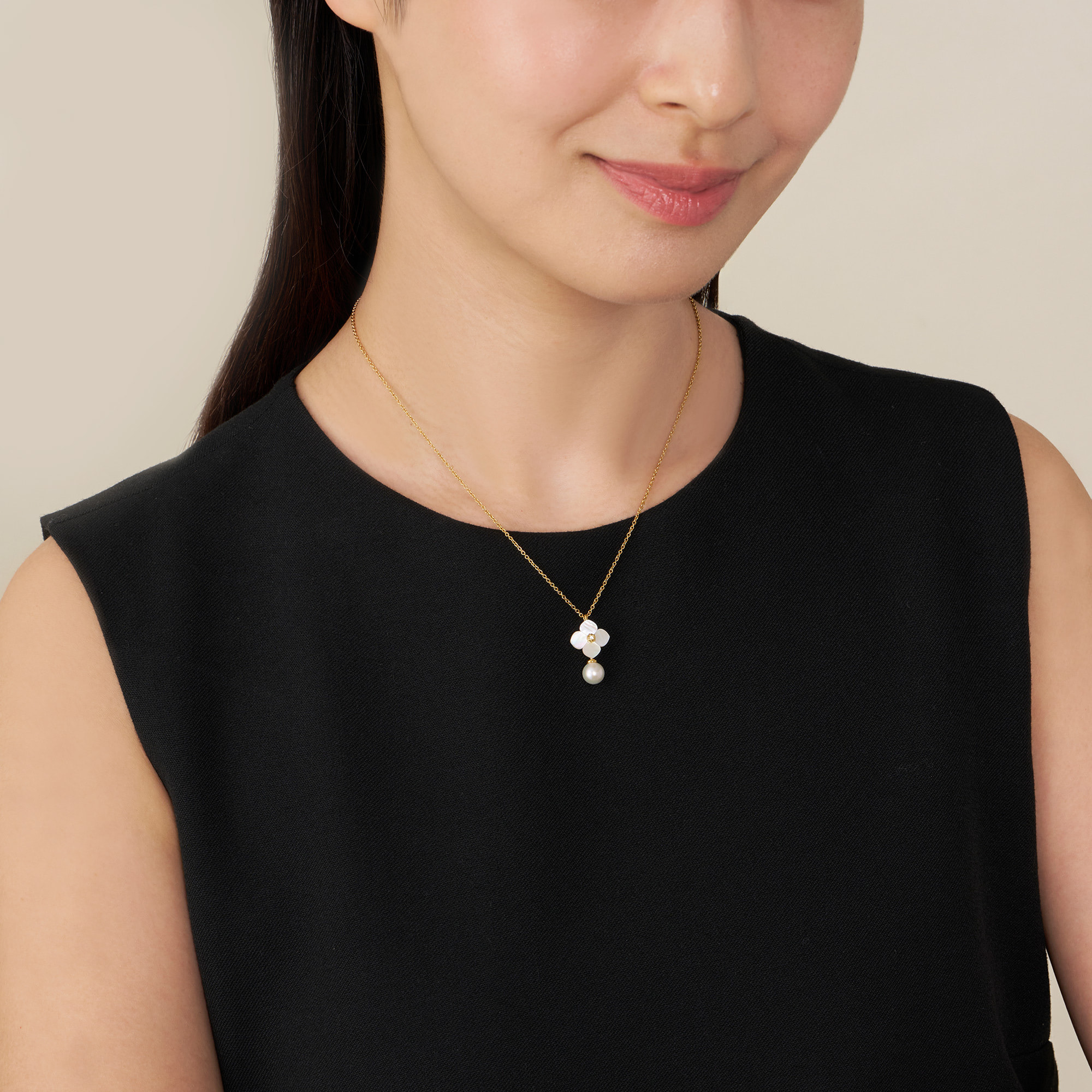 1つ1つ丁寧にかたどった白蝶貝の可憐な輝きに、淡水パールの優しい光沢がマッチ。
