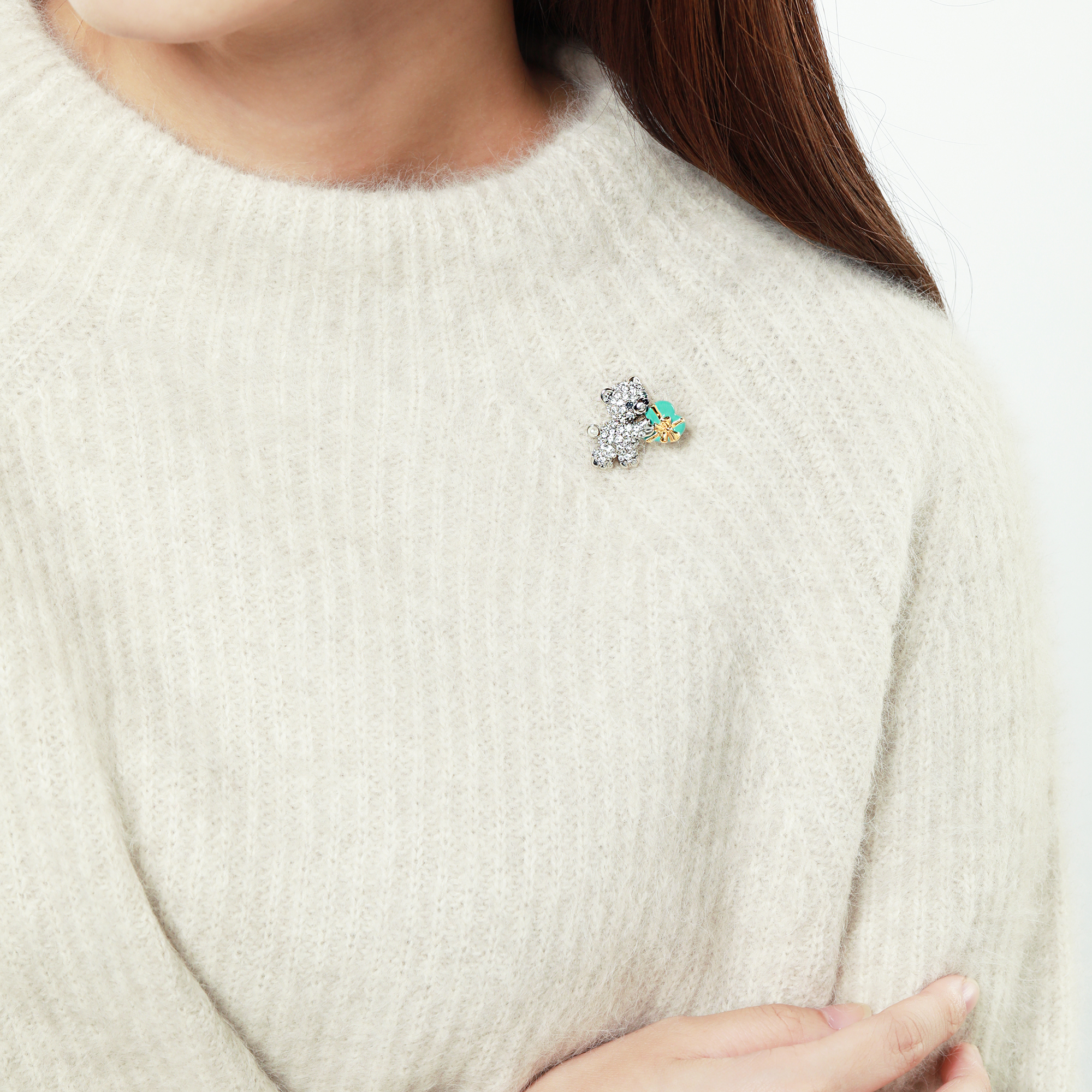 ミントブルーのハートのギフトボックスを抱えたベアのブローチ。プレゼントするときのワクワクしたハッピーな気持ちを小さなブローチに込めました。キュートな表情と仕草が愛らしく、身につけるだけでほっこりとした気持ちになります。ギフトにもぴったりなモチーフです。