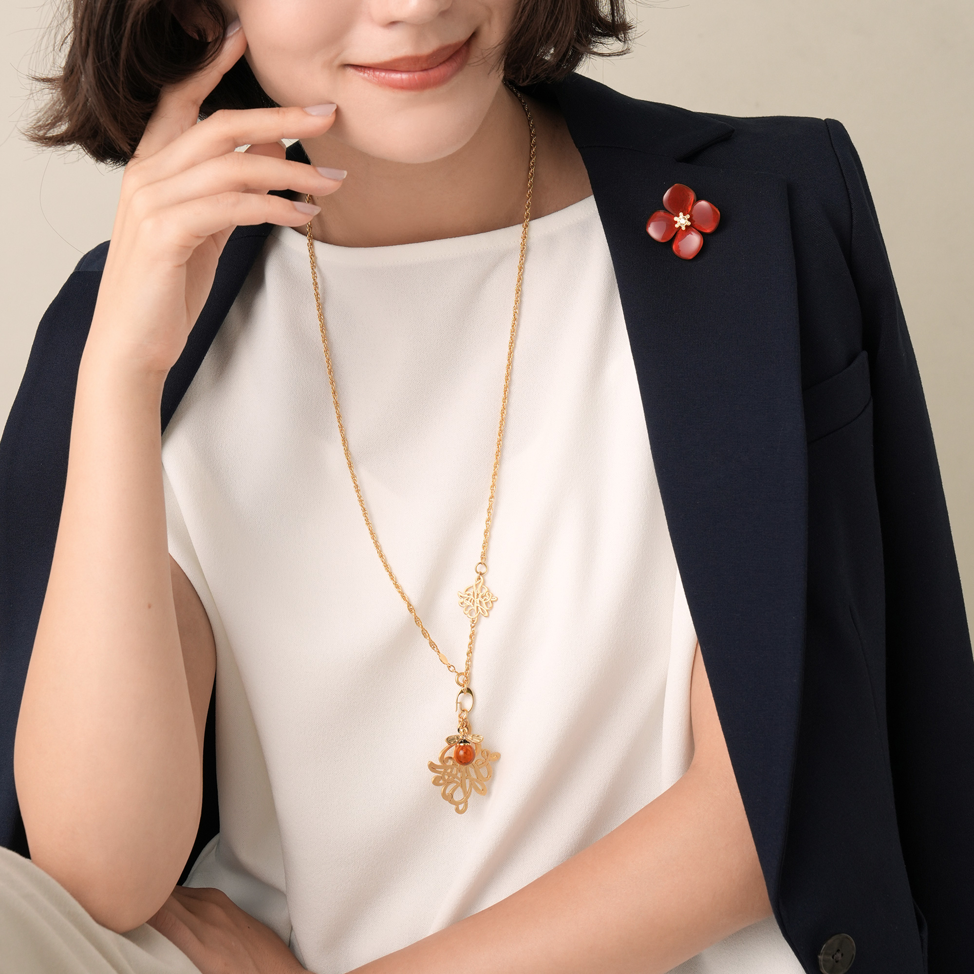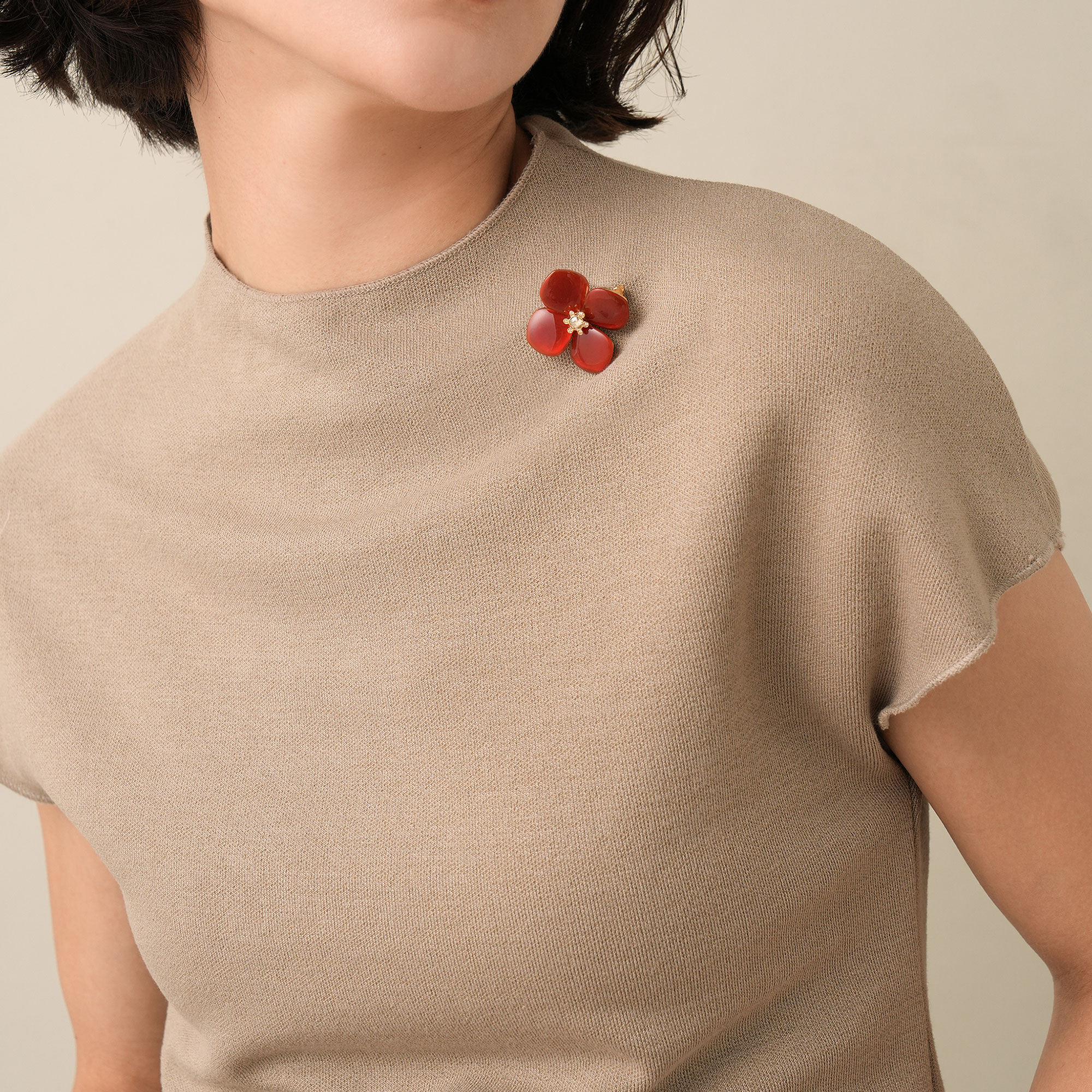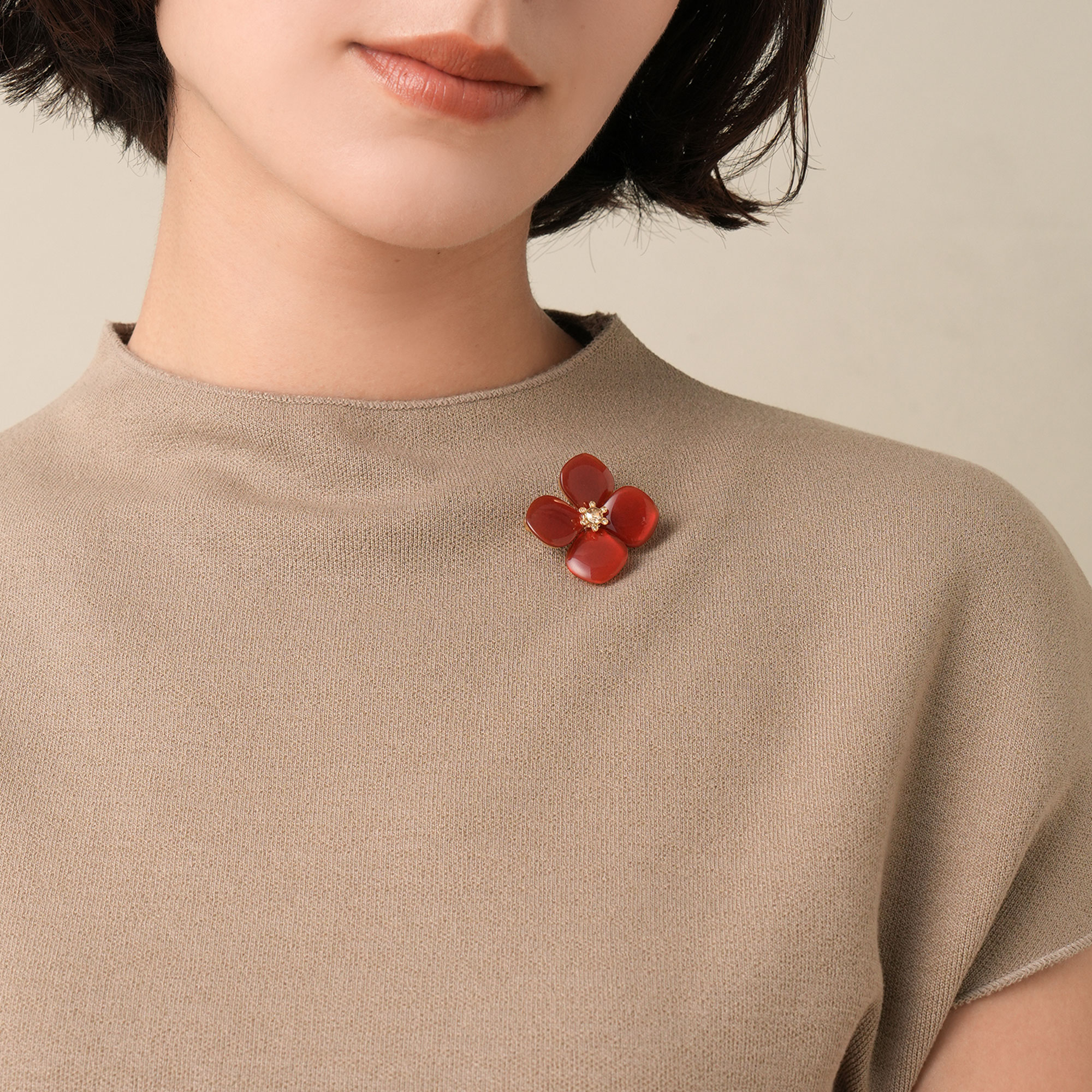 天然石ならではのニュアンスあるレッドカラーが、フラワーモチーフの甘さをマイルドにし、大人エレガントな雰囲気を演出。