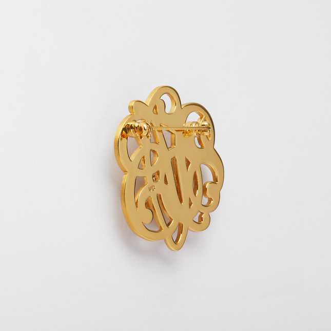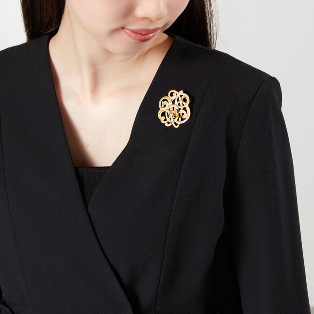 クラシカルなタイポグラフィーモチーフのブローチ。50周年を記念し、ブランドロゴのVBと数字の50がかくれんぼしているようにデザインしました。大人っぽい印象のマットゴールド仕上げです。キラキラと輝くミツバチがアクセント。ハチは巣の中にたっぷりと蜜を蓄えることから、金運アップの象徴と言われるラッキーモチーフです。