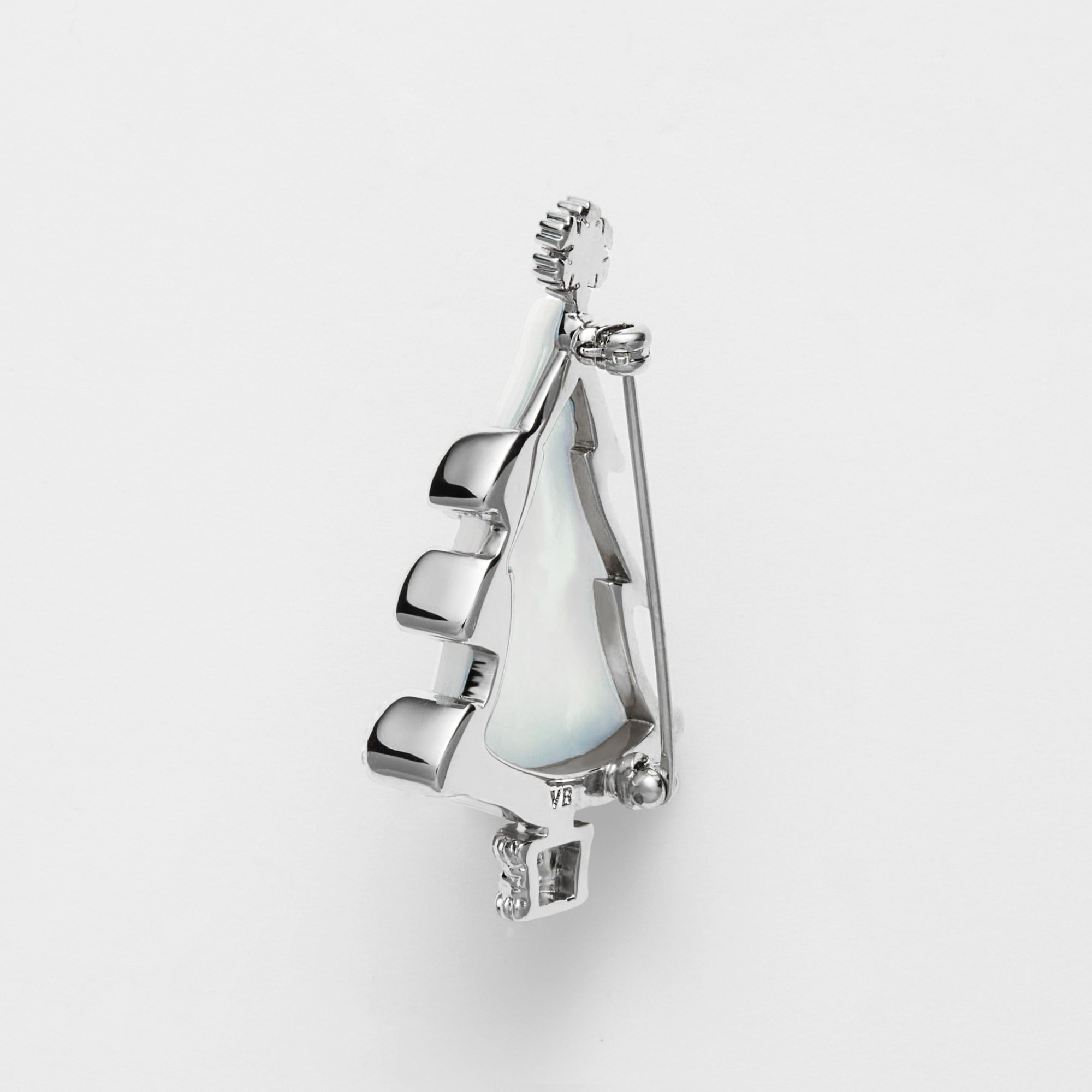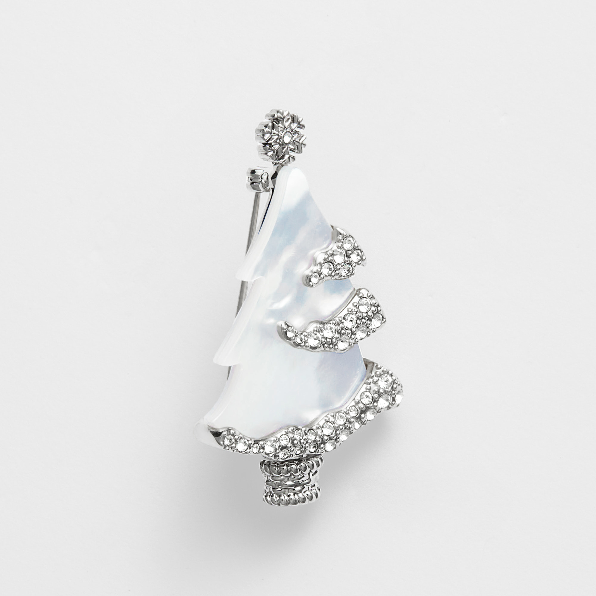 ホワイトクリスマスをイメージした、クリスマスツリーのブローチ。オリジナルカットの白蝶貝に、雪に見立てたカットガラスを散りばめました。虹色に輝く白蝶貝が、エレガントな大人のクリスマスを演出します。