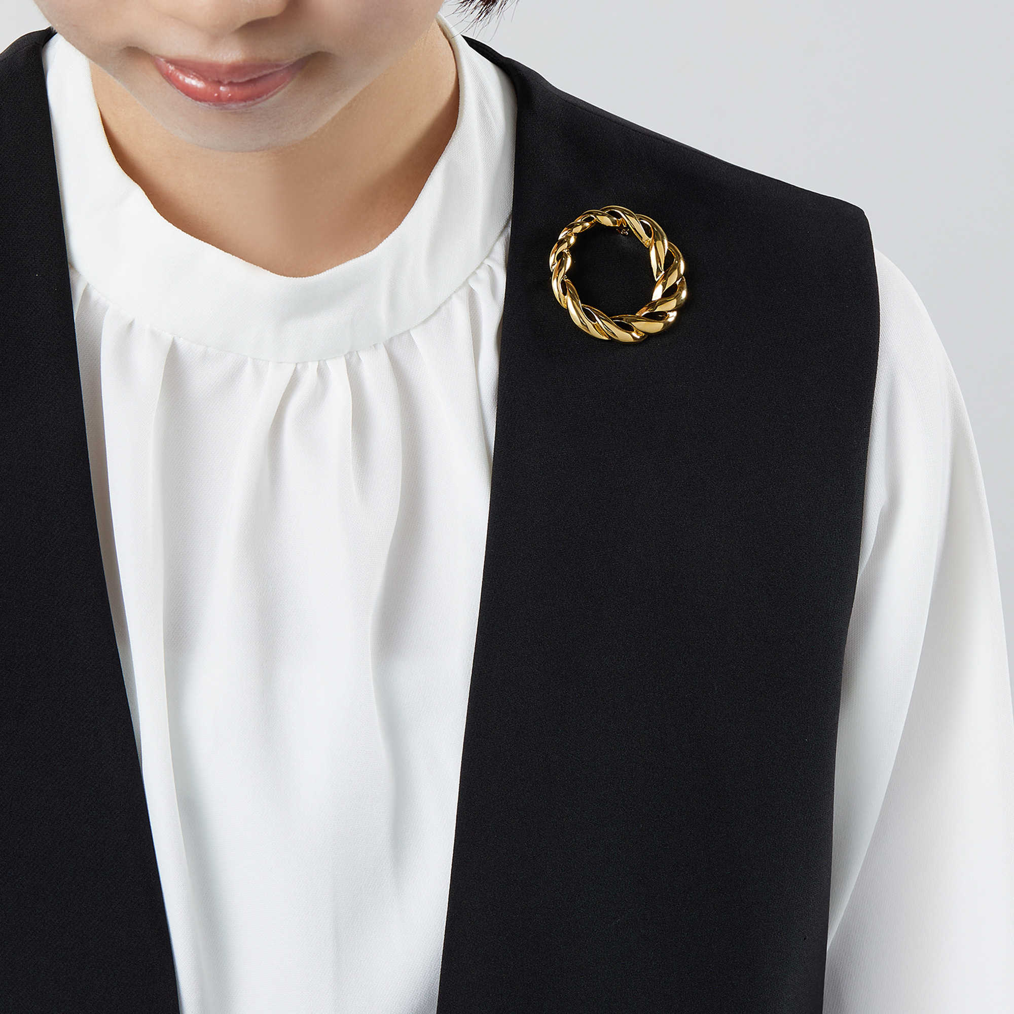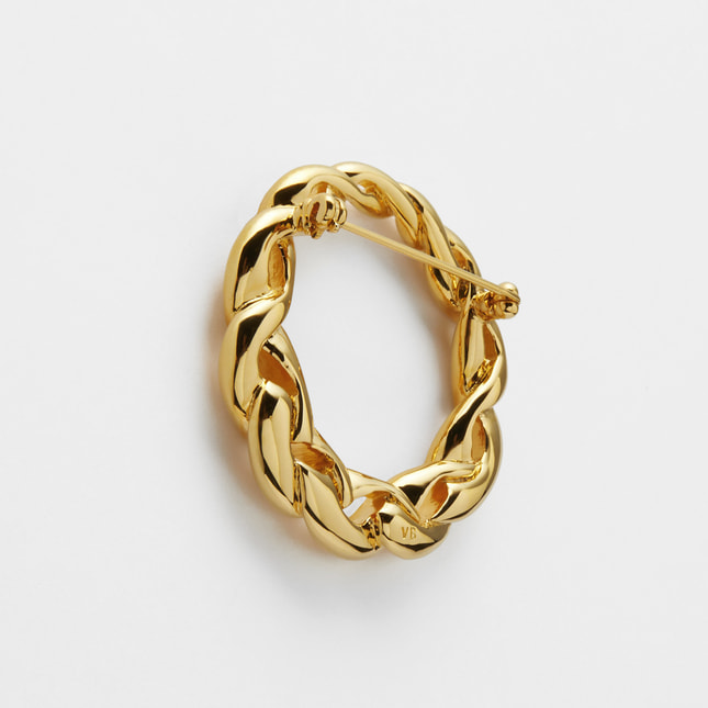 緩やかに編んだロープのような、優しいカーブの模様が魅力のブローチ。透かし部分が多いデザインですので、ボリュームはありながら軽やかな印象です。メタリックの華やかな輝きが、コーディネートのアクセントに。いつものスタイリングをエレガントにクラスアップします。