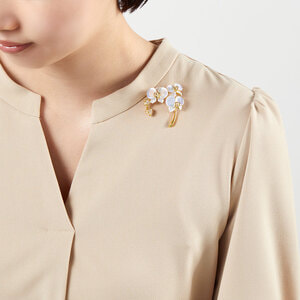 見る角度によって白蝶貝本来の柔らかな虹色の光沢が美しく、ふんわりとした立体感で胸元を大人エレガントな雰囲気に演出。