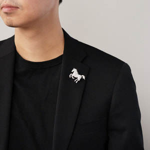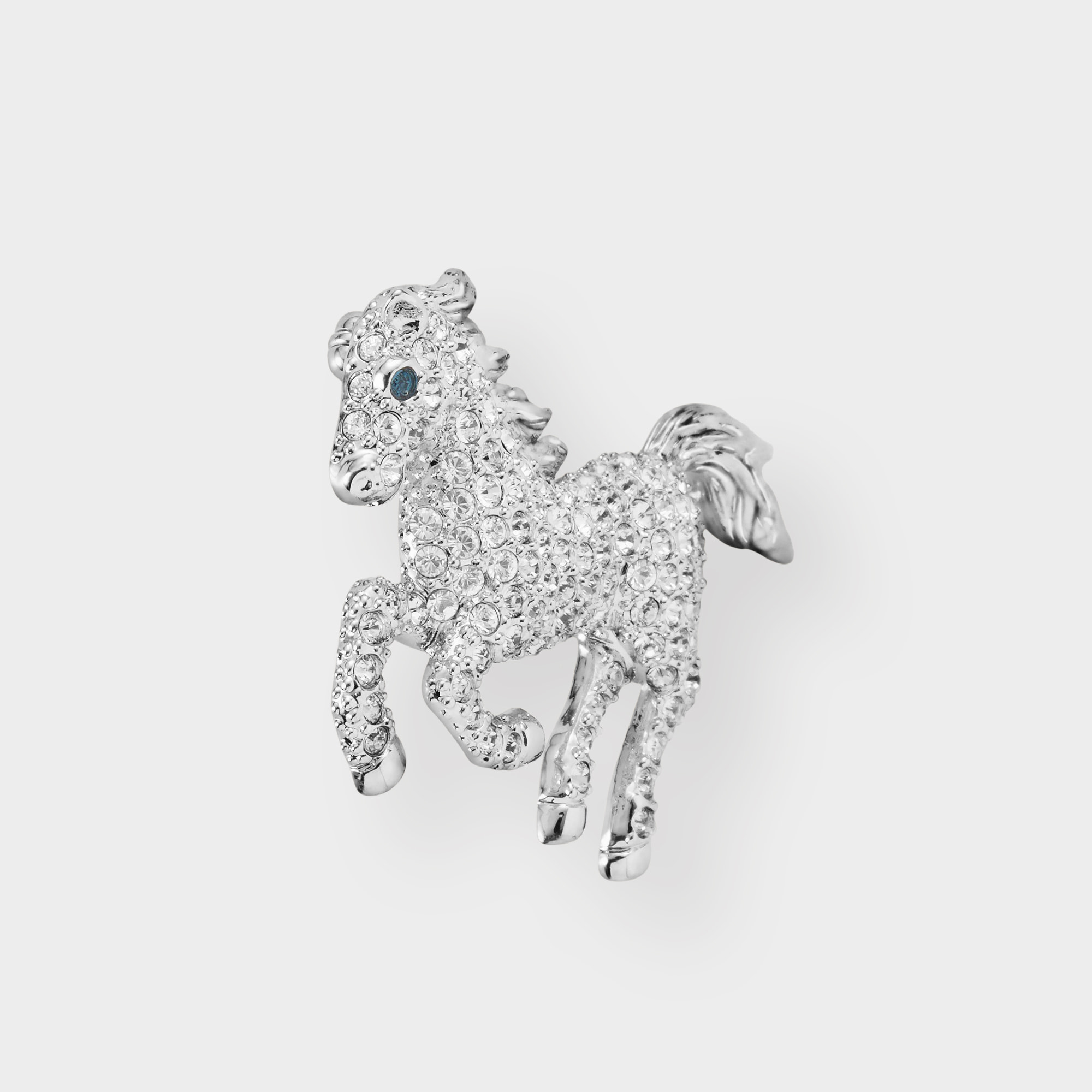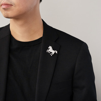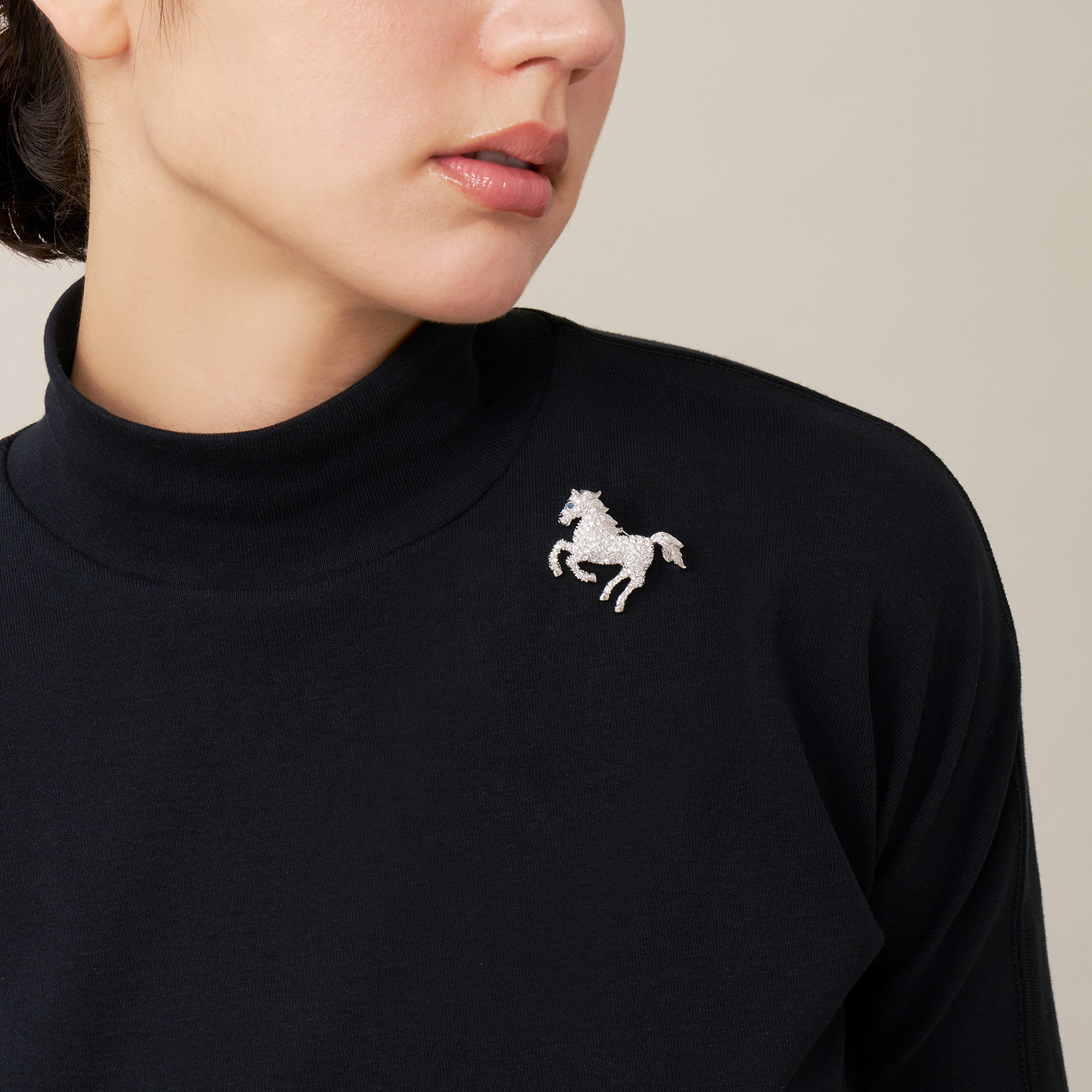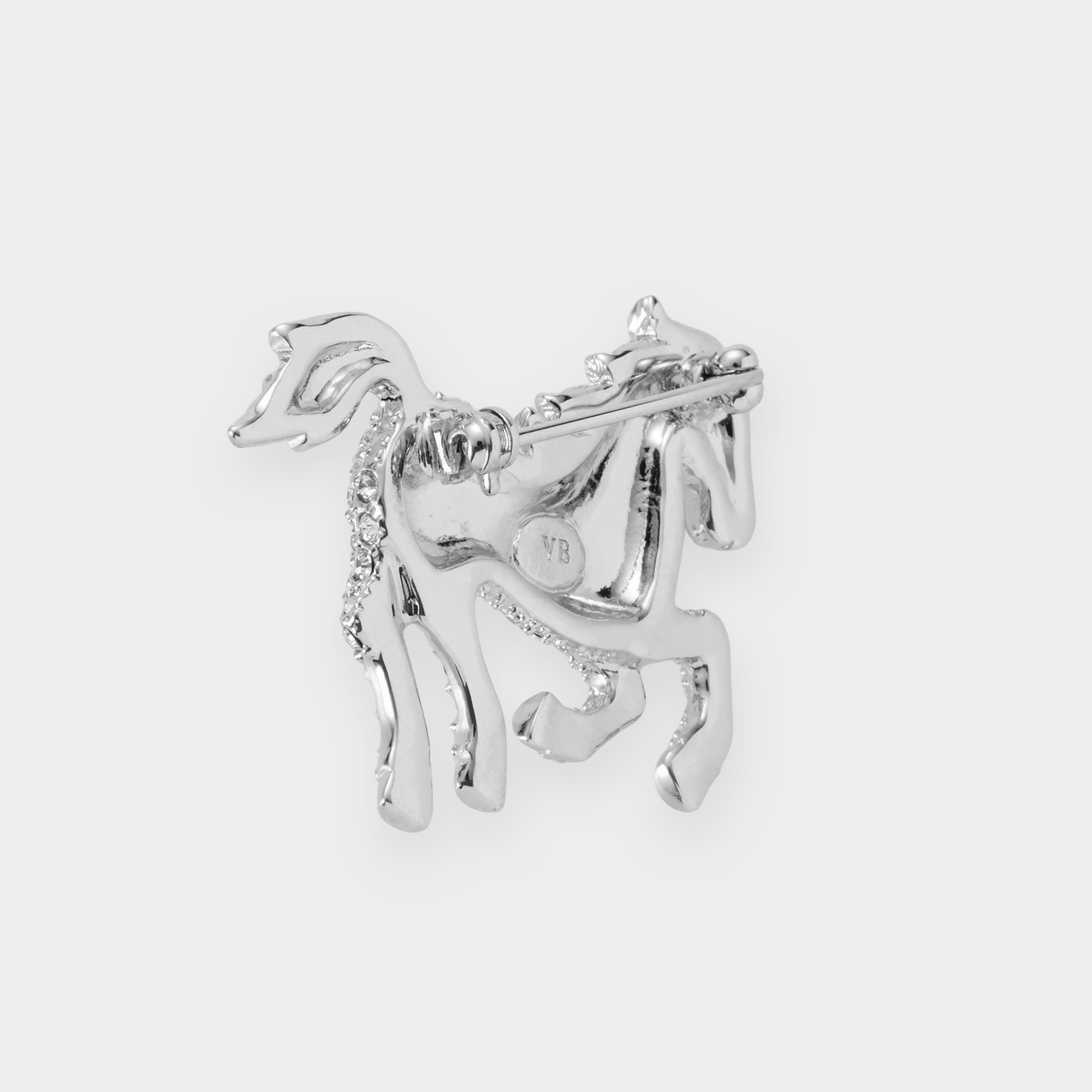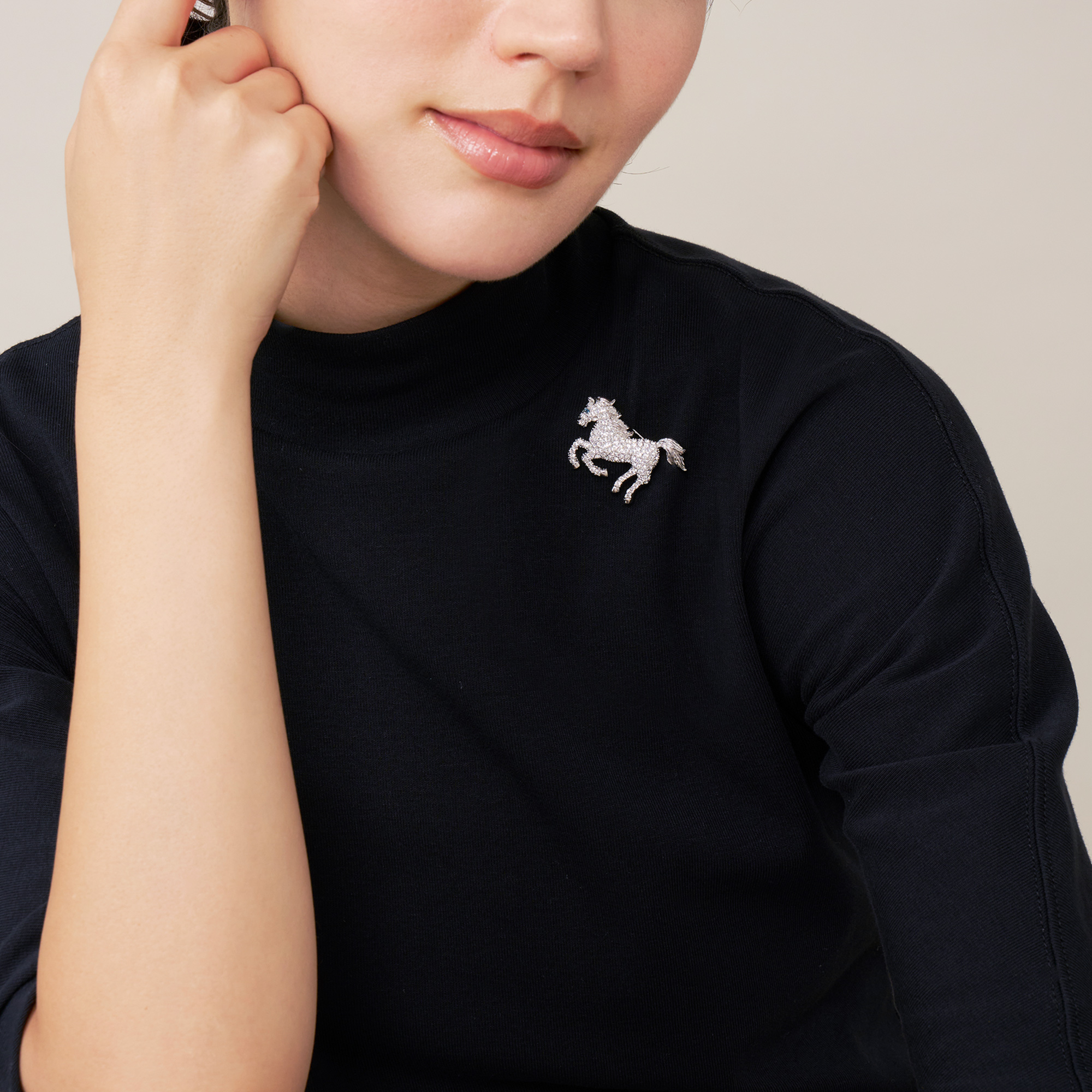 たてがみや尻尾の毛並みを生き生きとなびかせ力強く駆け回る、躍動感あふれる馬の姿を表現したブローチ。