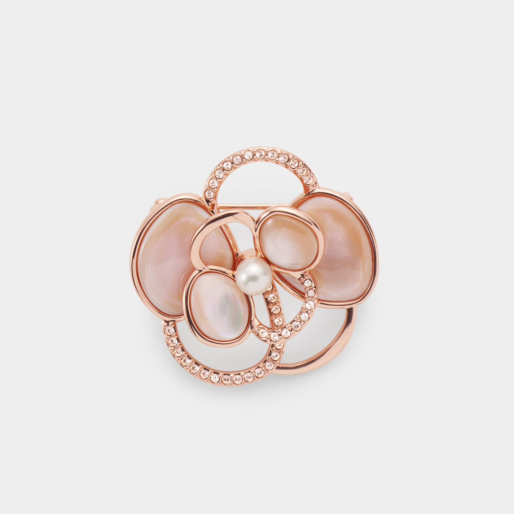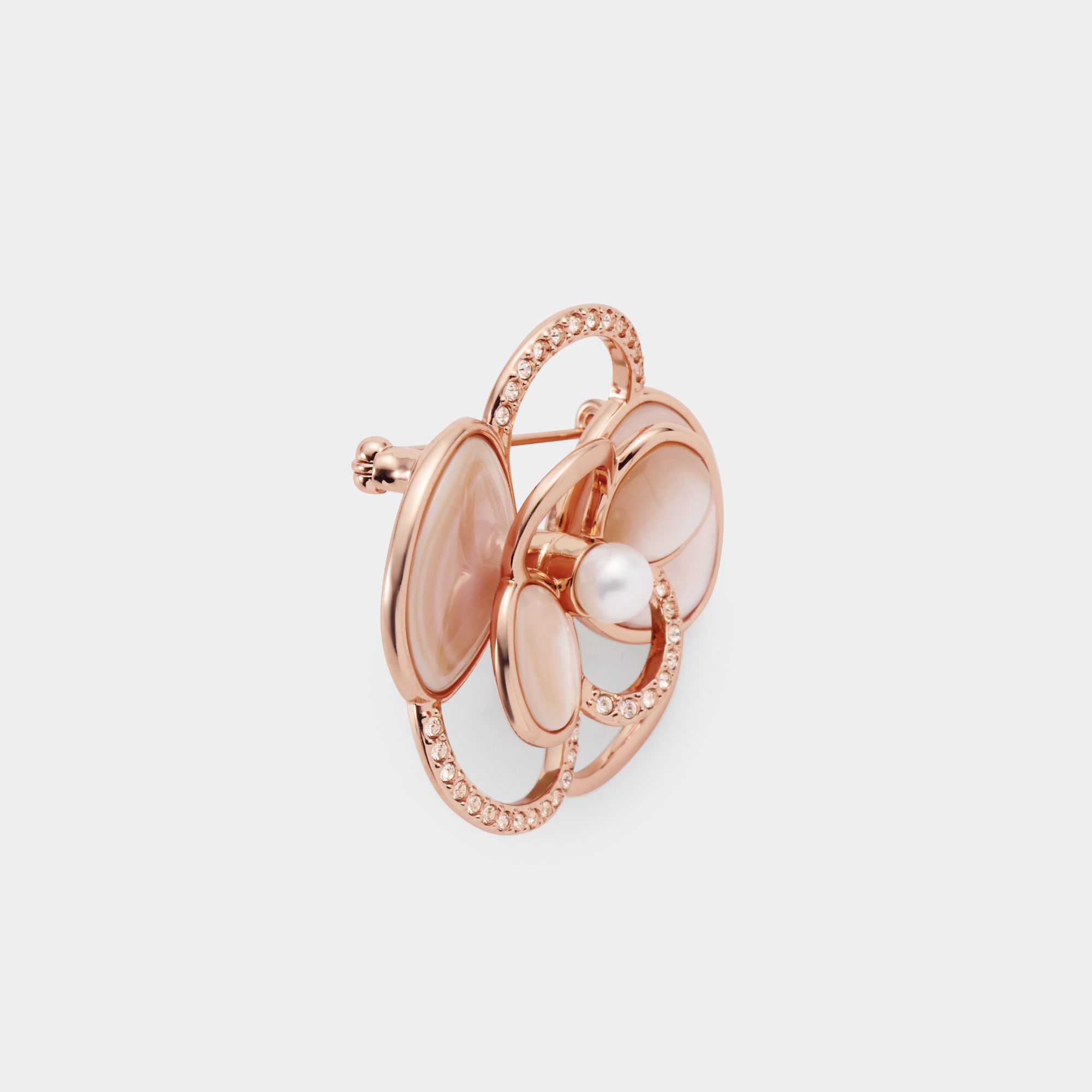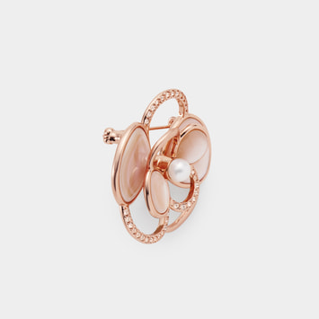 艶やかなシェルとカットガラスの繊細な煌めきが、胸元を美しく彩るブローチ。