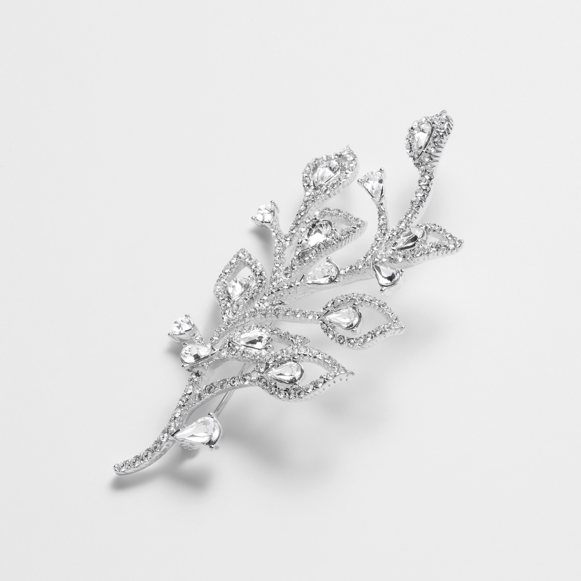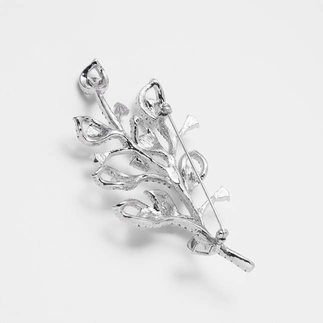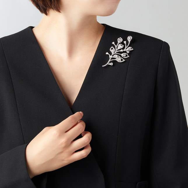 モダンテイストのボタニカルモチーフが印象的なブローチ。カットガラスの輝きが胸元を華やかに演出します。パッと目を引く大ぶりなデザインながら、繊細なフレームデザインで着け心地は軽やか。一つ取り入れるだけでスタイリングをクラスアップさせるアイテムです。