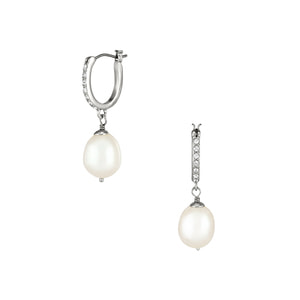 淡水パールが、上品に揺れるの高級感あふれるピアス。パールのリッチな光沢感に、カットガラスの繊細な輝きが華やかに耳元を飾ります。さまざまなシーンに活躍するピアスです。