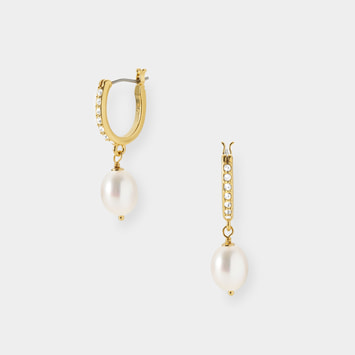 上品な光沢が美しい淡水パールに、カットガラスの輝きを添えたエレガントなピアス。