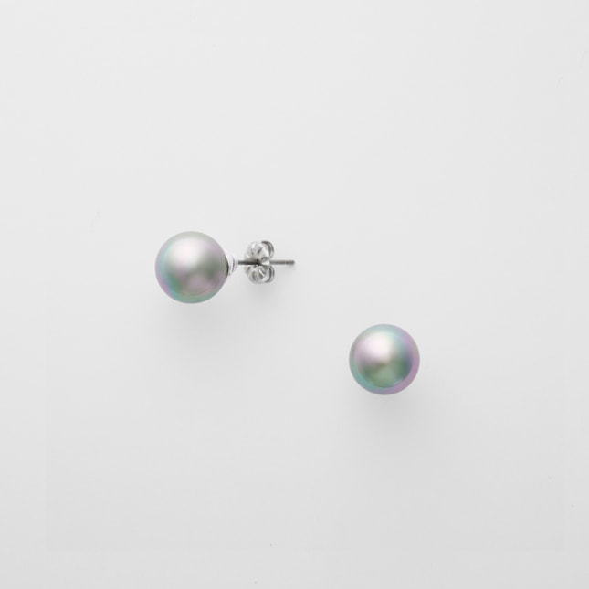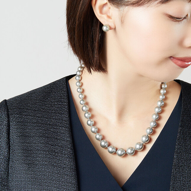 ネックレスは12mmから8mm珠のグラデーション、ピアスはコーディネートしやすい10mm珠を使用。