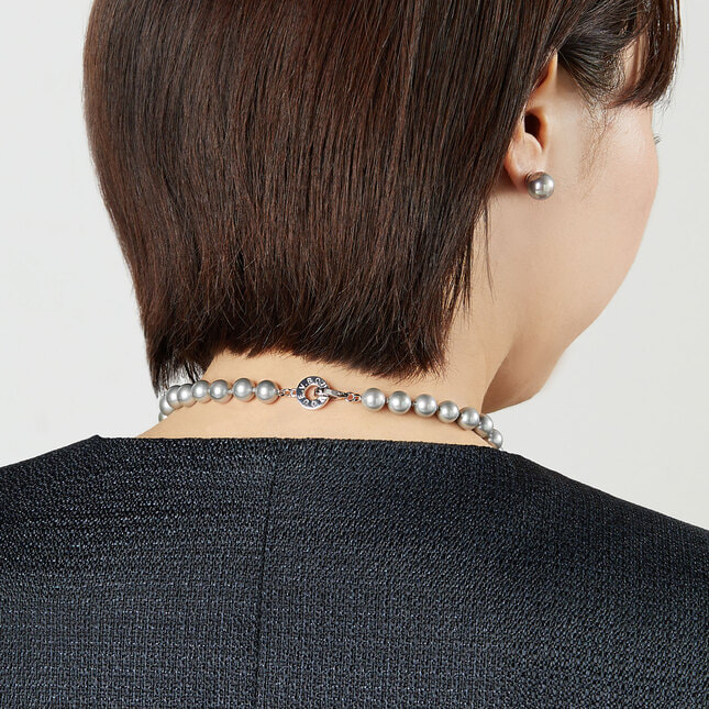 襟元に近づくにつれて粒が小さくなるグラデーションタイプのネックレスは、首周りをすっきりと見せる効果がある人気のデザイン。