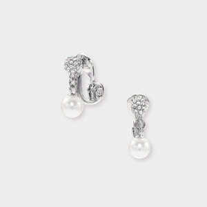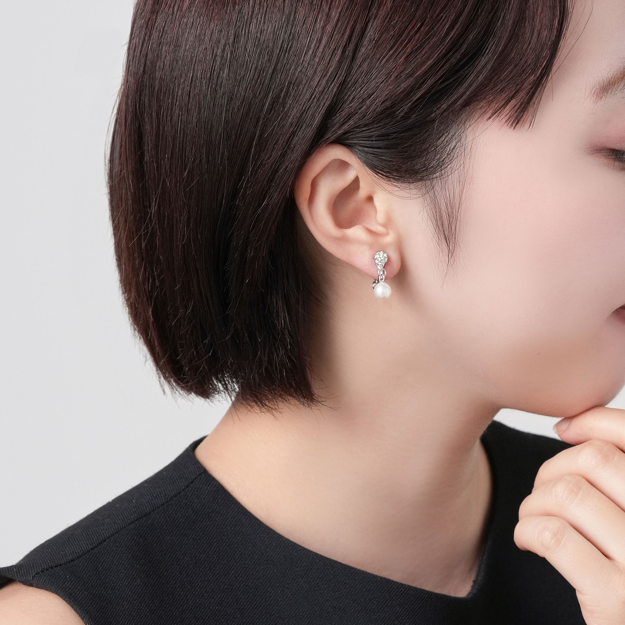 耳元で淡水パールが優しく揺れるイヤリング。淡水パールならではの柔らかな美しい光沢が、大人のエレガンスを演出します。パヴェボールに散りばめられたカットガラスの輝きが華やかさをプラス。程よいサイズ感で、デイリーからフォーマルシーンまでお使いいただけるイヤリングです。