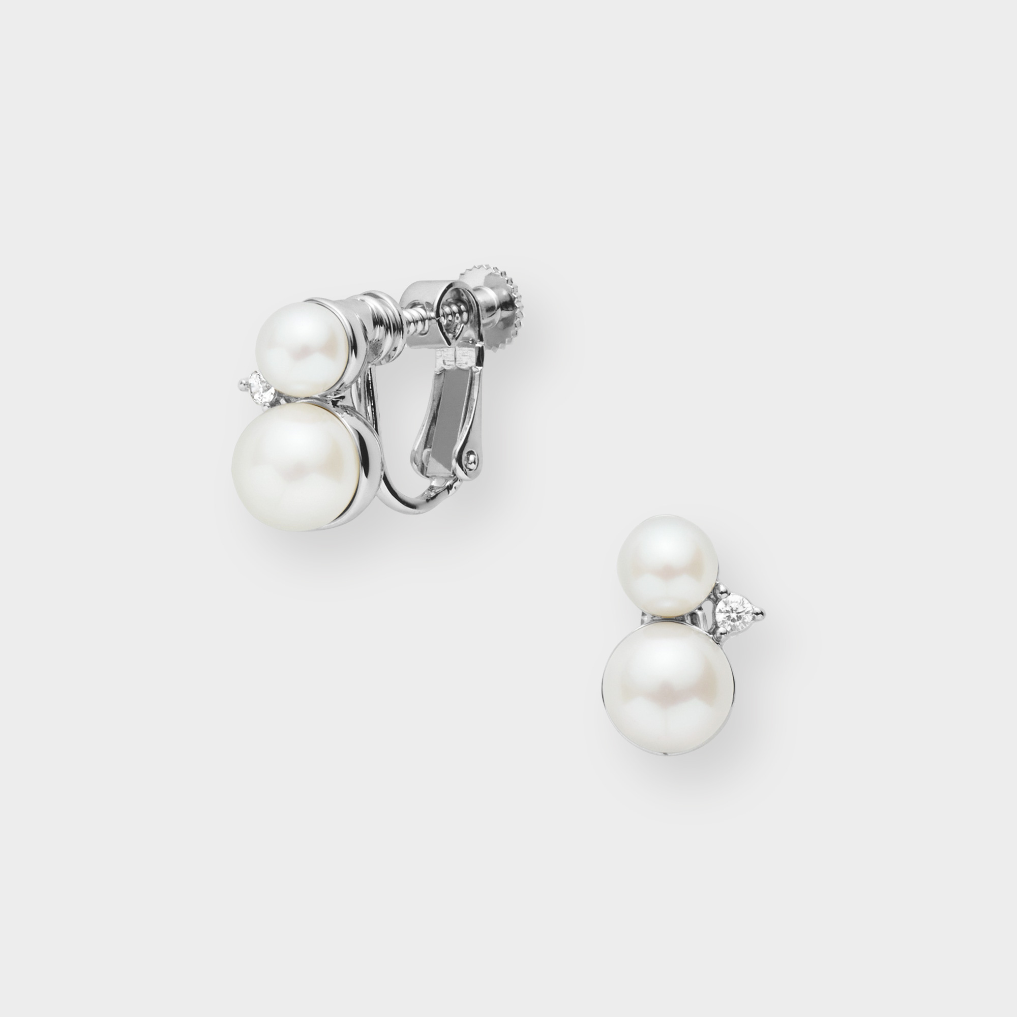 サイズの異なる2粒のパールとキュービックジルコニアをセッティングしたイヤリング。