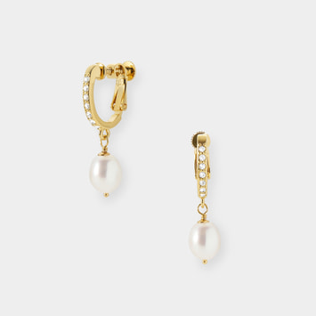 上品な光沢が美しい淡水パールに、カットガラスの輝きを添えたエレガントなイヤリング。