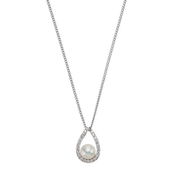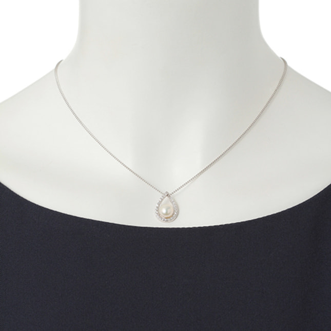 美しい光沢感と優しい風合いの淡水パールを、繊細に煌くキュービックジルコニアでドロップ型に囲みました。 控えめで繊細な輝きを放ちながら、その優れたデザイン性で上品で十分な存在感を感じられるネックレスです。