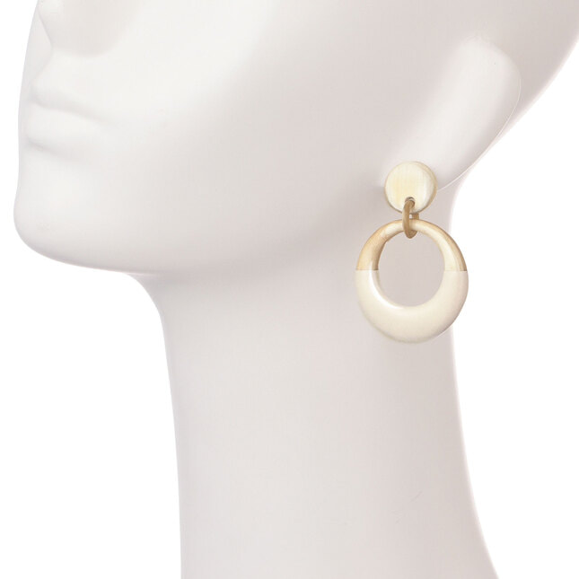 水牛ならではの自然な質感と色合いが魅力的なピアス。ナチュラルなホワイトカラーの水牛と水牛に真っ白な塗装をした、トーンオントーンの組み合わせがお洒落。存在感ありながらも軽やかに着けられ、耳元をスタイリッシュに飾ります。大人の女性に似合うアイテムです。※自然素材の為、色・サイズ等に個体差がございます。