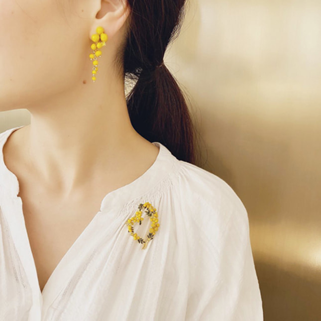 耳元で繊細にゆれるイエローカラーが春らしく、まるで本物のミモザを着けているよう。