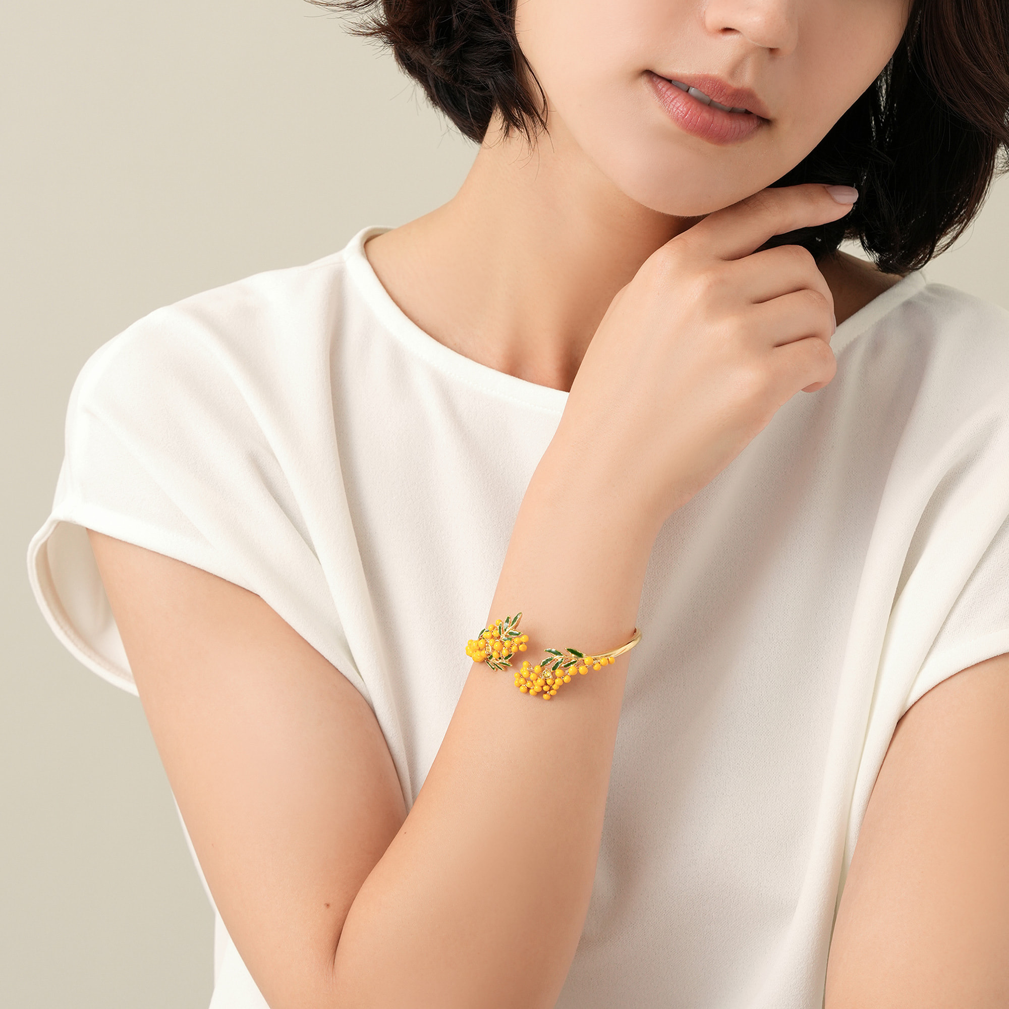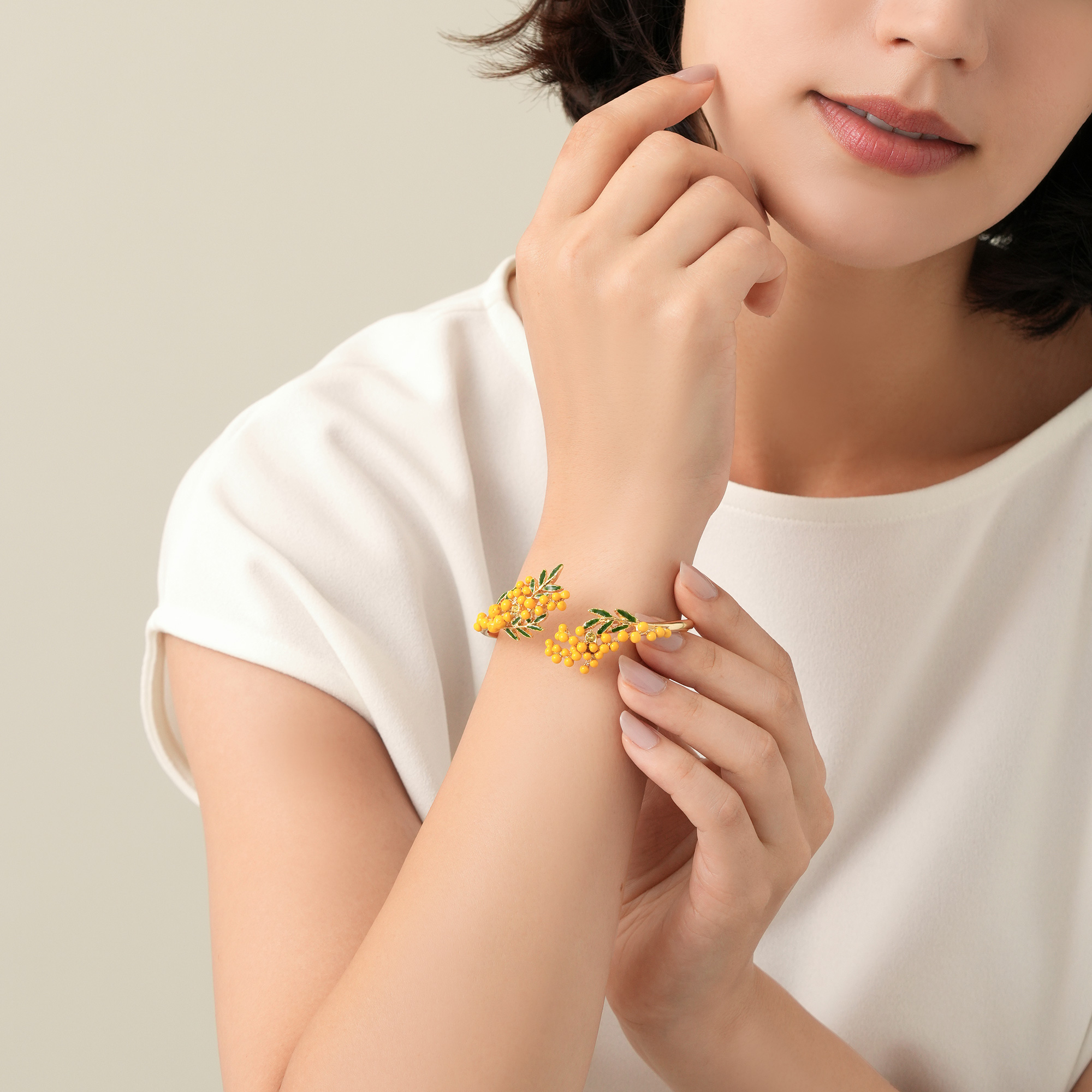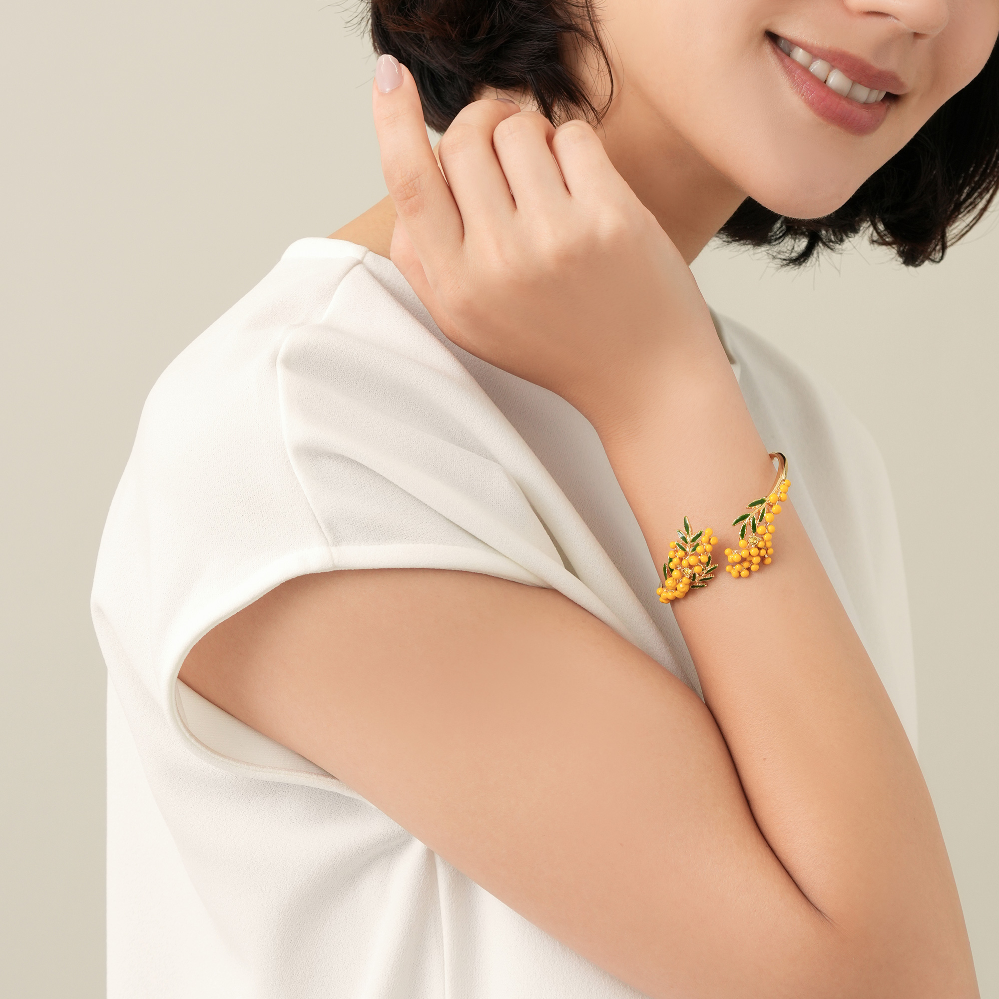 柔らかなカーブを上品に描いた瑞々しいミモザの花が、手首を上品に彩ります。