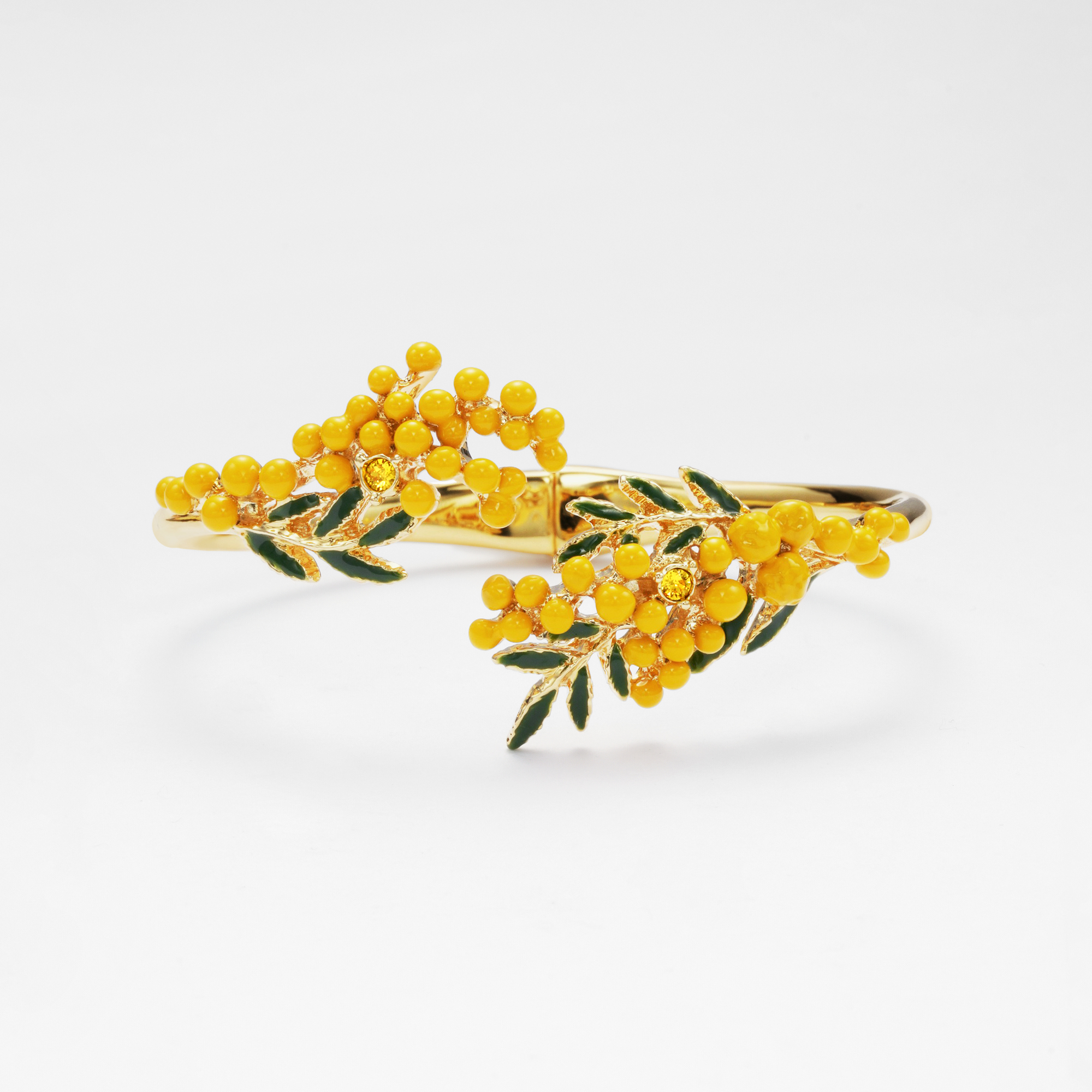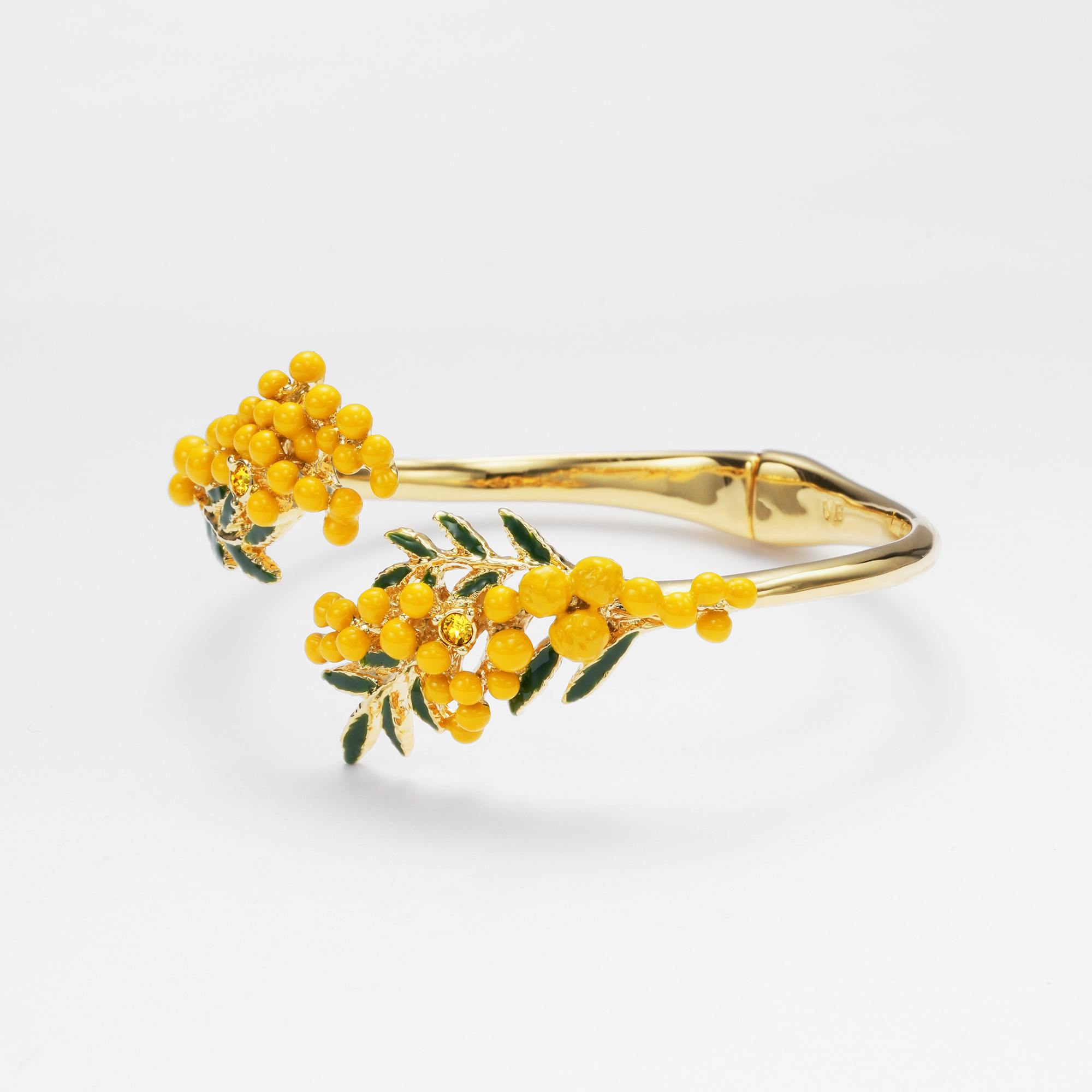 職人が一点一点、丁寧に色付けして仕上げしたミモザは、まるで本物の花がふんわりと手首に咲いているかのような可憐なデザイン。