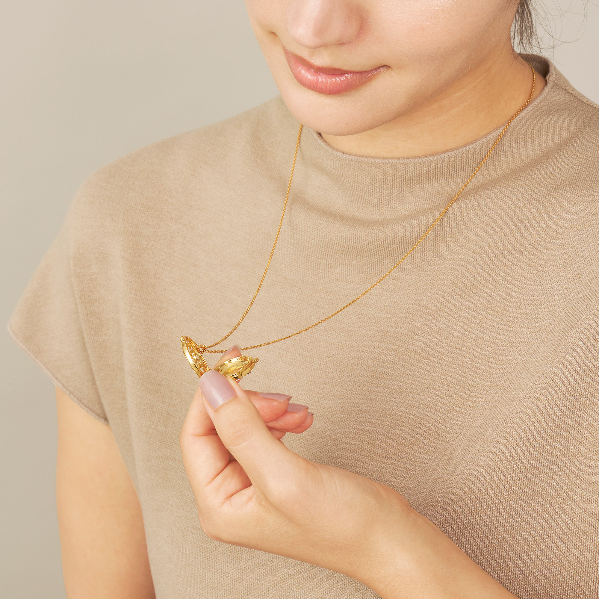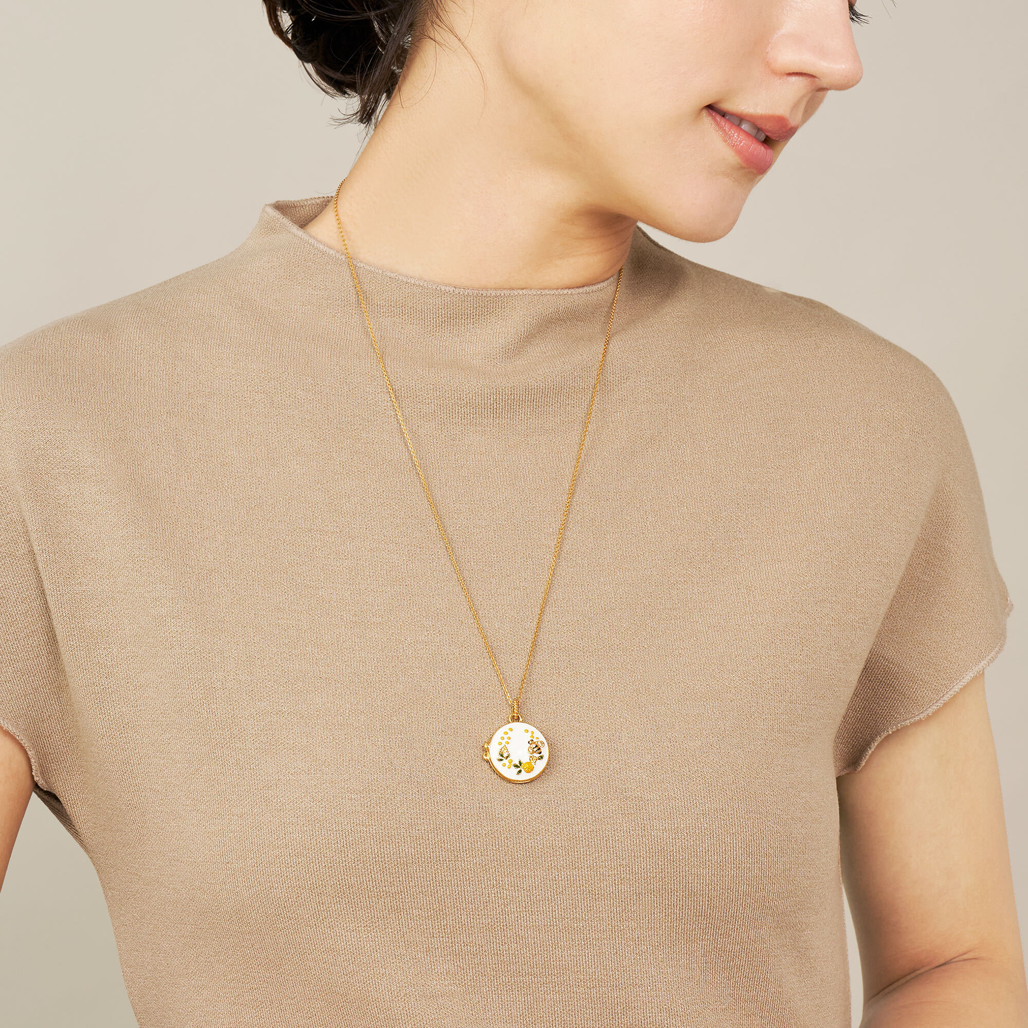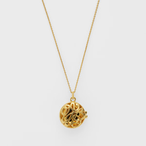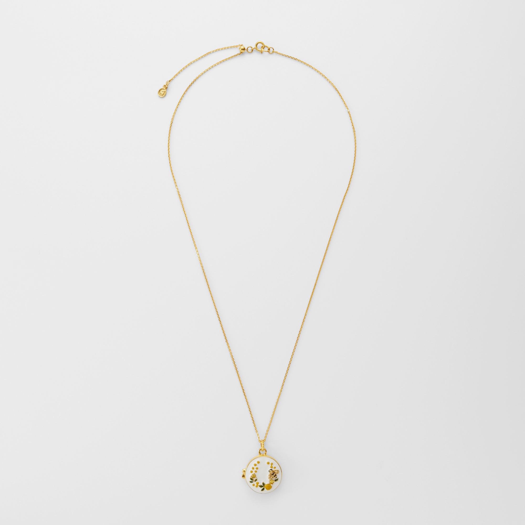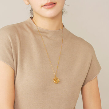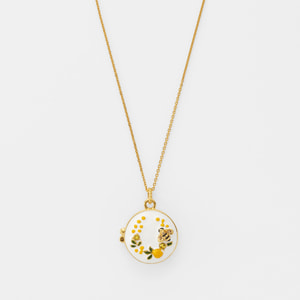 ミモザの花言葉は「感謝」「優雅」「思いやり」。馬蹄型に咲いたミモザの形と相まって、幸せが宿るロケットネックレスです。