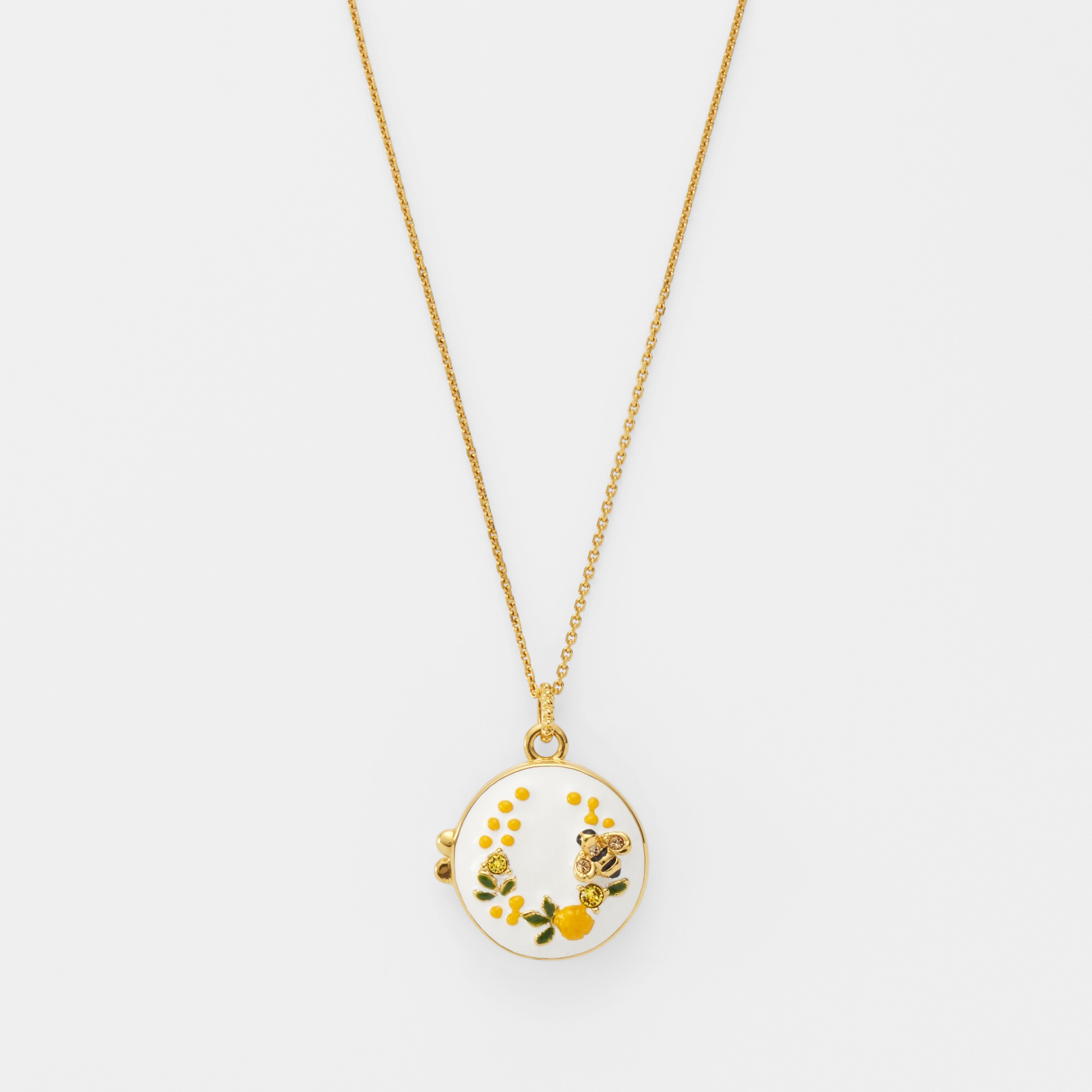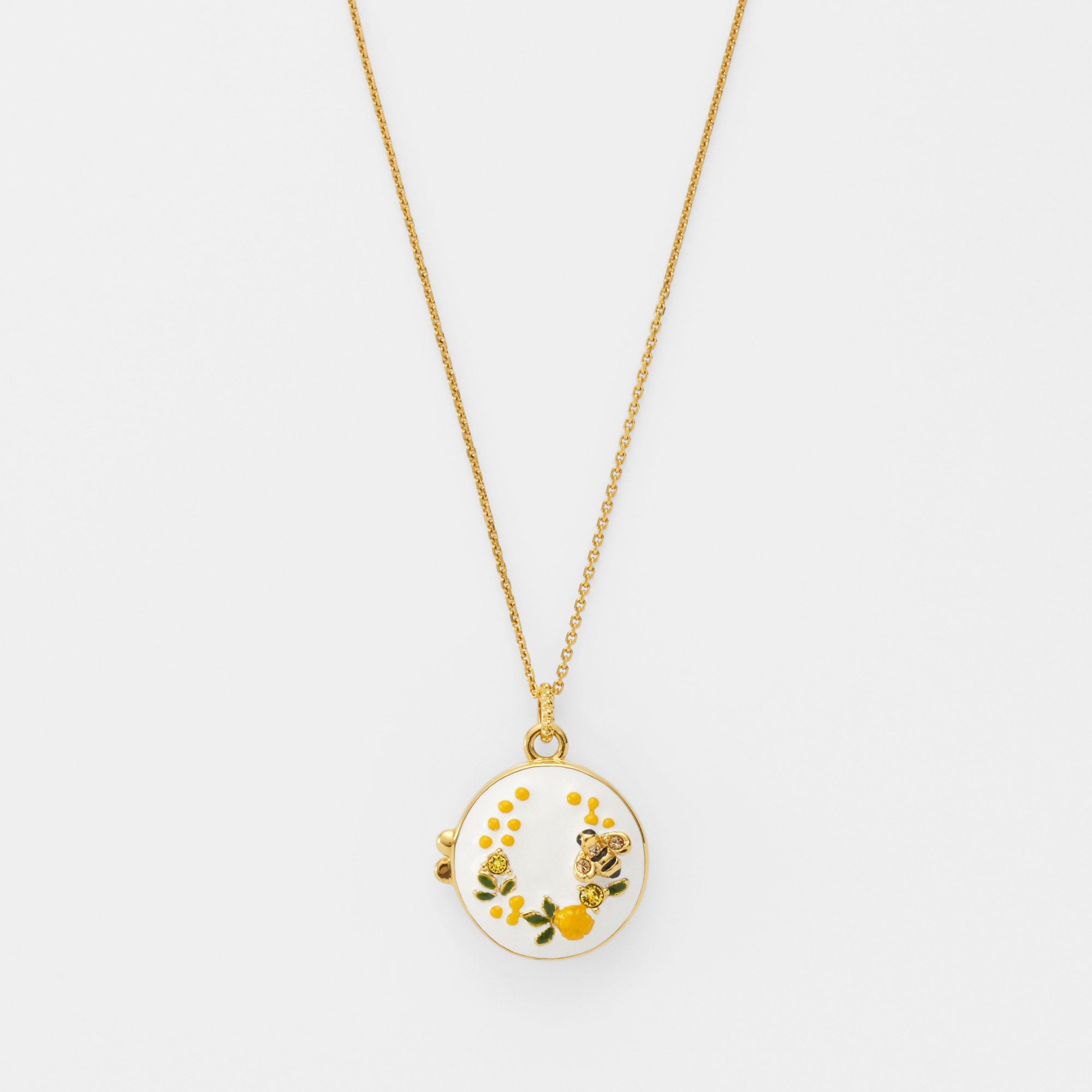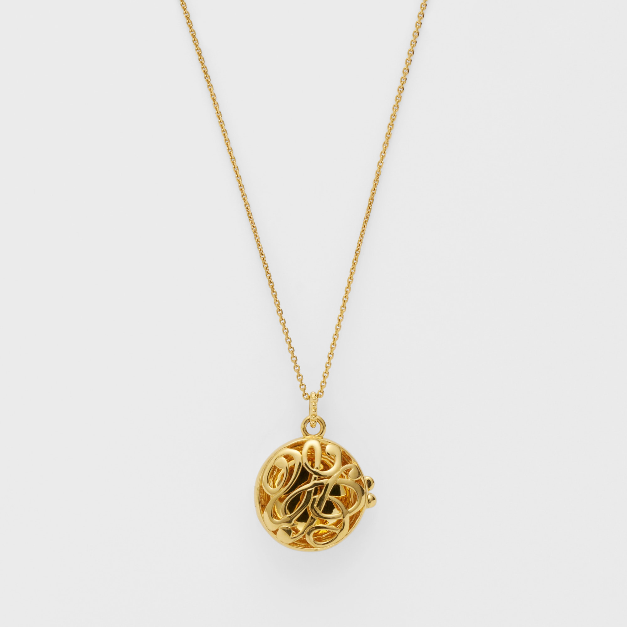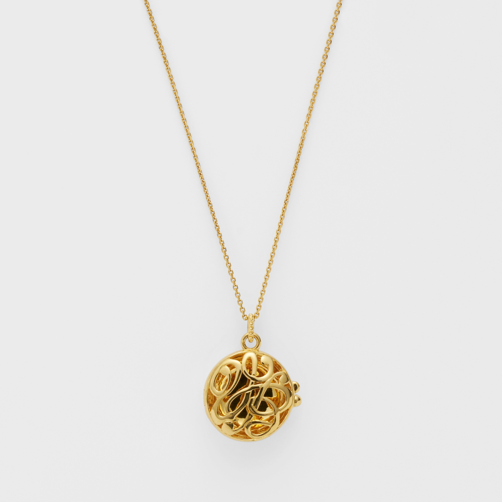 ミモザの花言葉は「感謝」「優雅」「思いやり」。馬蹄型に咲いたミモザの形と相まって、幸せが宿るロケットネックレスです。