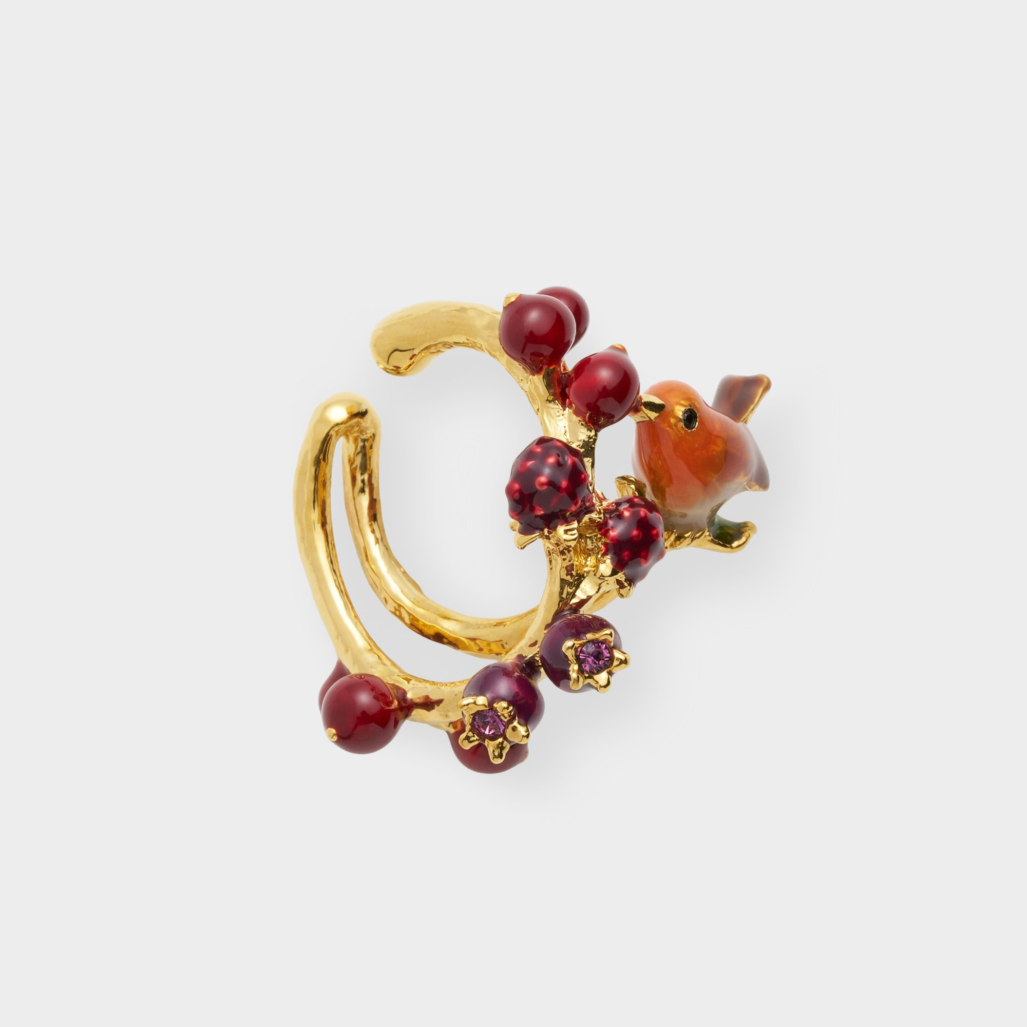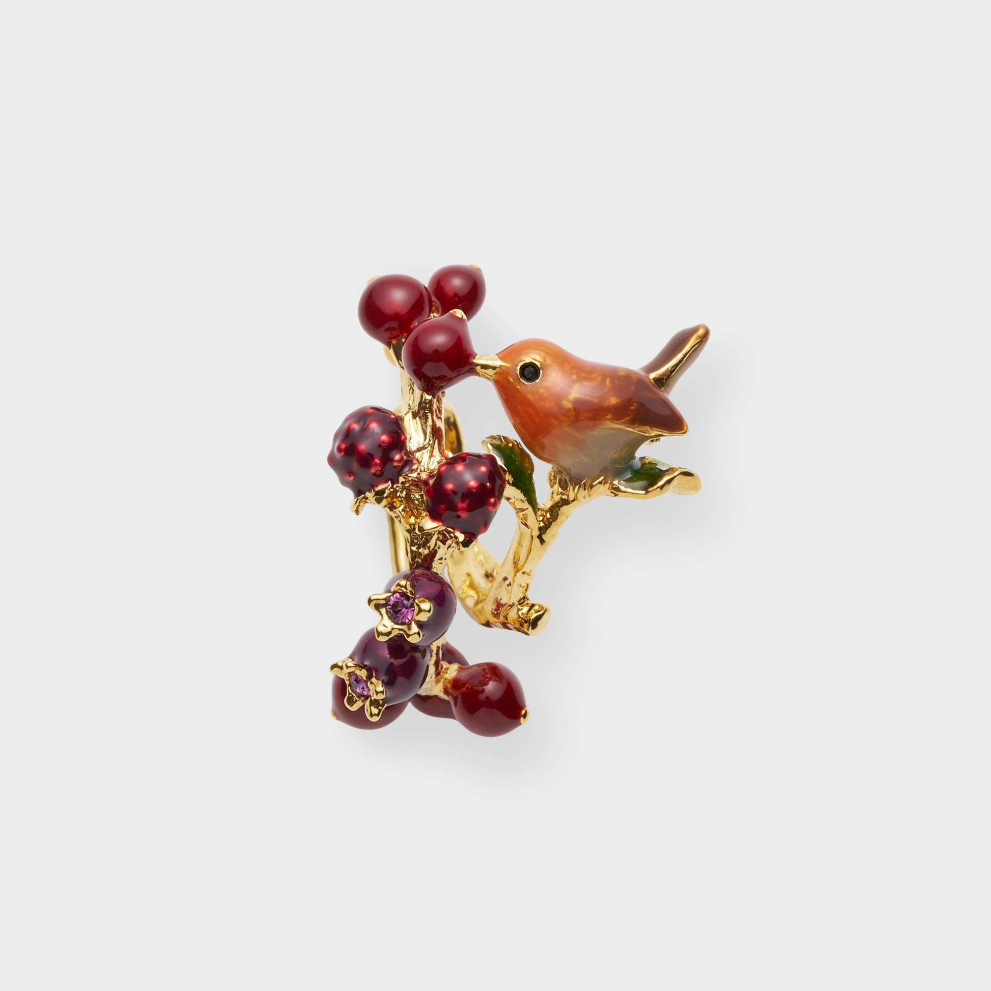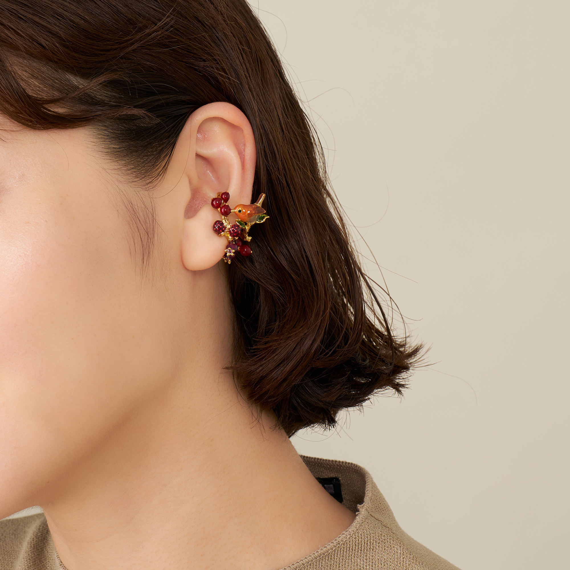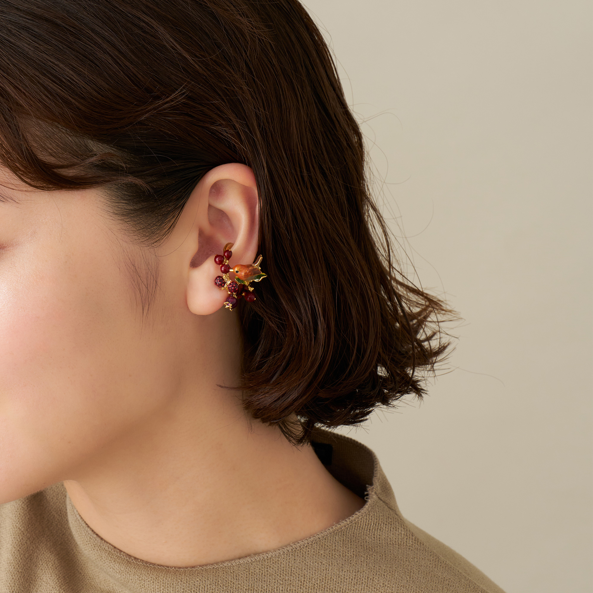ラズベリー・レッドカラント・ブルーベリー、3つのジューシーなベリーにさそわれてやって来たコマドリが、耳元にとまっているように見える愛らしいイヤーカフです。