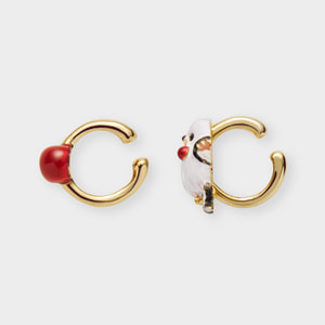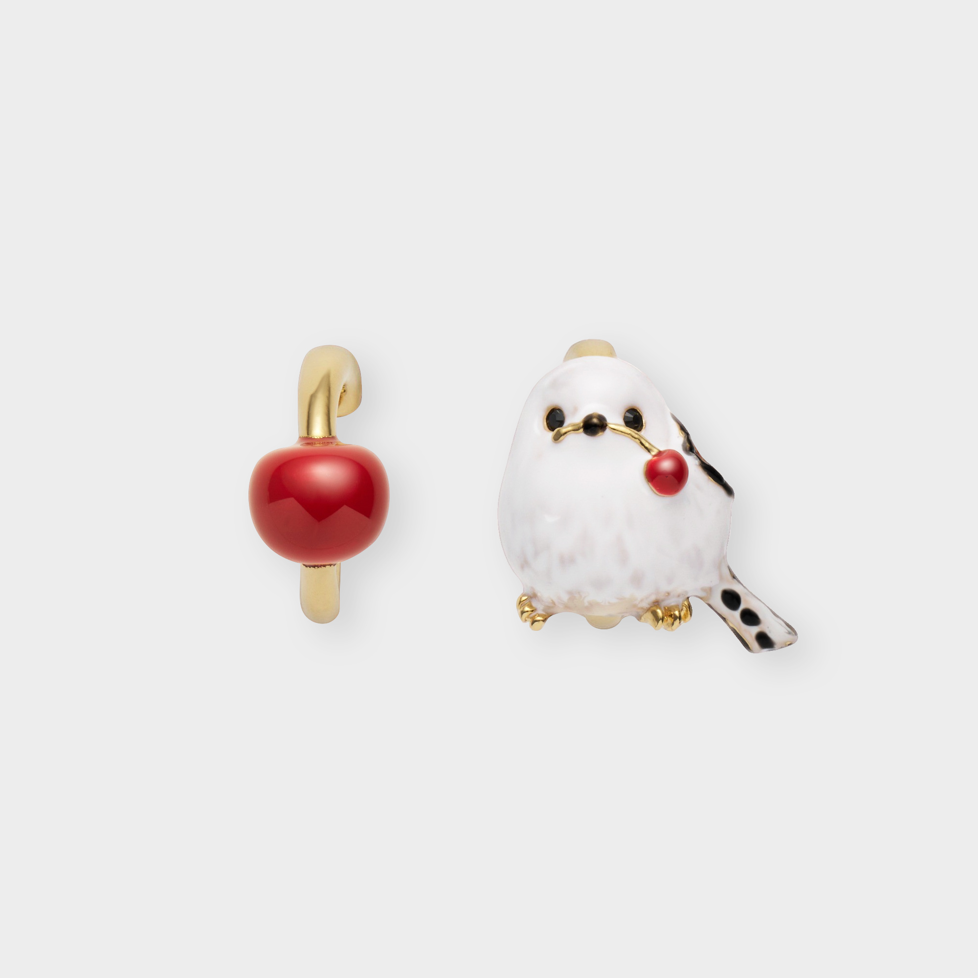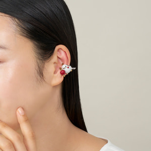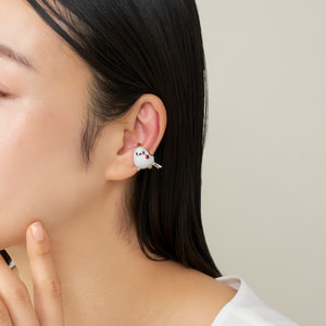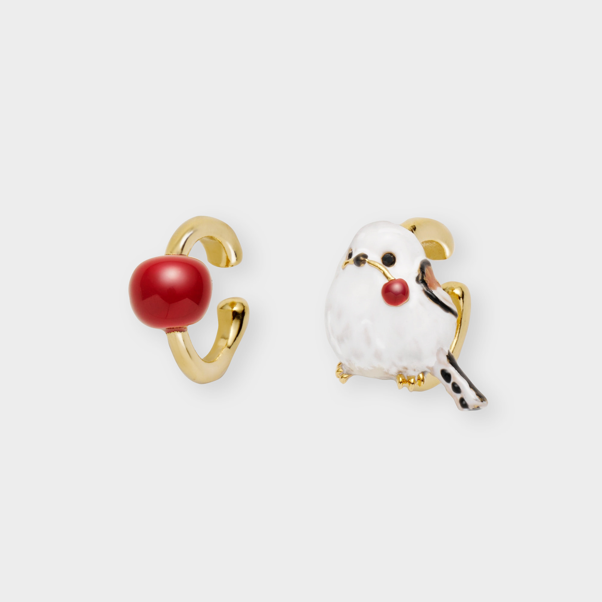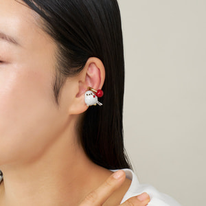 ふわふわの真っ白い羽毛にまん丸シルエットが愛らしいシマエナガと瑞々しい赤い実を組み合わせた、2点セットのイヤーカフ。