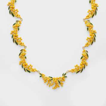 職人が一点一点、丁寧に色付けして仕上げしたミモザは、まるで本物の花をデコルテにまとっているような可憐なデザイン。