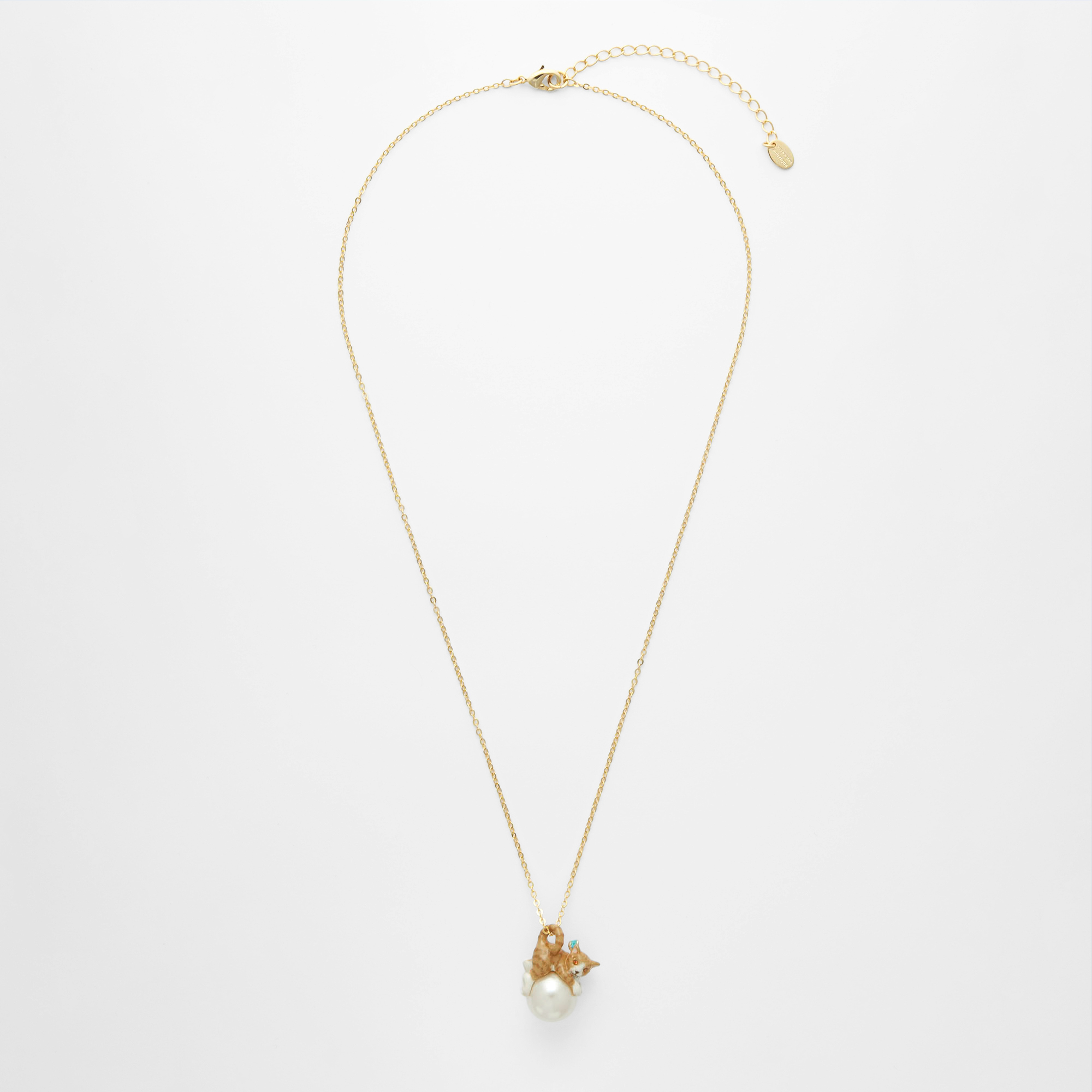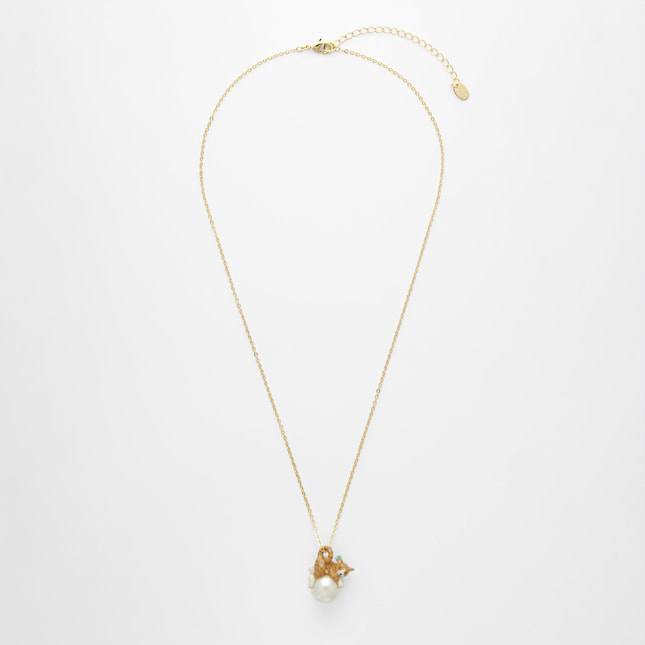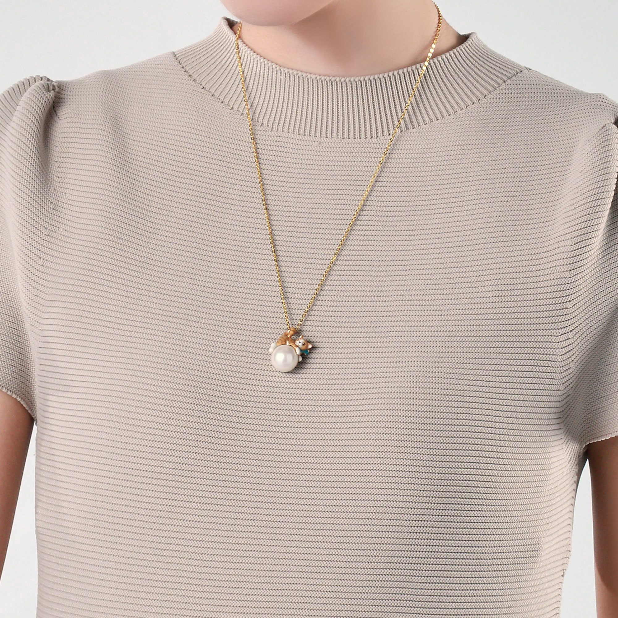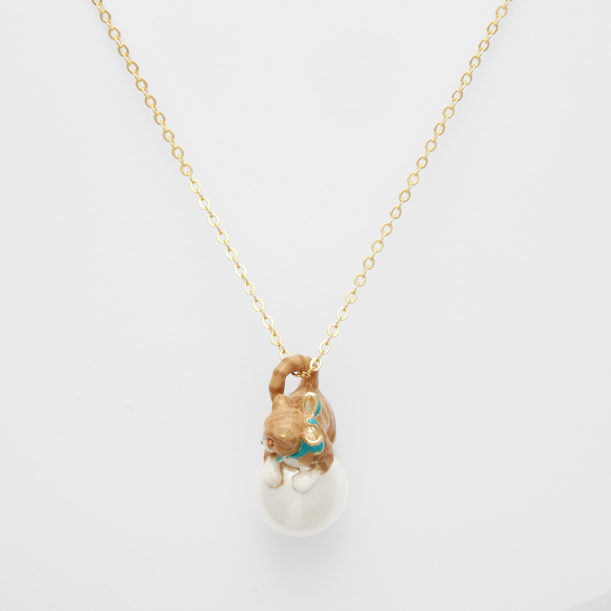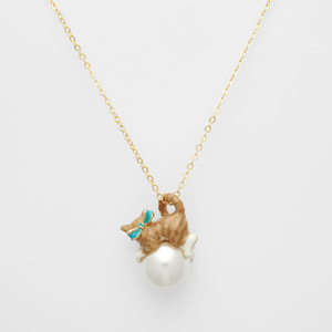 ドイツ・シュニール織のブランド「FEILER(フェイラー)」とのコラボレーションアイテム。猫たちが気ままに毛糸玉とじゃれている姿をデザインしたヴァンドームブティックオリジナルのフェイラー製ハンカチと、オリジナリティー溢れるアクセサリーとのスペシャルなセットです。明るいブラウンカラーの縞模様の茶トラ猫。生姜の色に似ているため英語では「ジンジャーキャット」と言われます。熟練した職人によって一つ一つ手作業で描かれた茶トラ模様に水色のリボンがキュートです。ボールに戯れる子猫らしい姿をネックレスにしました。躍動感のある尻尾に直接チェーンが通っているのもこだわりポイント。大切な方へのギフトにもぴったりです。パールは、廃材をアップサイクルした「再生プラスティックパール」を使用しています。 ▼ FEILER Collection <LOVELY DOGS Vol.01> はこちらhttps://vendome.jp/vendome_boutique/feature/boutique_feiler2 ▼ FEILER Collection <LOVELY DOGS Vol.02> はこちらhttps://vendome.jp/vendome_boutique/feature/boutique_feiler3 ▼ FEILER Collection <PLAYING CATS> はこちらhttps://vendome.jp/vendome_boutique/feature/boutique_feiler